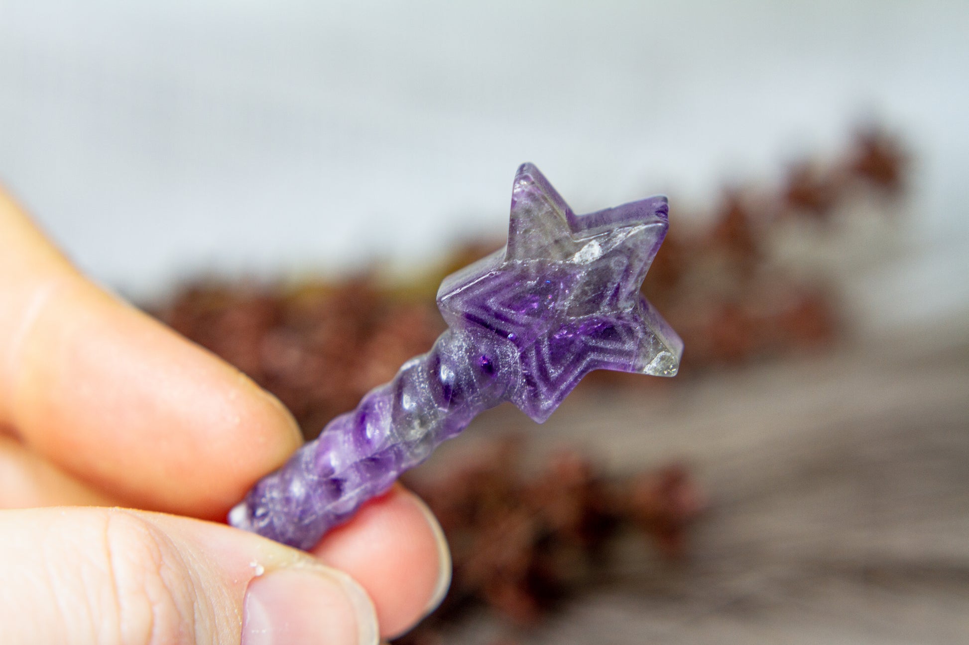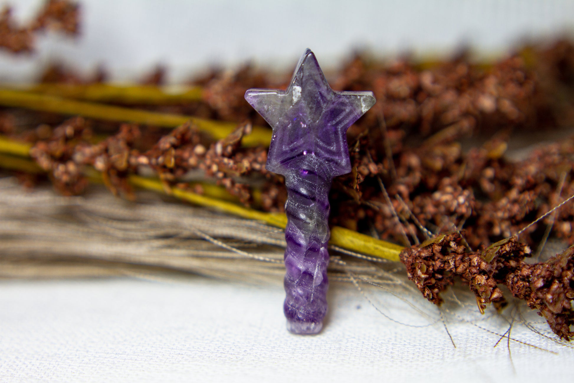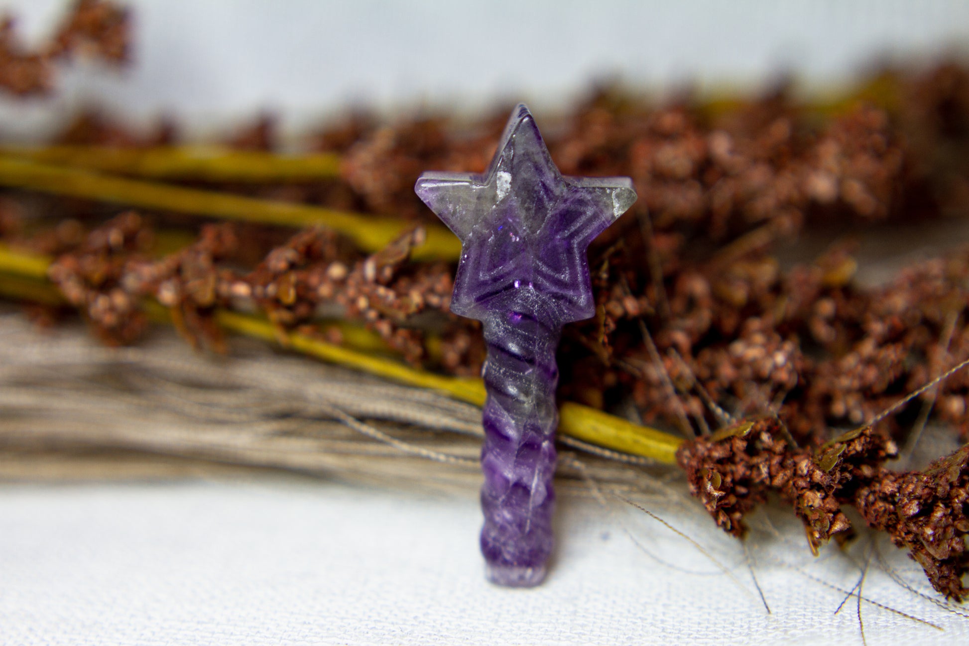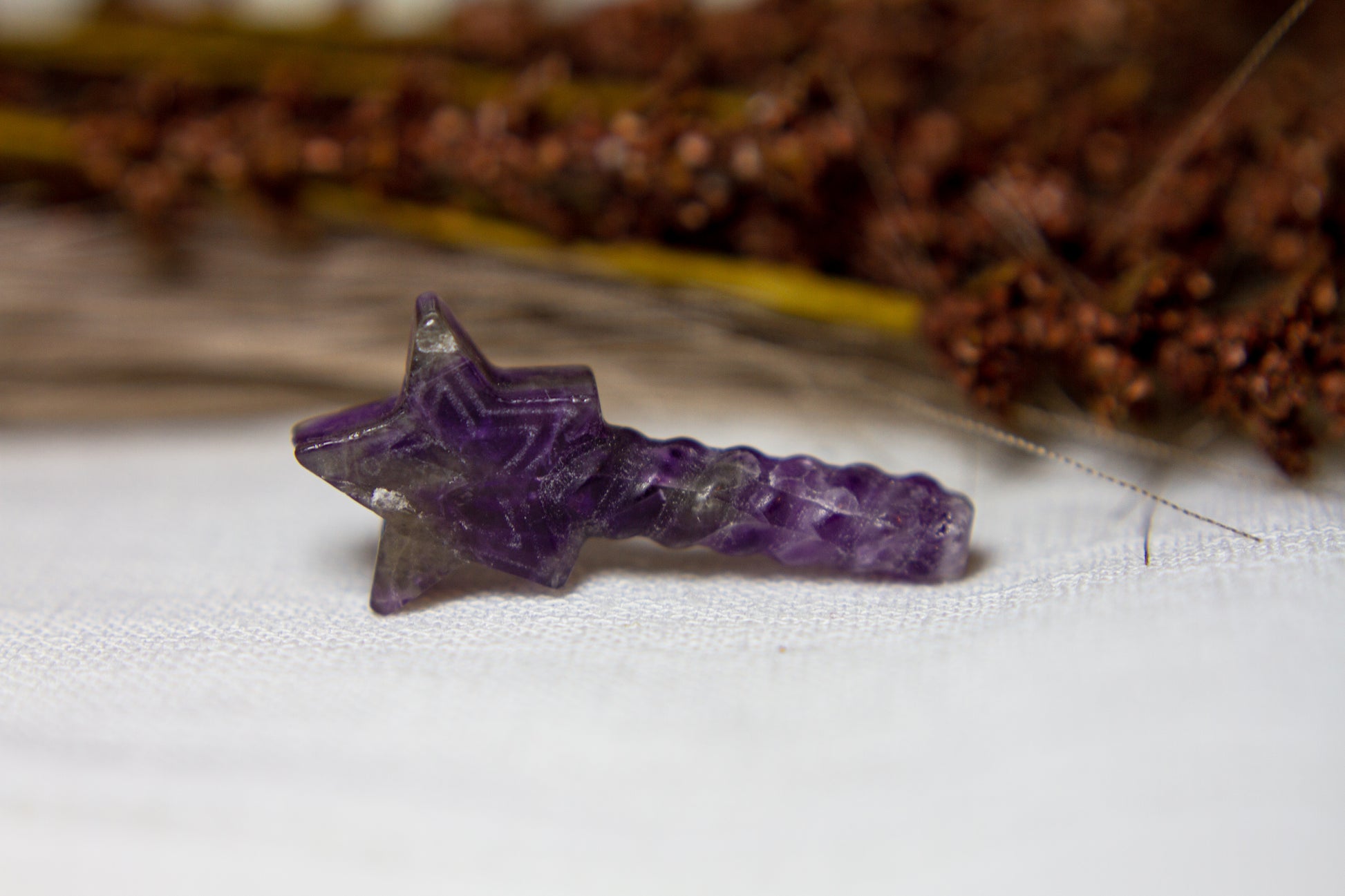 Här har vi en riktigt magis, färgskarp och gnistrande trollstav i kristallen ametist. Staven skimrar i sina färgstarka ametistnyanser och är ca 5cm hög! [Kristallen på bilderna är den som säljs]