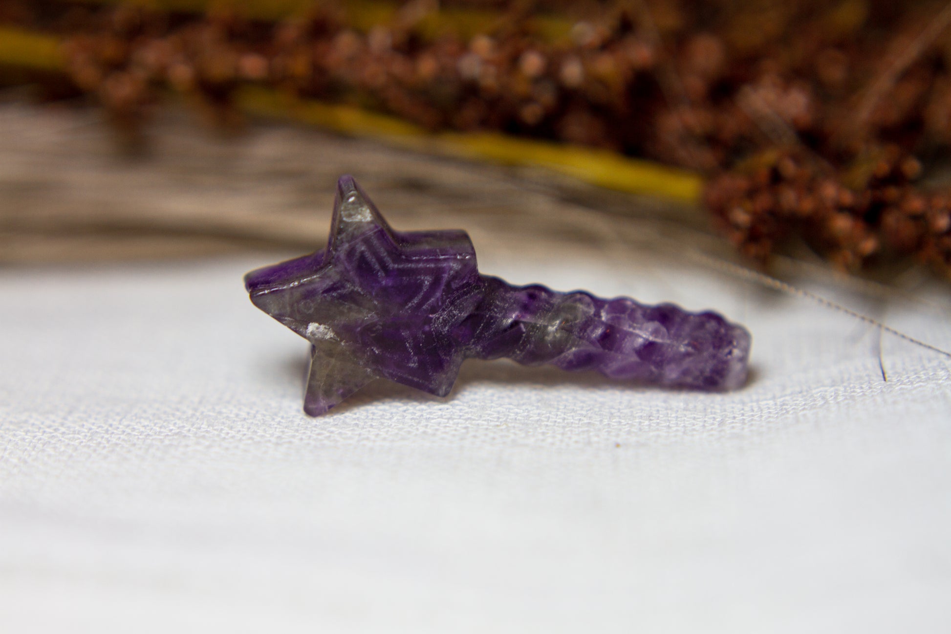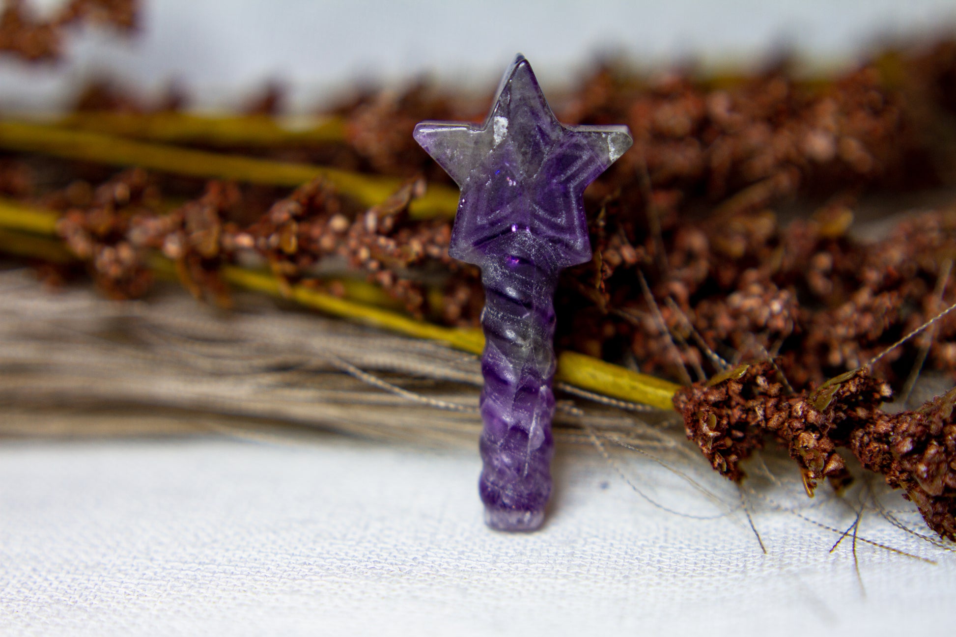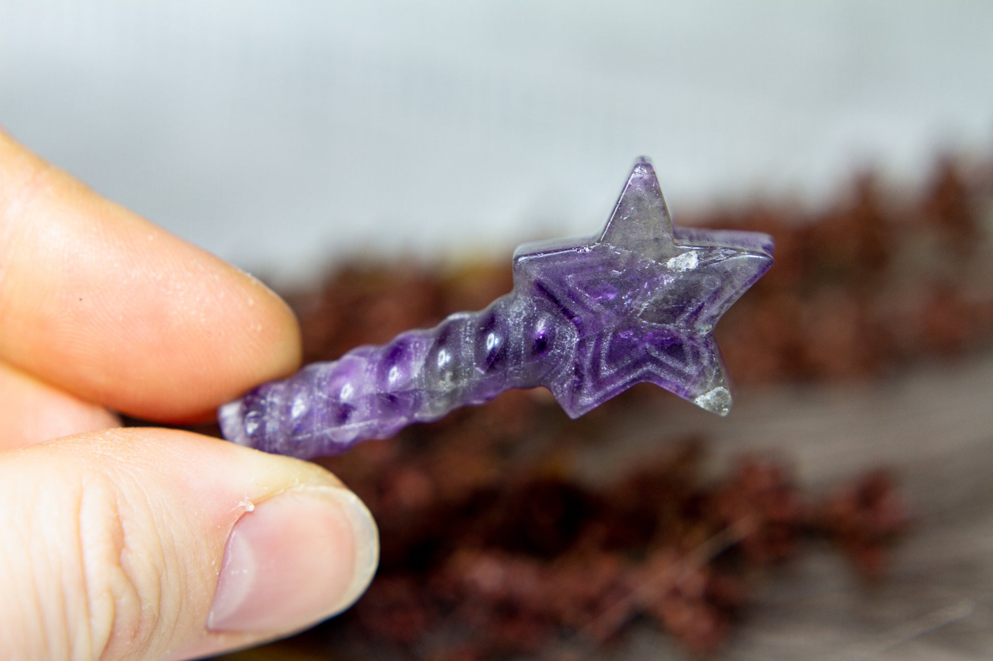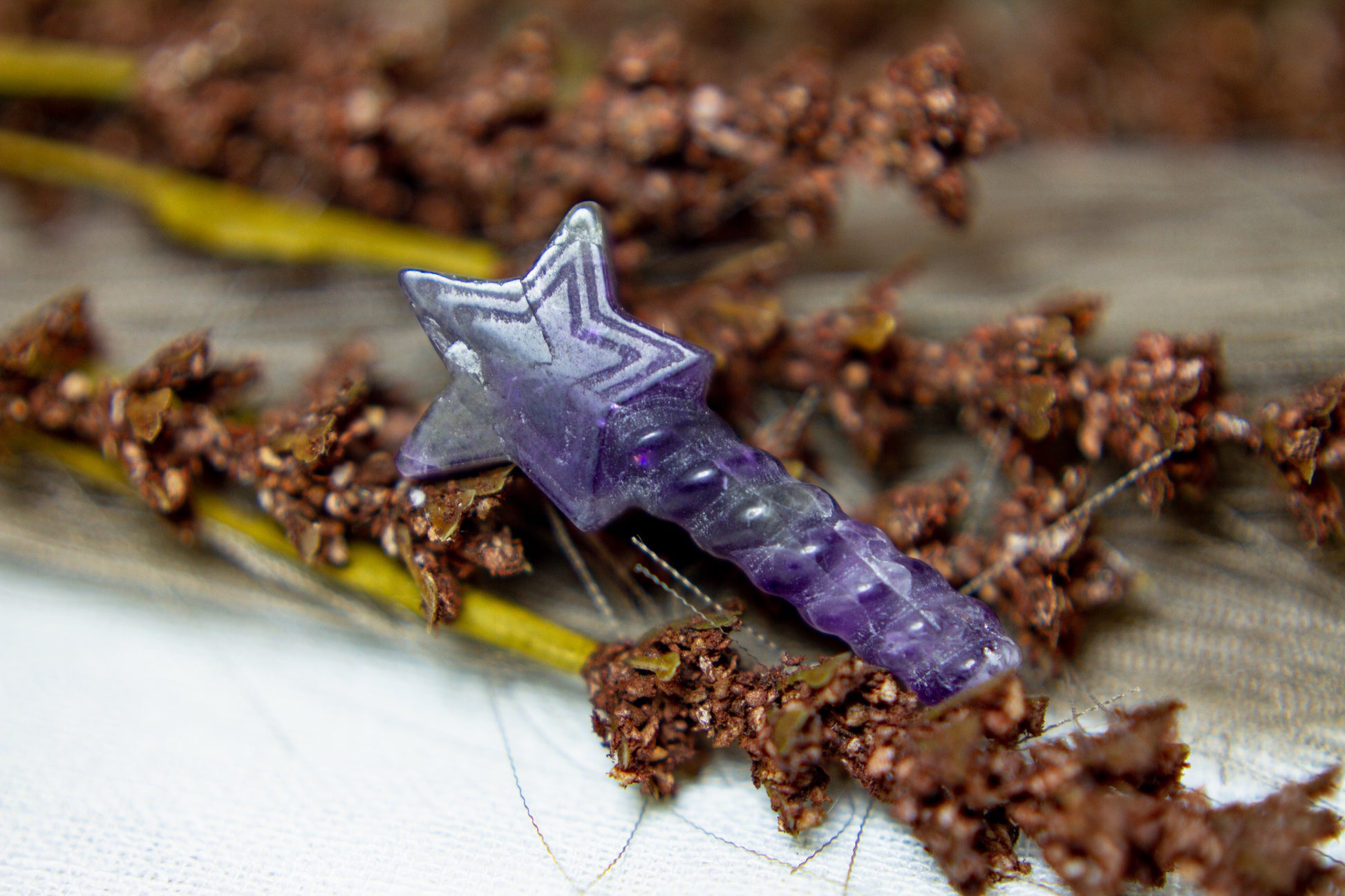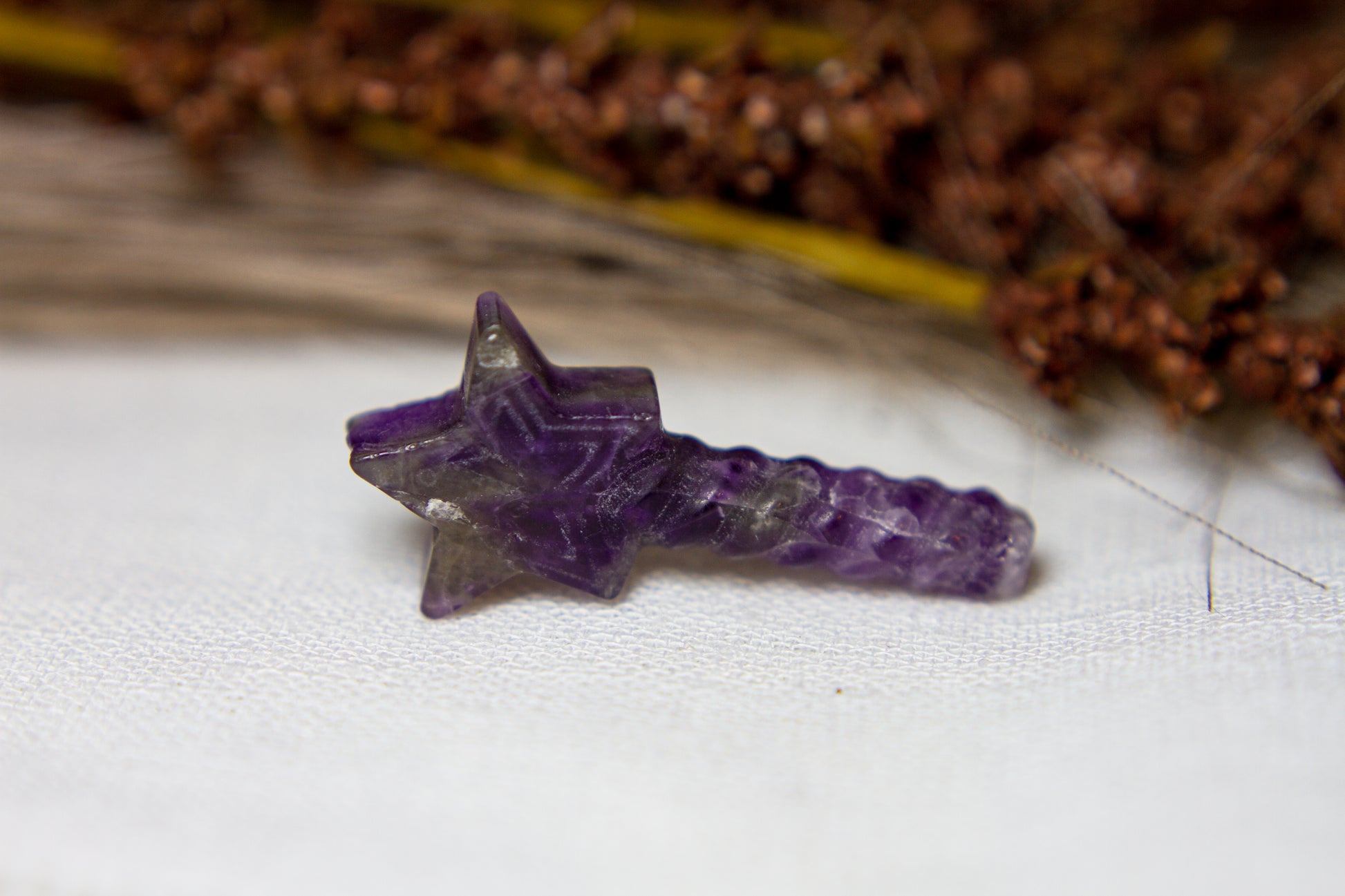 Här har vi en riktigt magis, färgskarp och gnistrande trollstav i kristallen ametist. Staven skimrar i sina färgstarka ametistnyanser och är ca 5cm hög! [Kristallen på bilderna är den som säljs]
