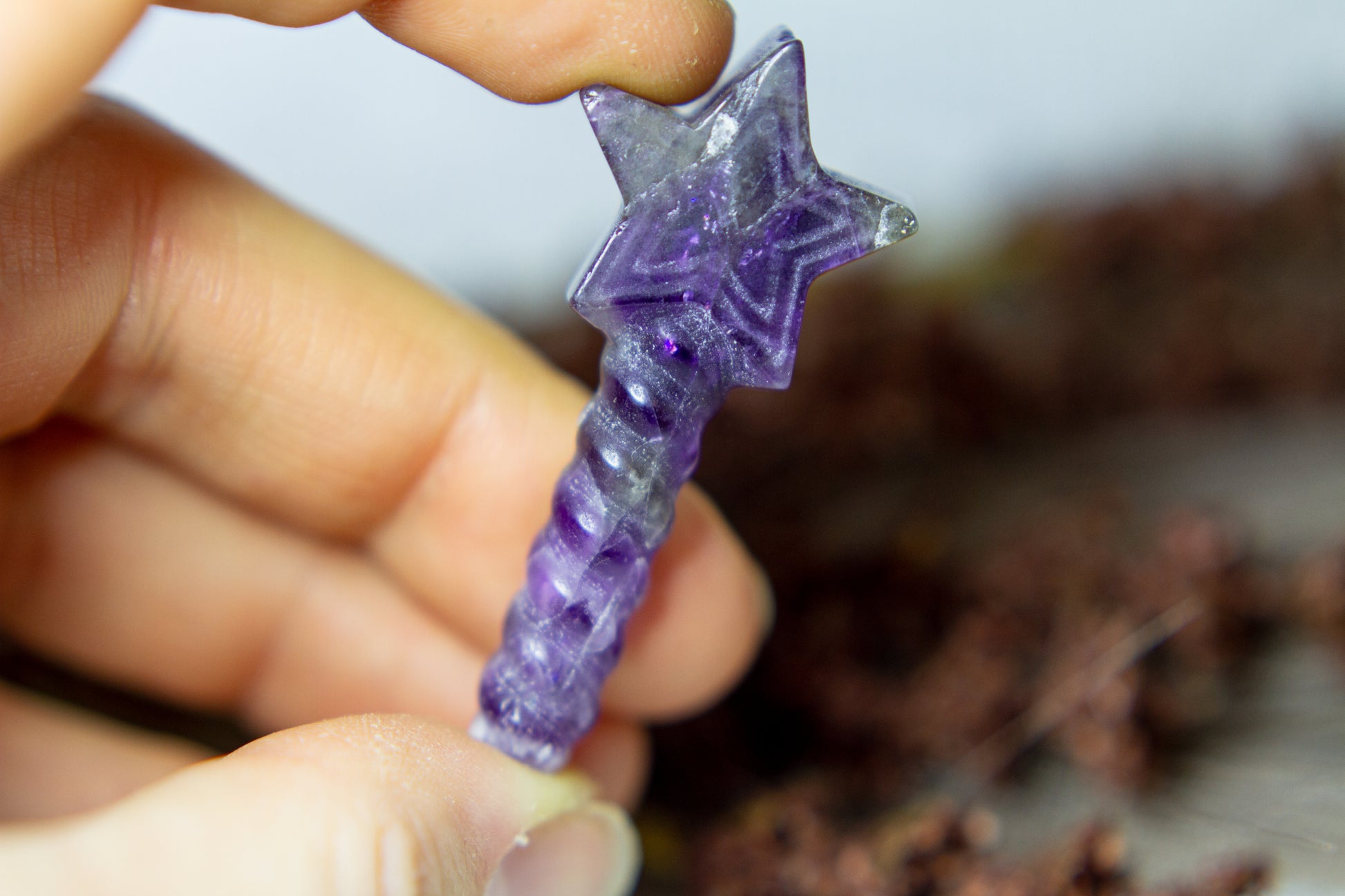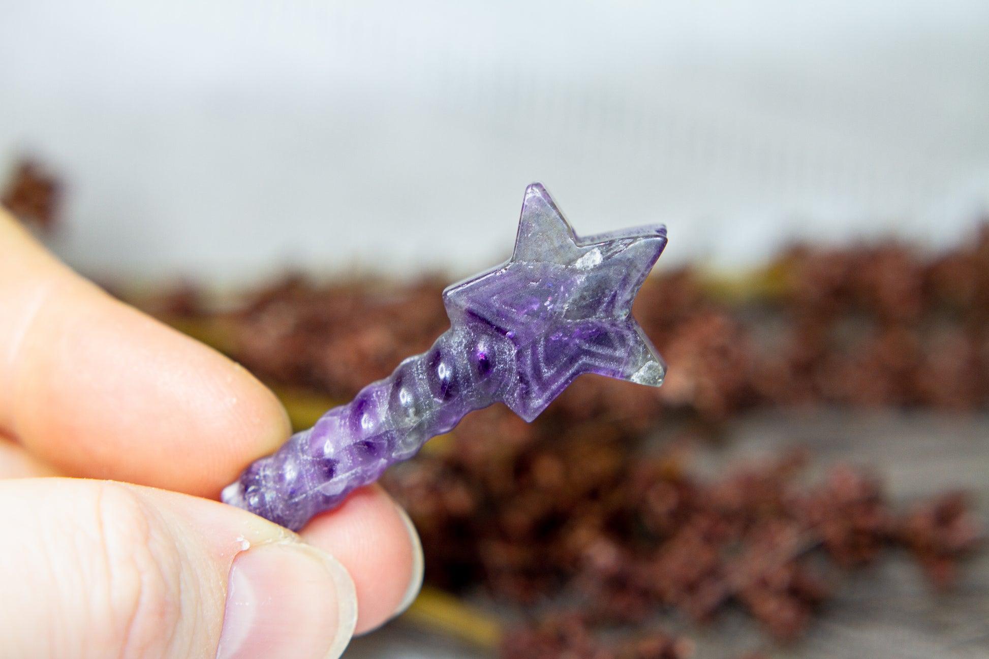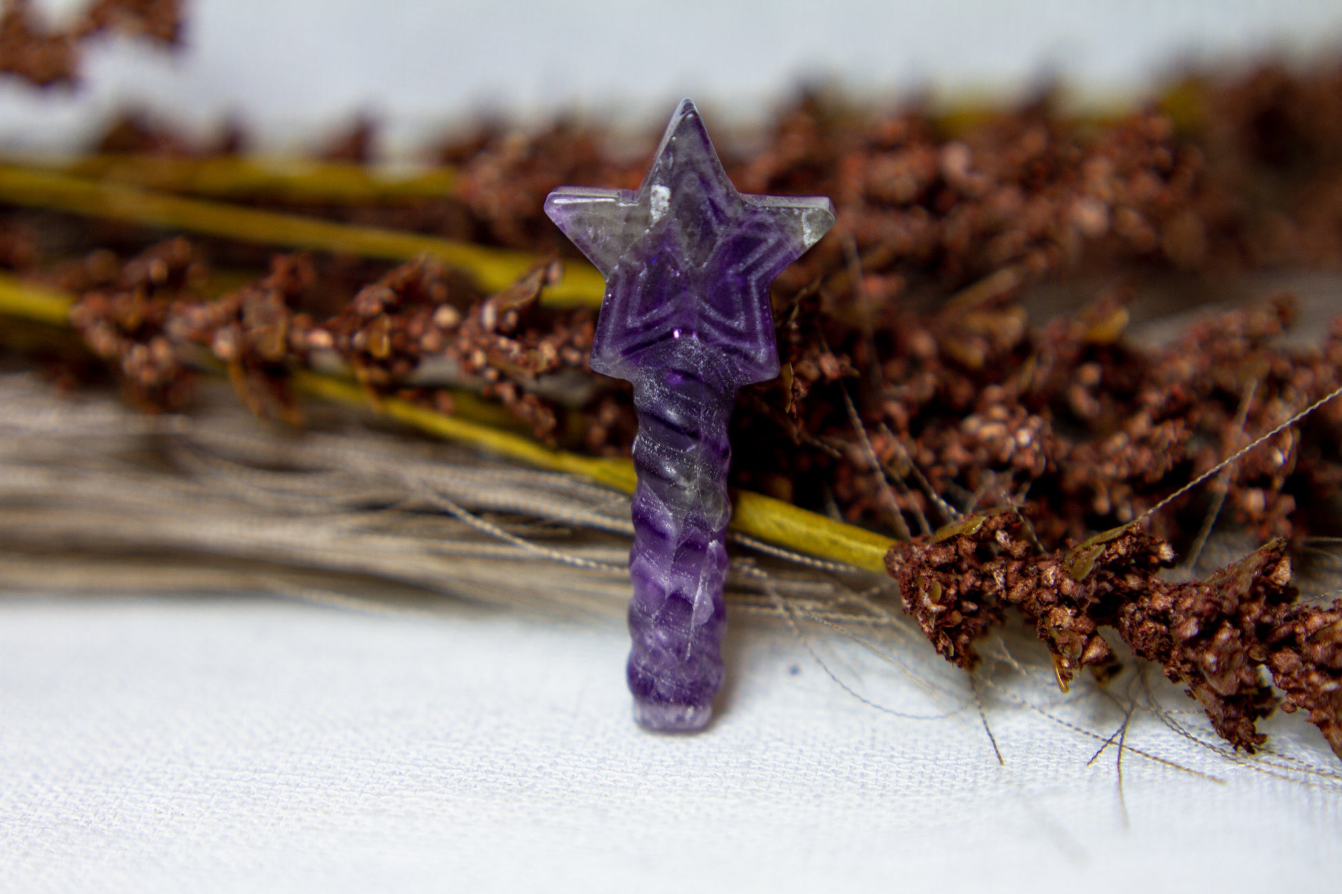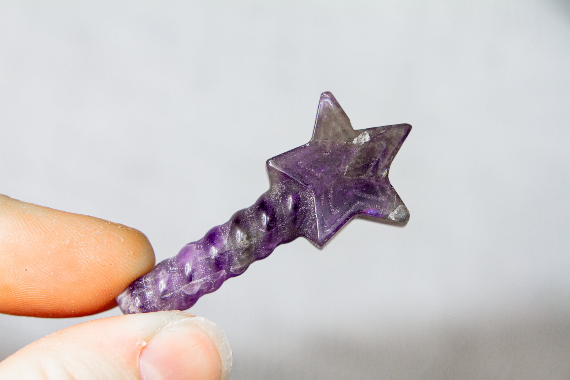 Här har vi en riktigt magis, färgskarp och gnistrande trollstav i kristallen ametist. Staven skimrar i sina färgstarka ametistnyanser och är ca 5cm hög! [Kristallen på bilderna är den som säljs]