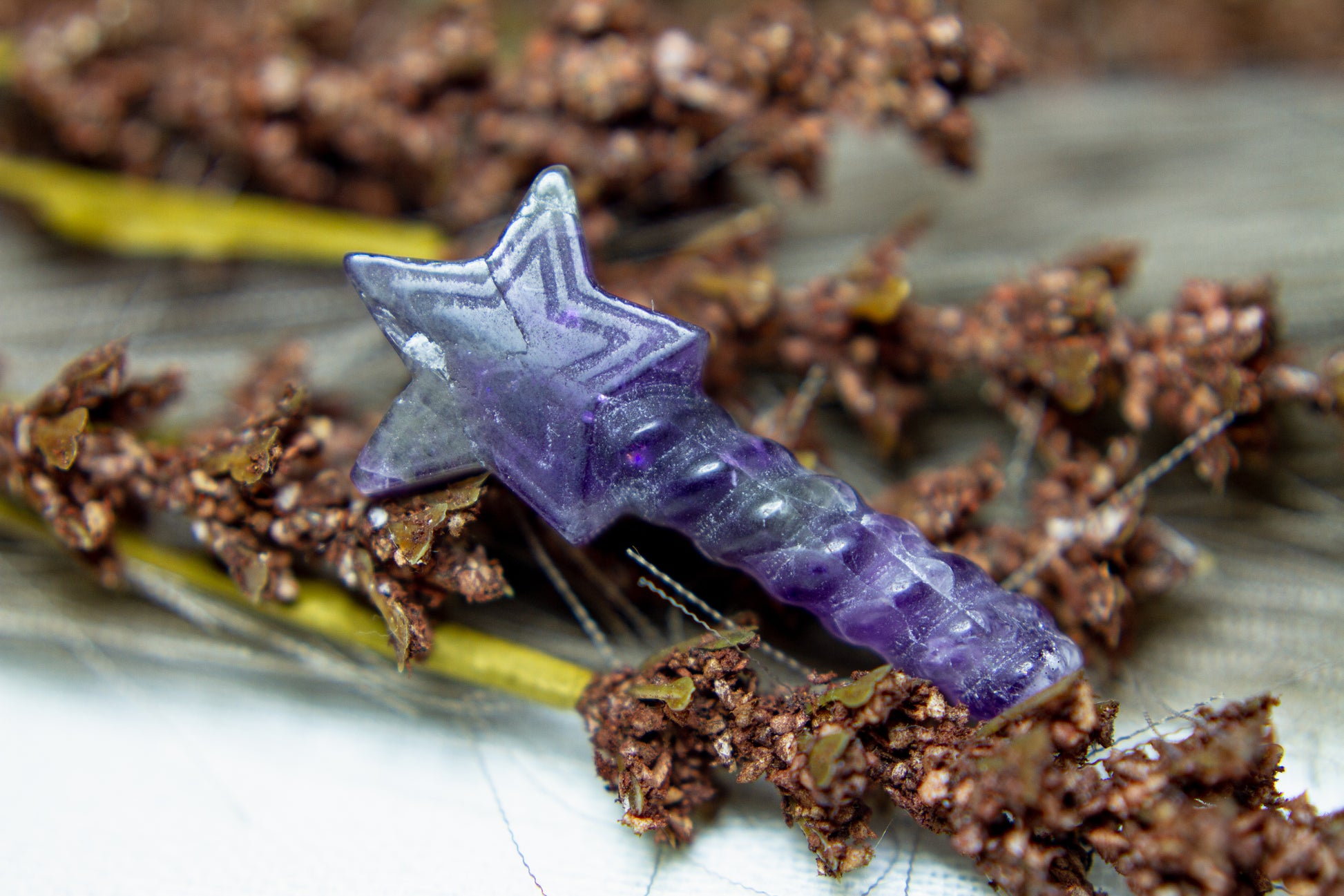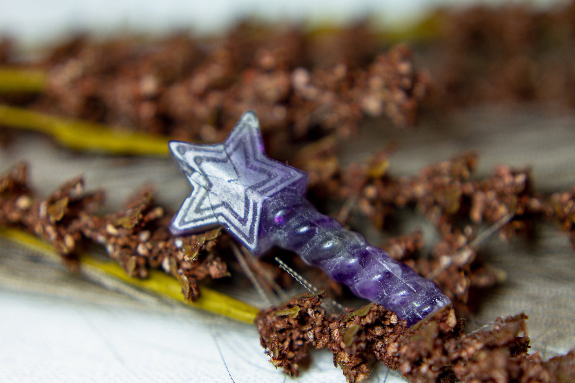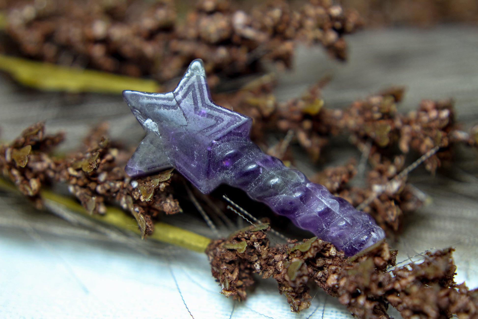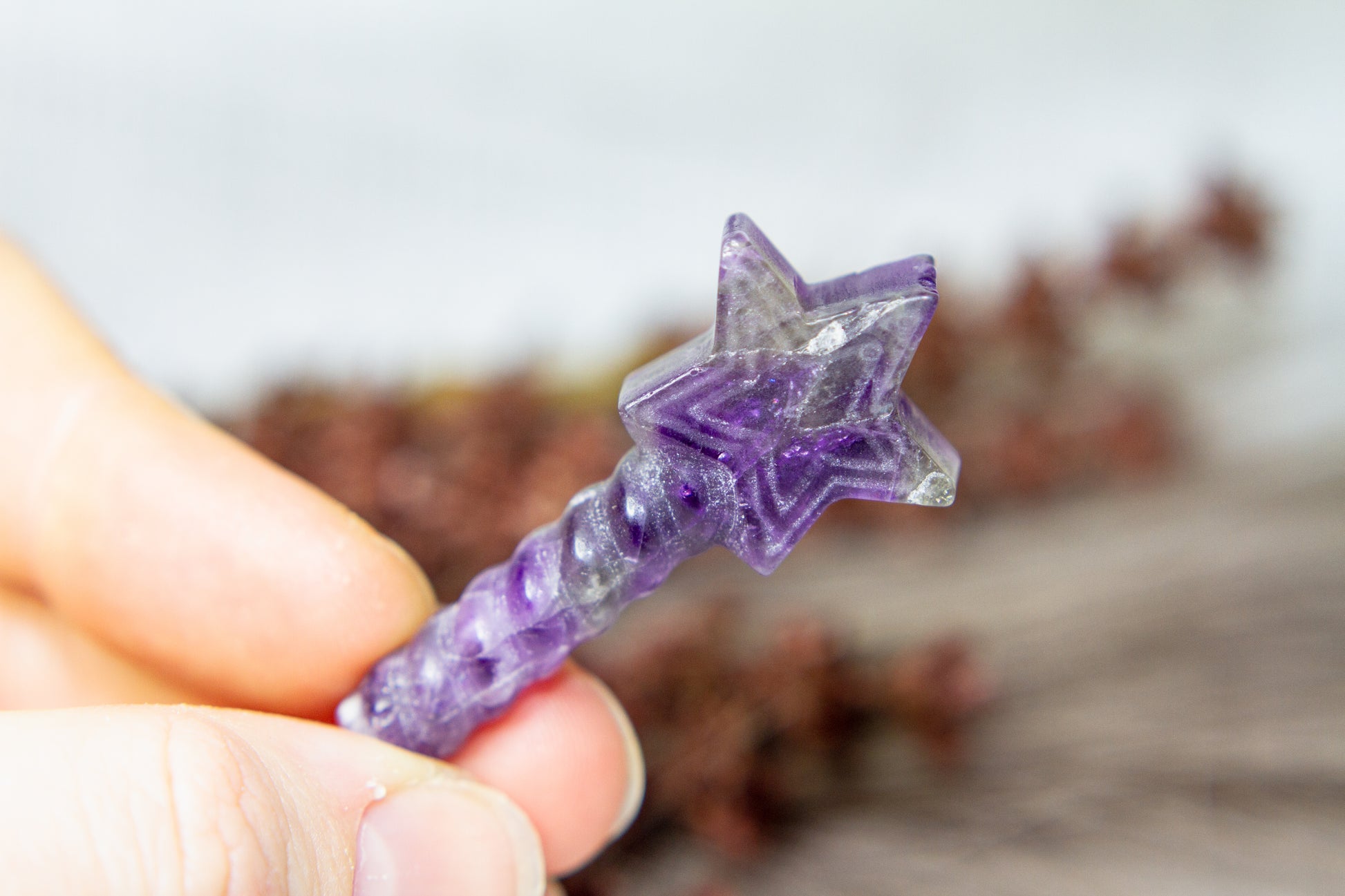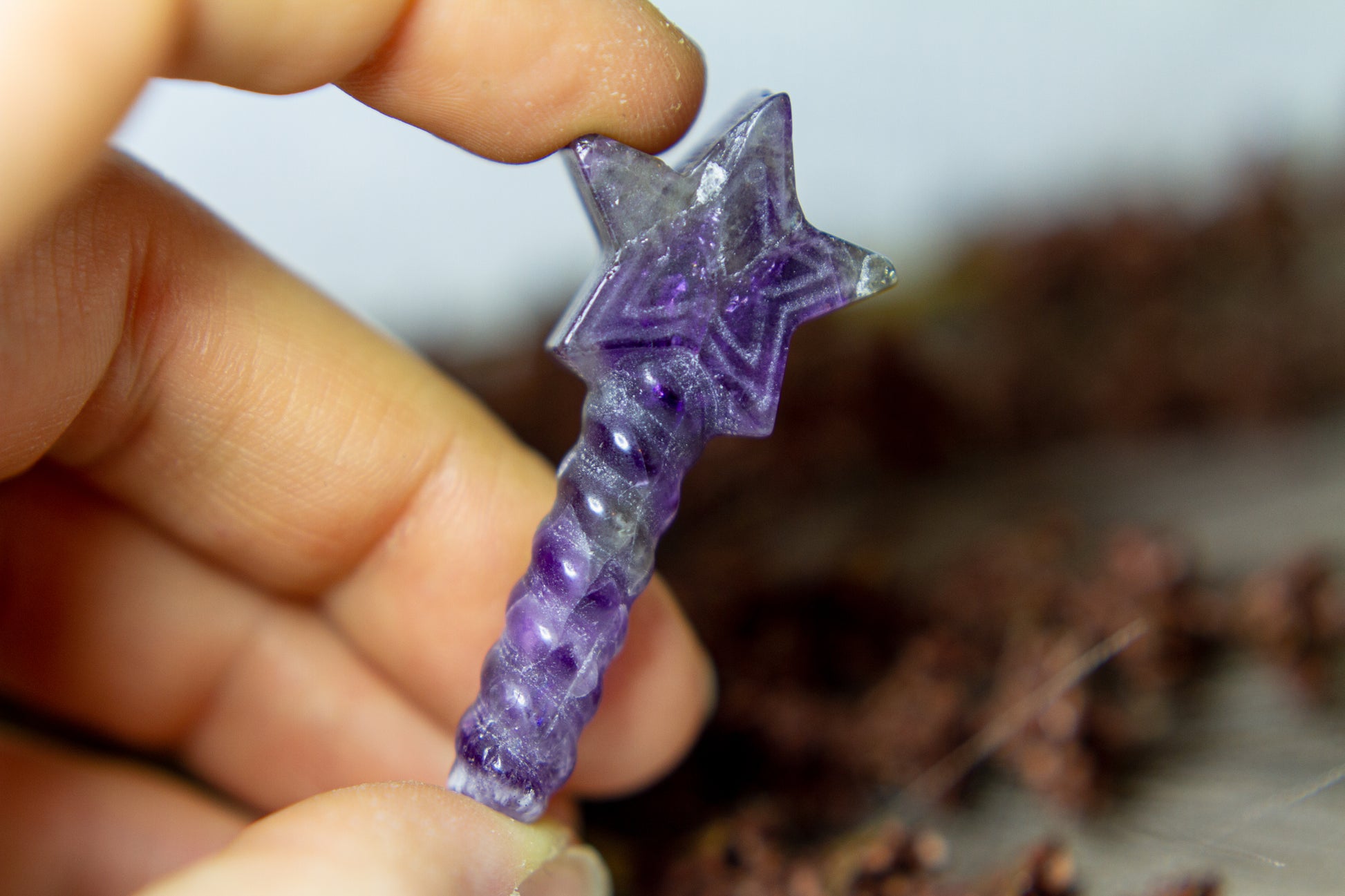 Här har vi en riktigt magis, färgskarp och gnistrande trollstav i kristallen ametist. Staven skimrar i sina färgstarka ametistnyanser och är ca 5cm hög! [Kristallen på bilderna är den som säljs]