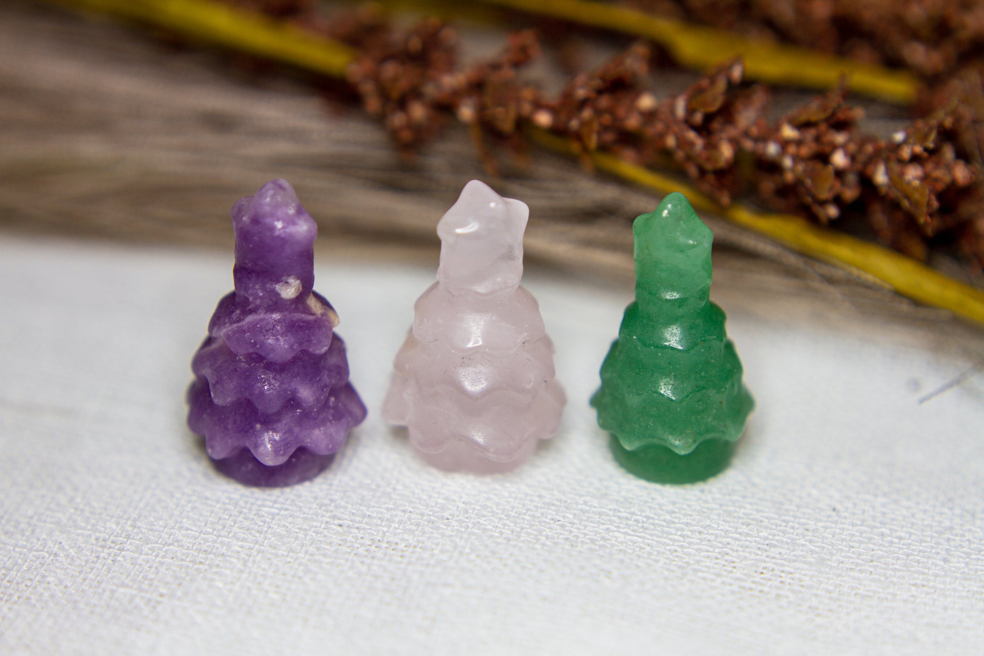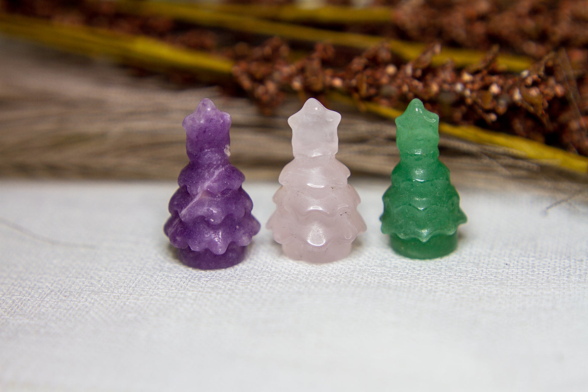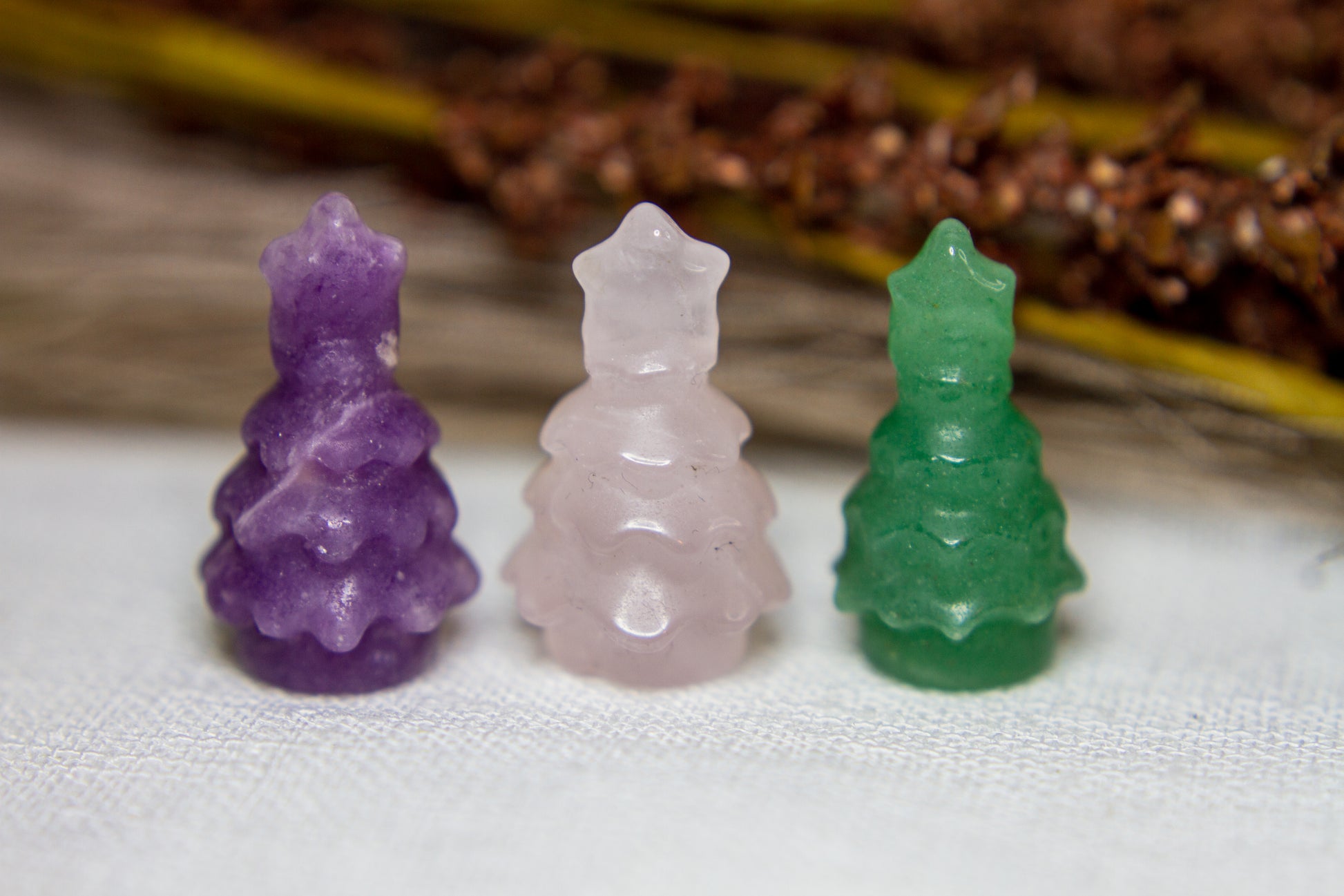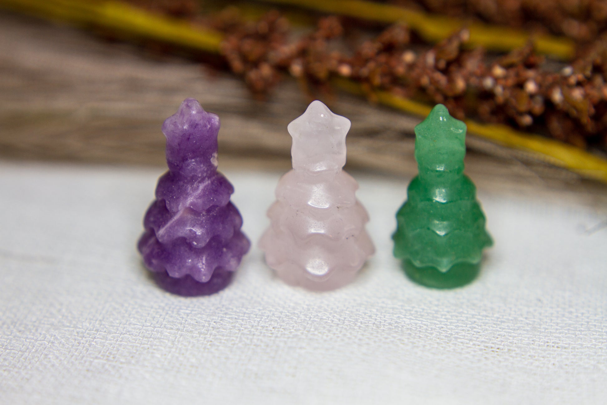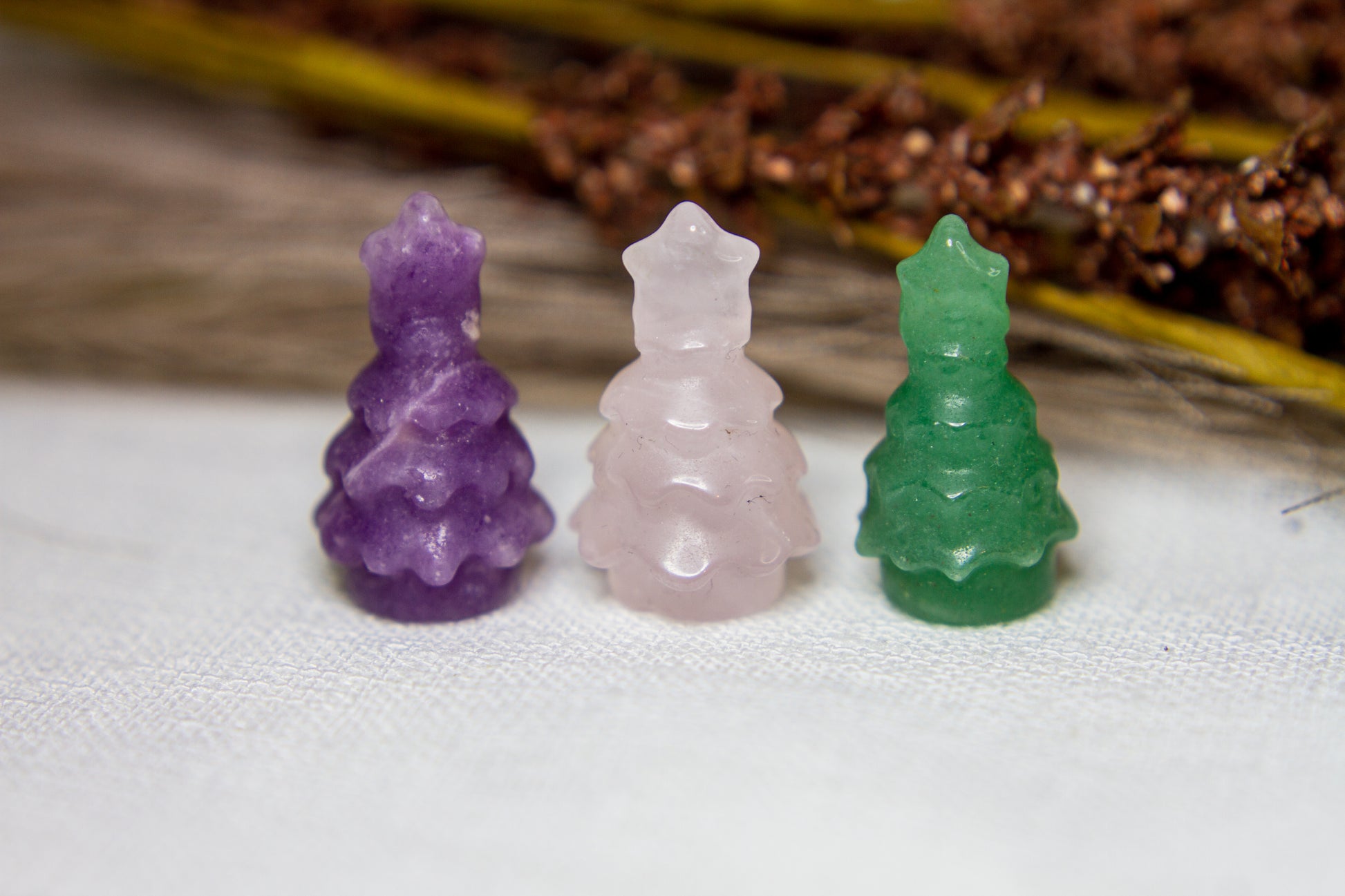 Otroligt fina, fĂ€rgskarpa och skinande julgranar i kristallerna lepidolit, rosenkvarts och grön aventurin. Granarna Ă€r riktigt charmiga med sina julgransstjĂ€rnor och varma fĂ€rger, och de Ă€r ca 3cm höga! â â