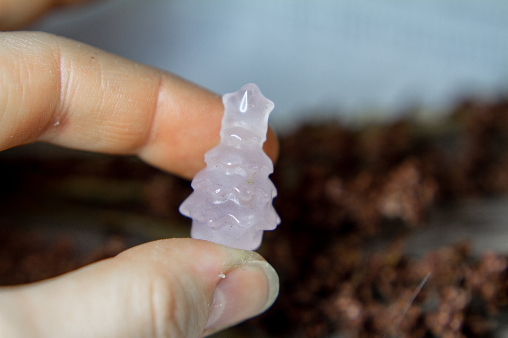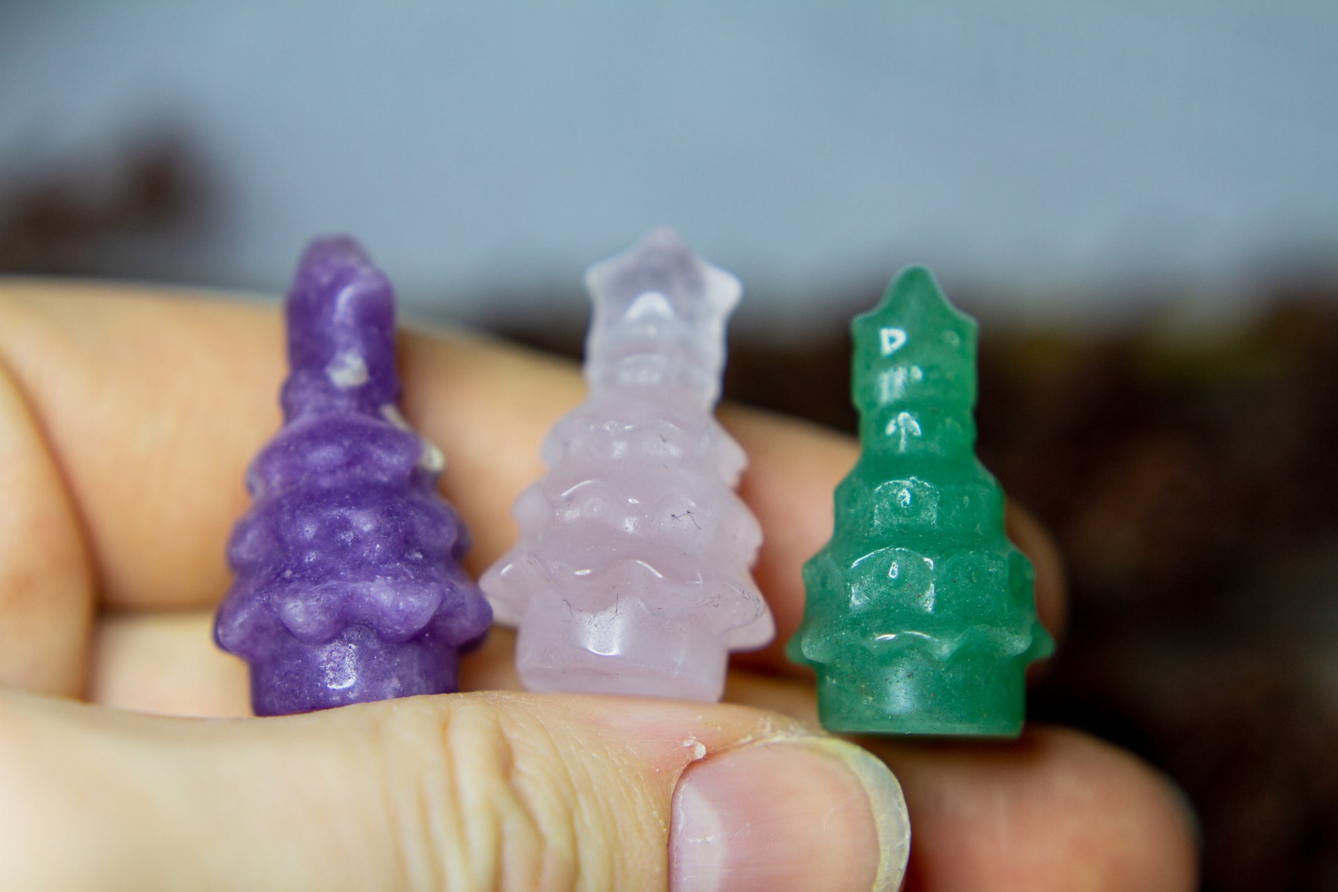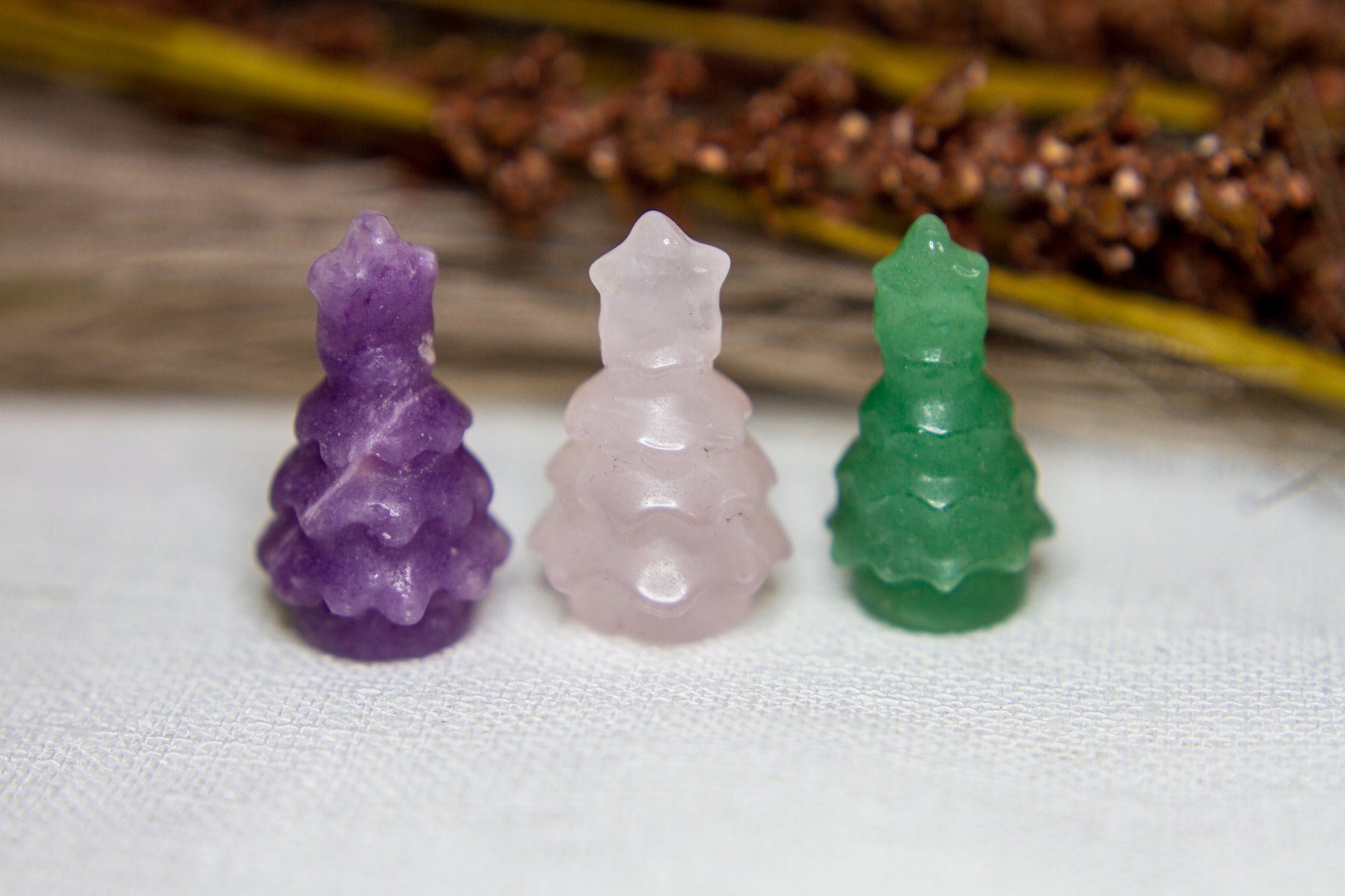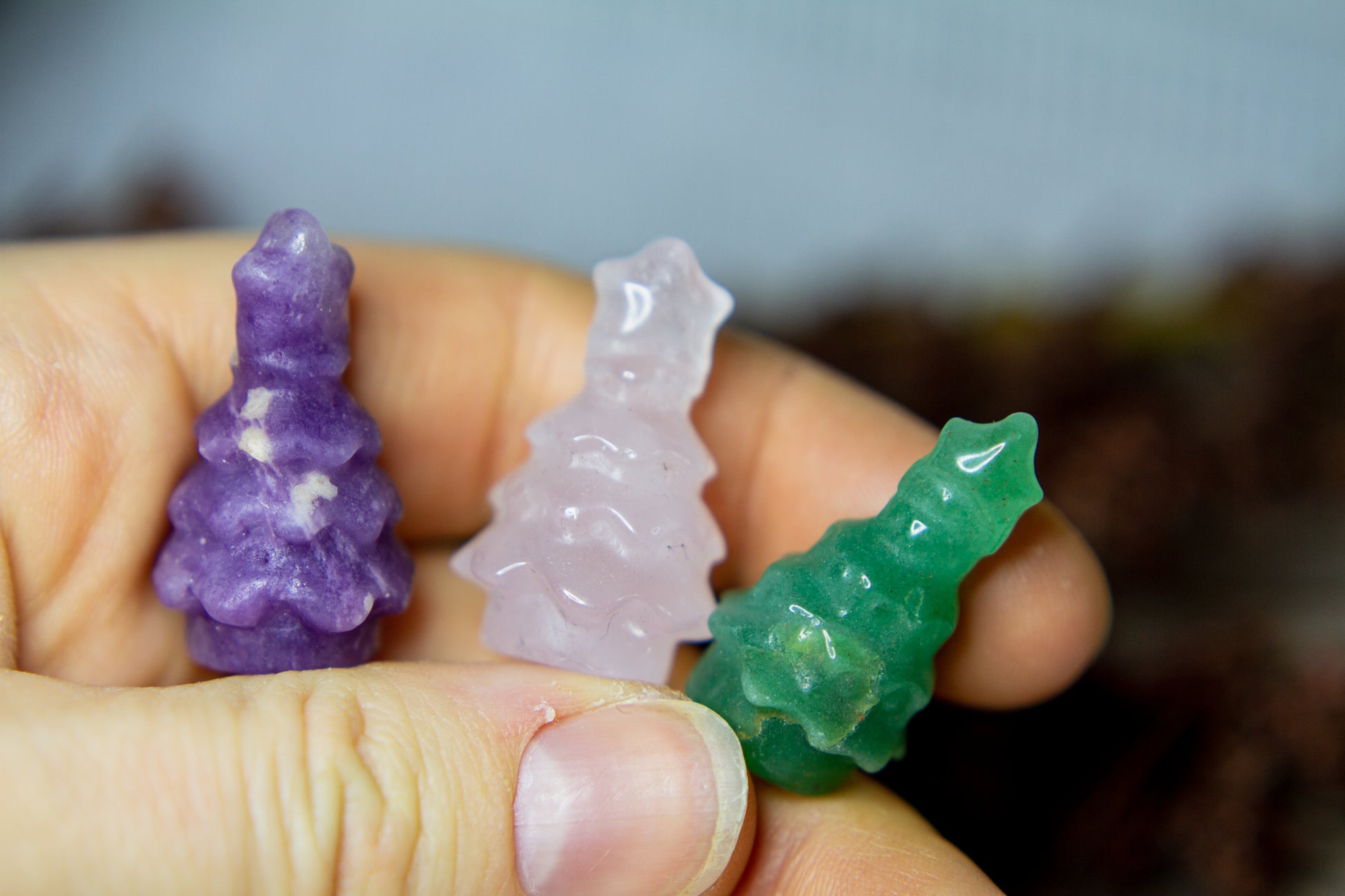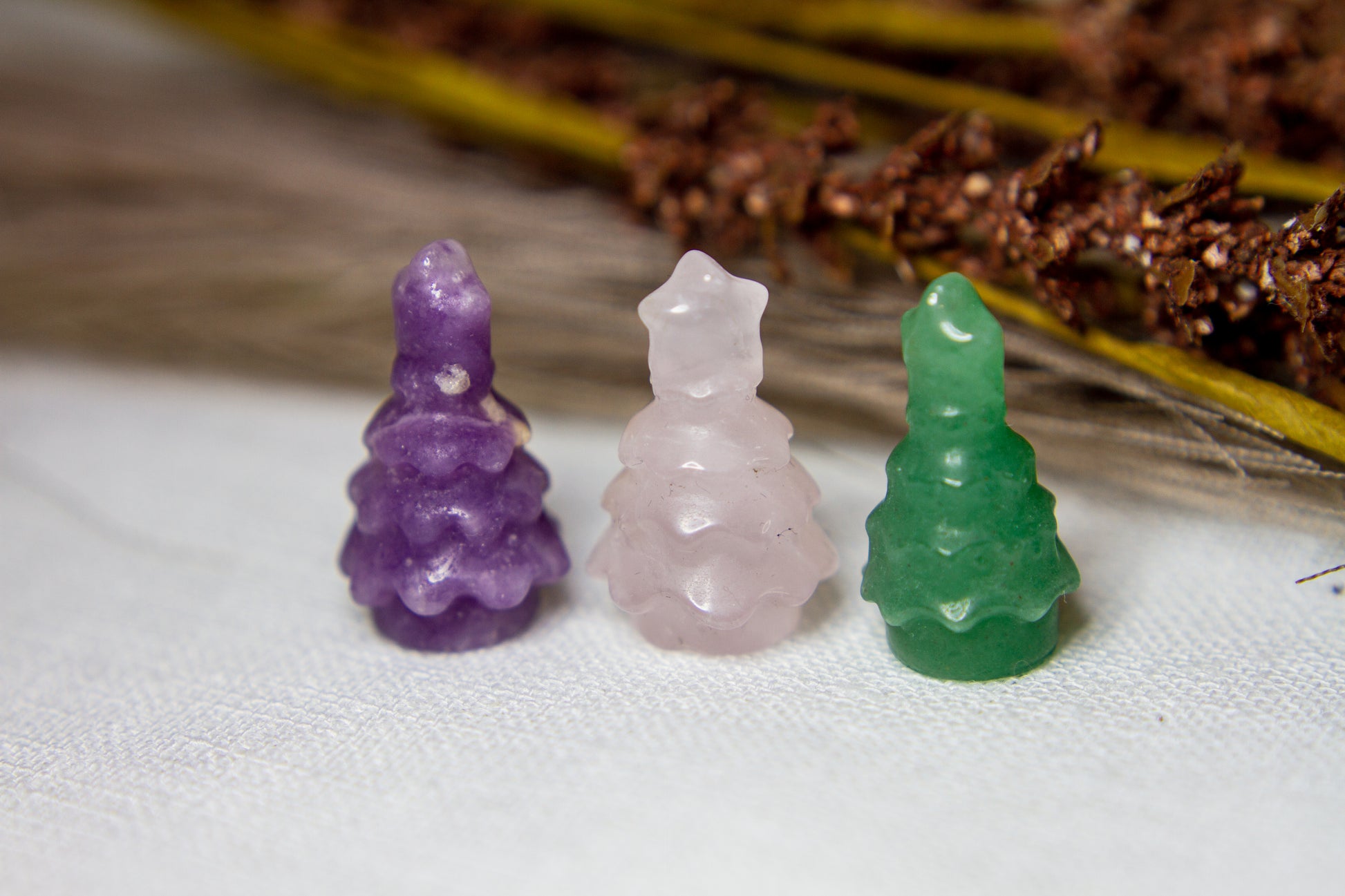 Otroligt fina, fĂ€rgskarpa och skinande julgranar i kristallerna lepidolit, rosenkvarts och grön aventurin. Granarna Ă€r riktigt charmiga med sina julgransstjĂ€rnor och varma fĂ€rger, och de Ă€r ca 3cm höga! â â
