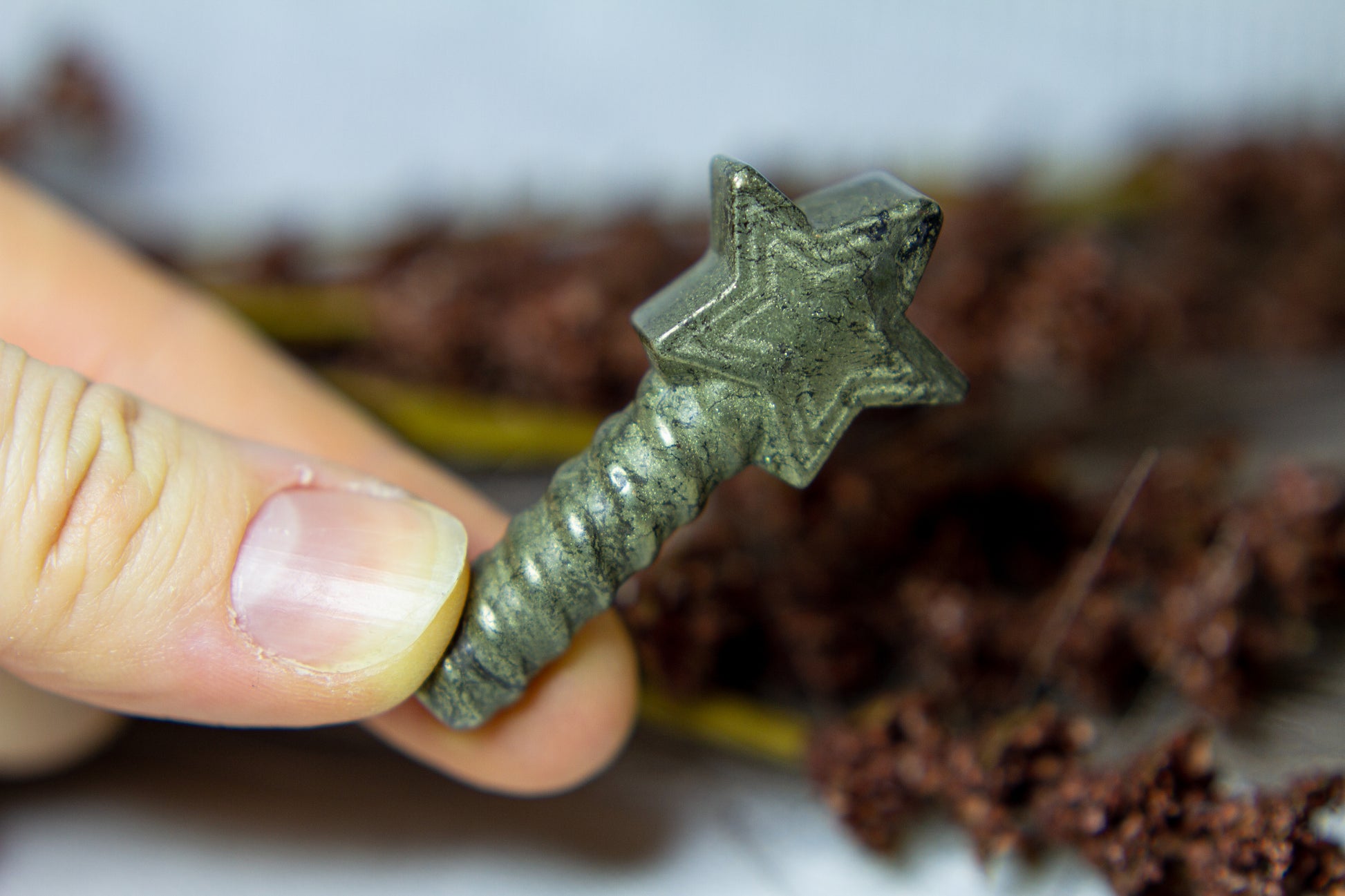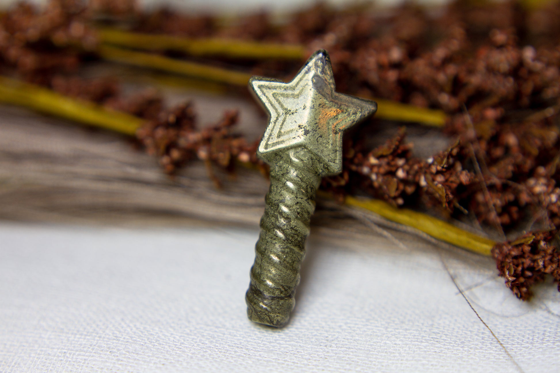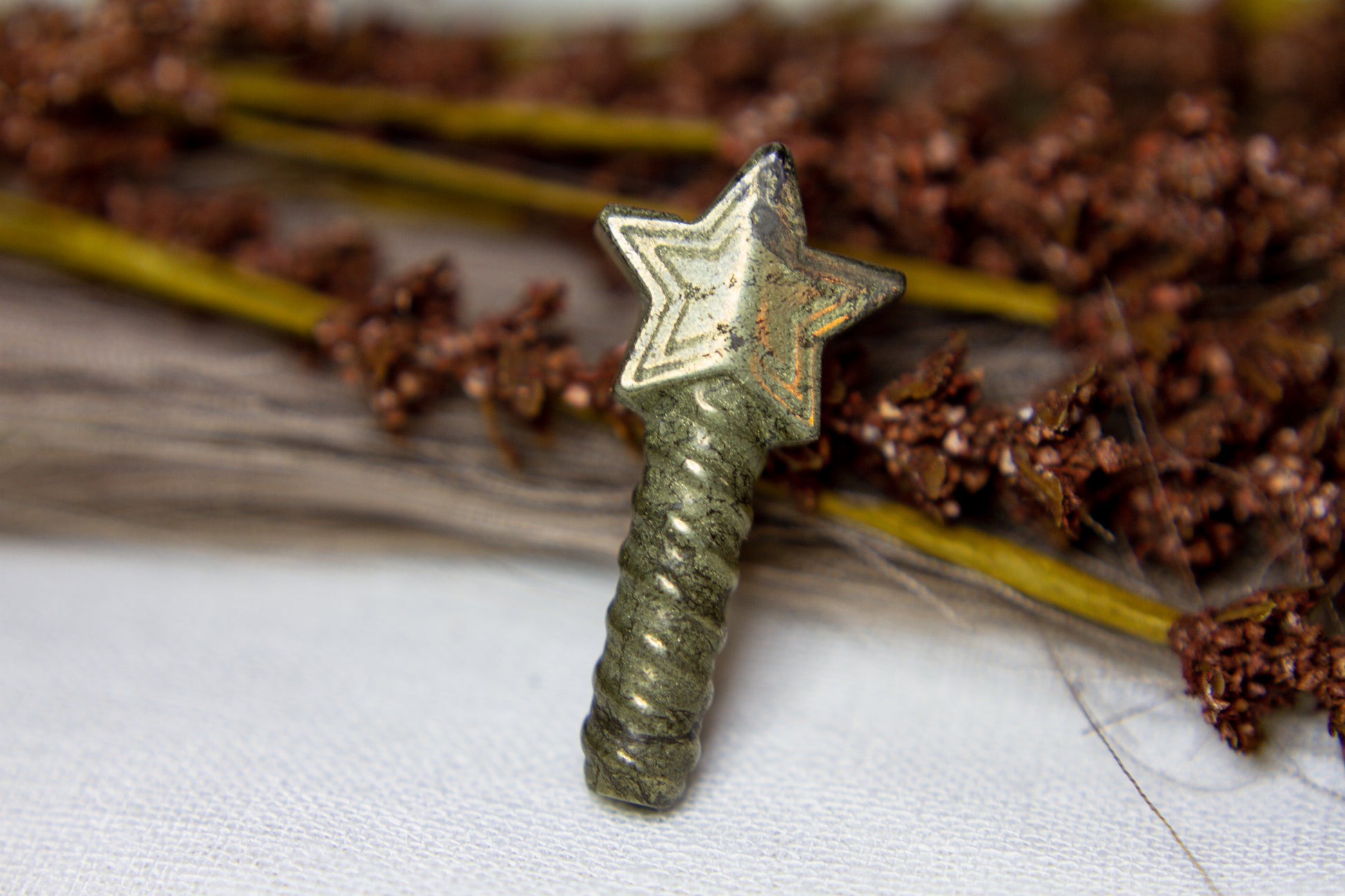 Här har vi en riktigt fin, magisk och gyllene trollstav i kristallen pyrit. Staven lyser i sitt guldiga pyrit skimmer och är ca 5cm hög! [Kristallen på bilderna är den som säljs]