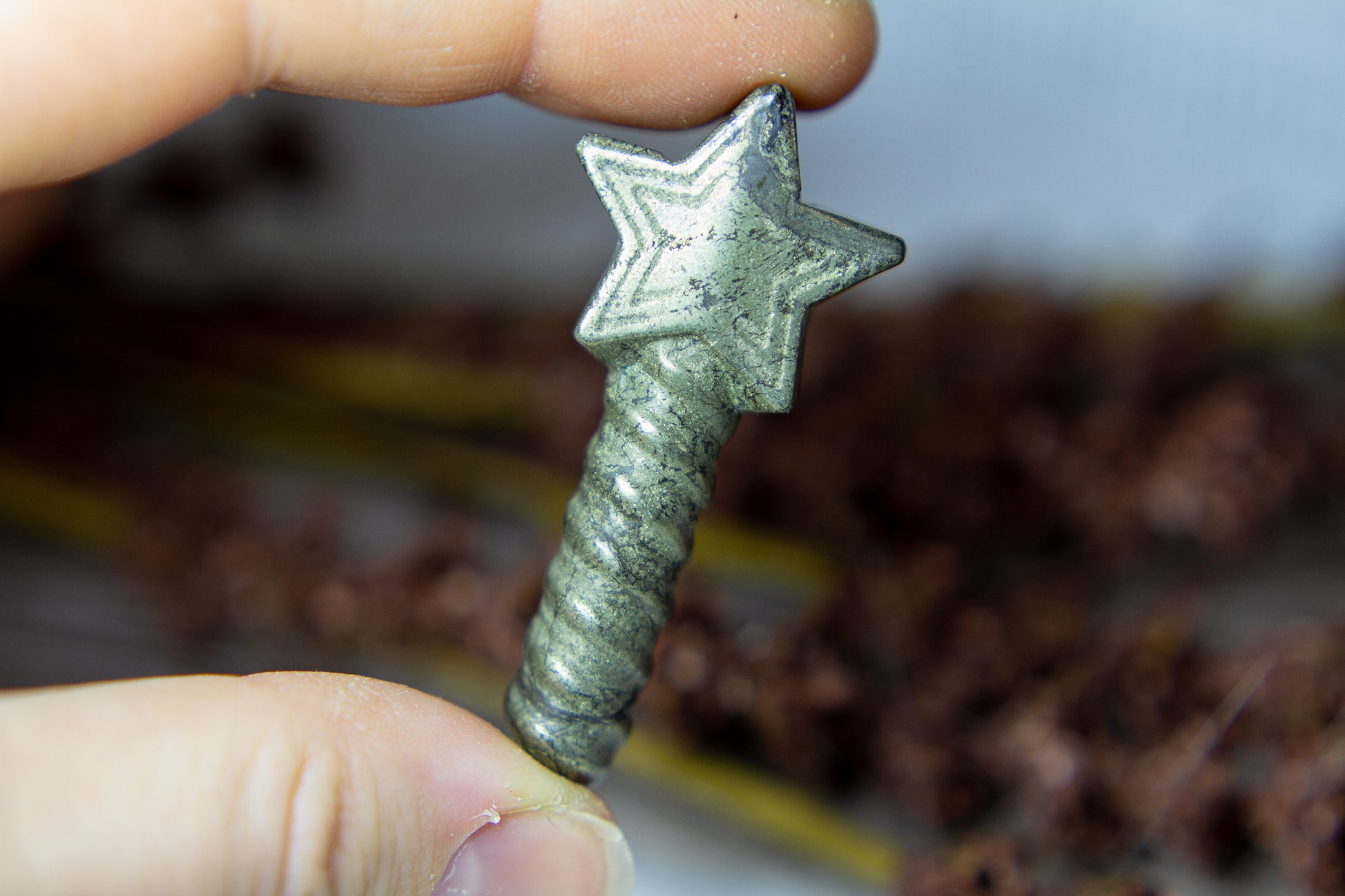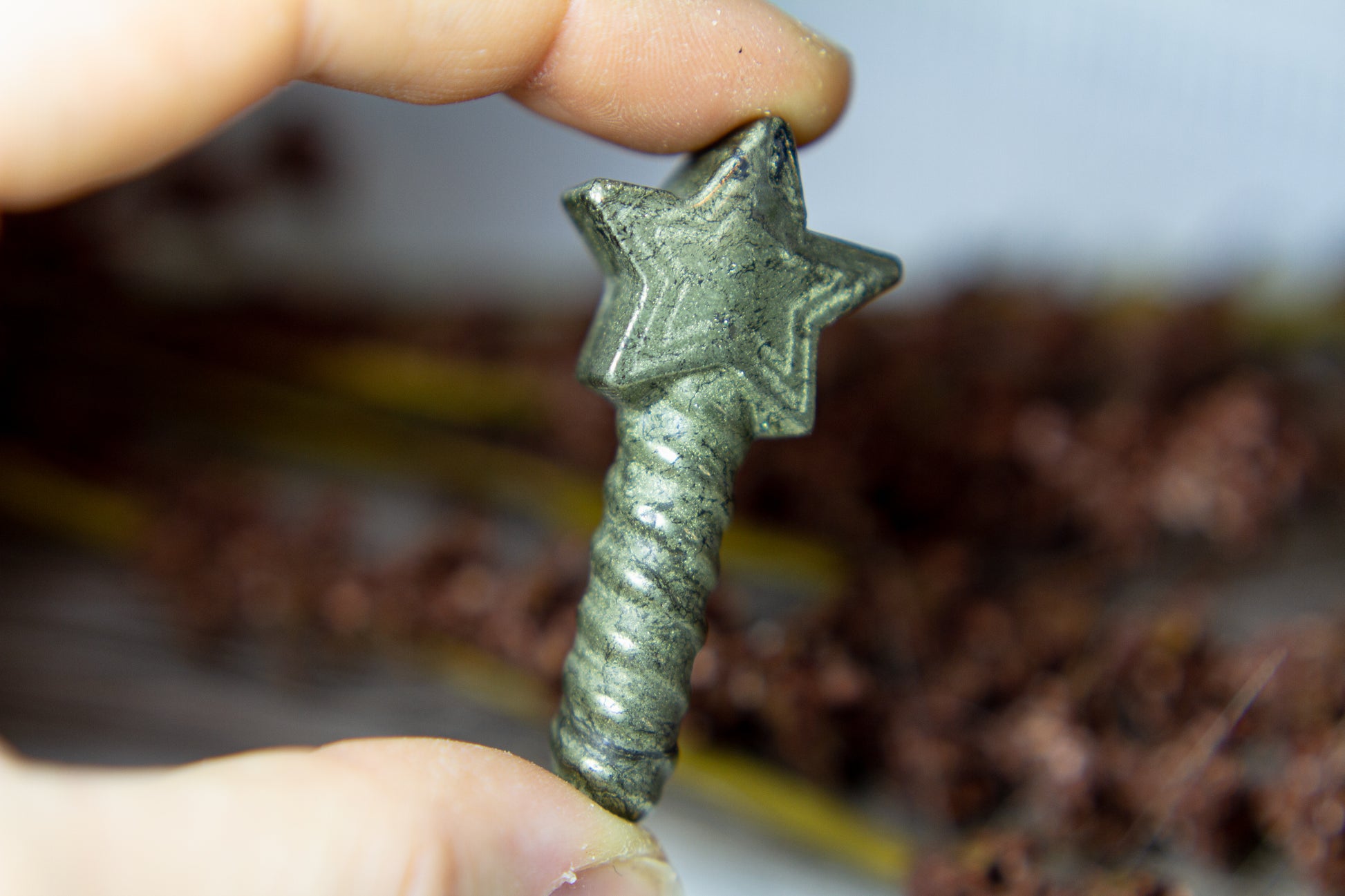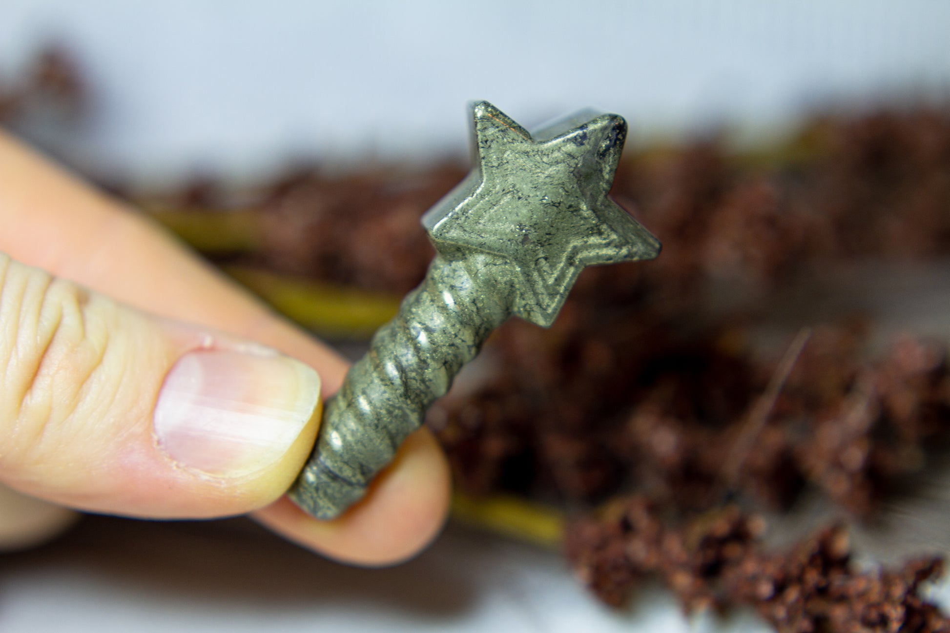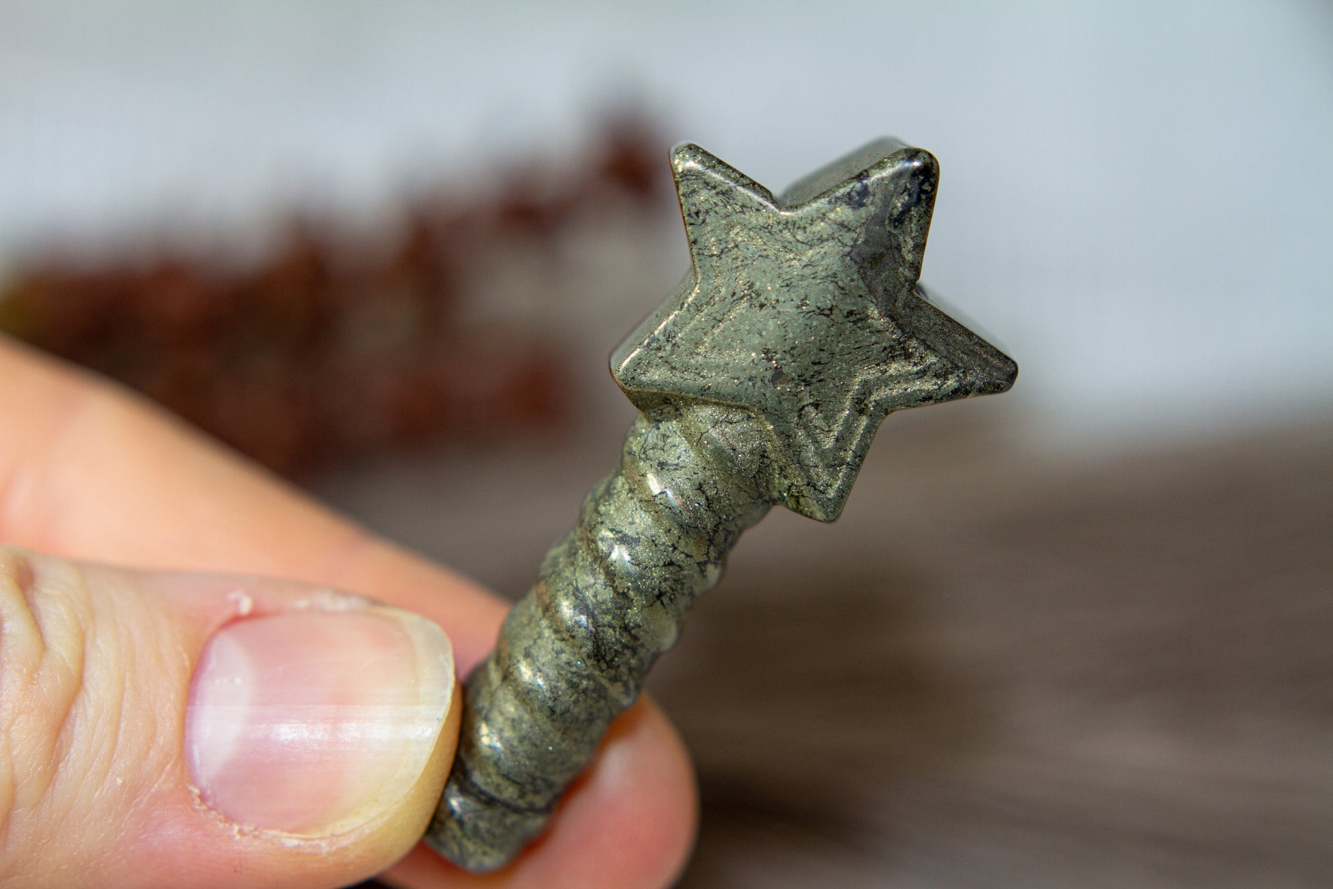 Här har vi en riktigt fin, magisk och gyllene trollstav i kristallen pyrit. Staven lyser i sitt guldiga pyrit skimmer och är ca 5cm hög! [Kristallen på bilderna är den som säljs]