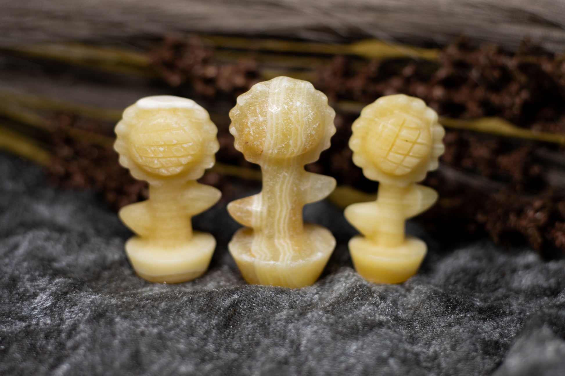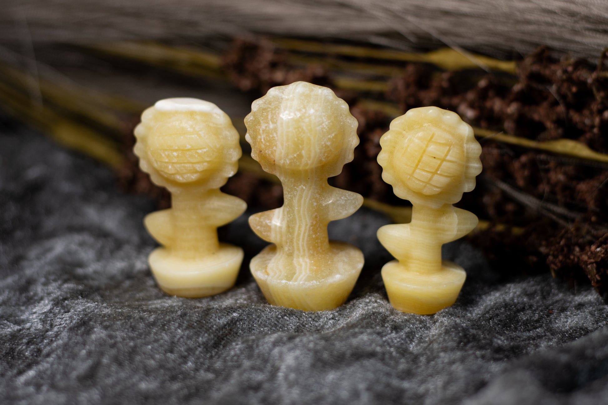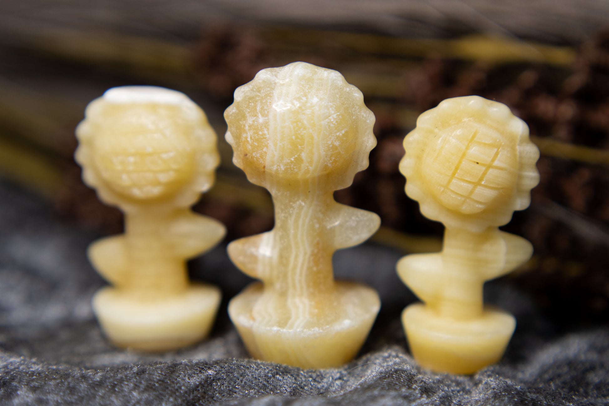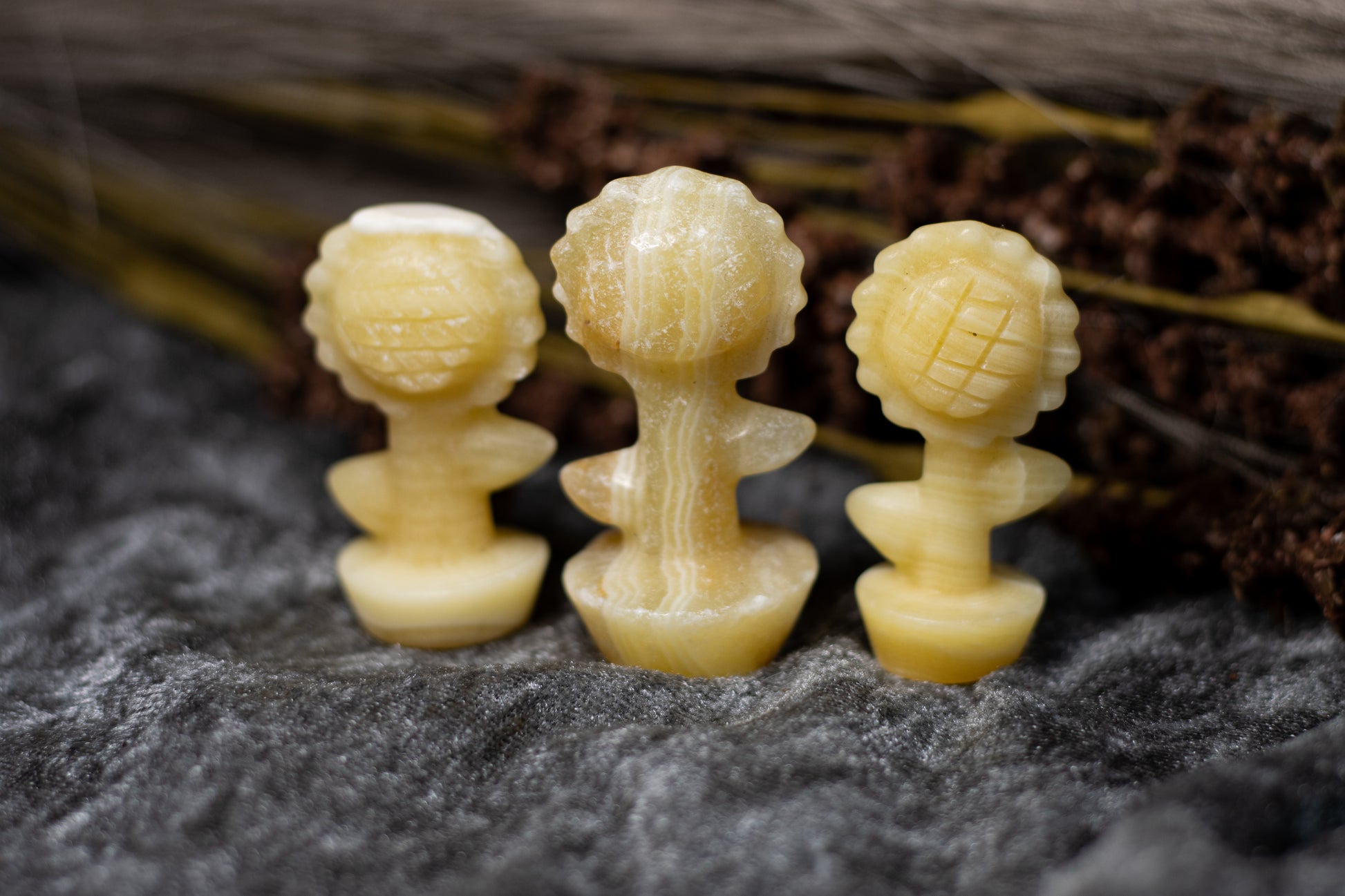 Urgulliga solrosor i orange bandad kalcit. Dem är hur fina som helst med olika bandningar, färgkombinationer och är runt 5-5,5cm höga!