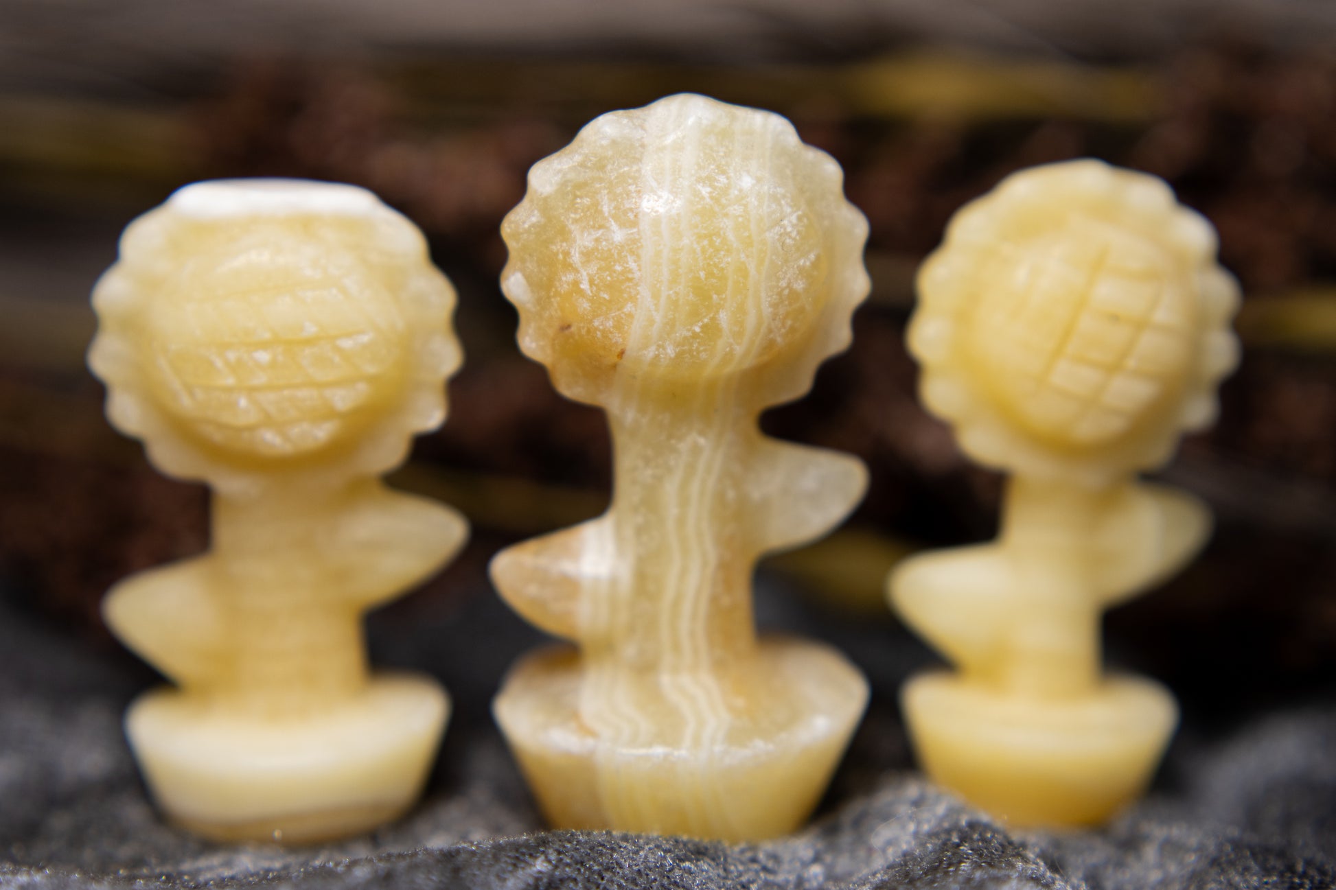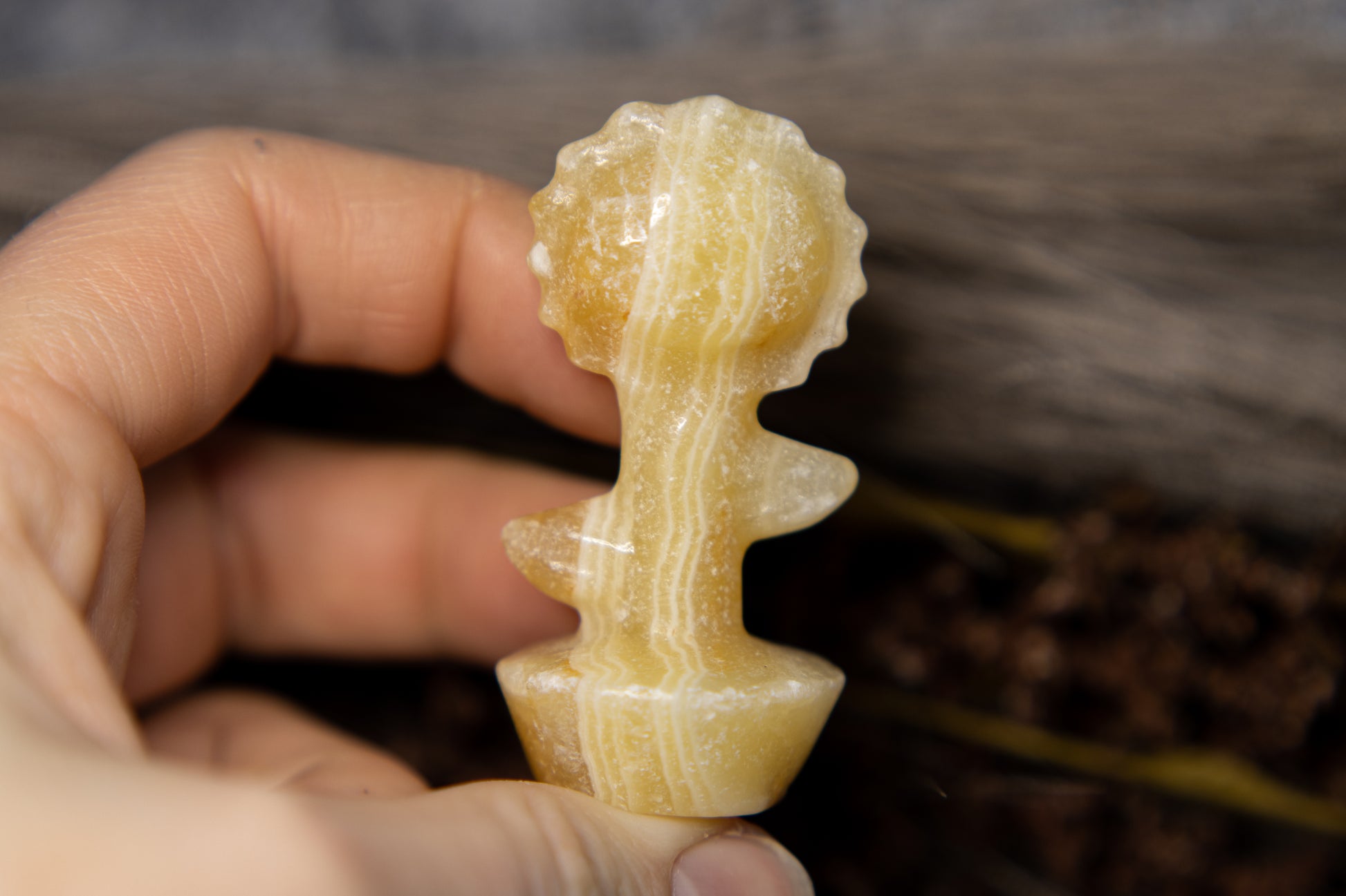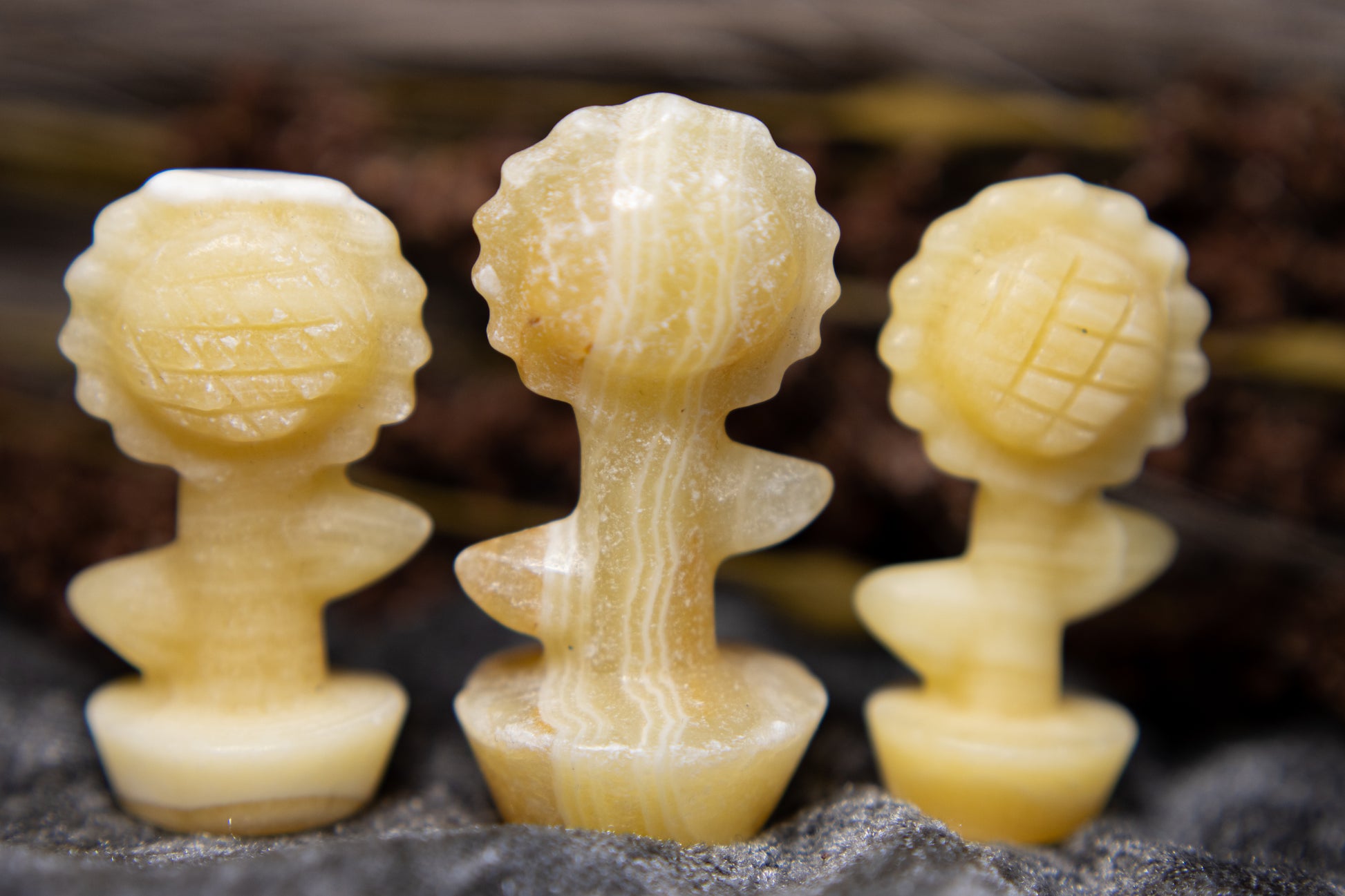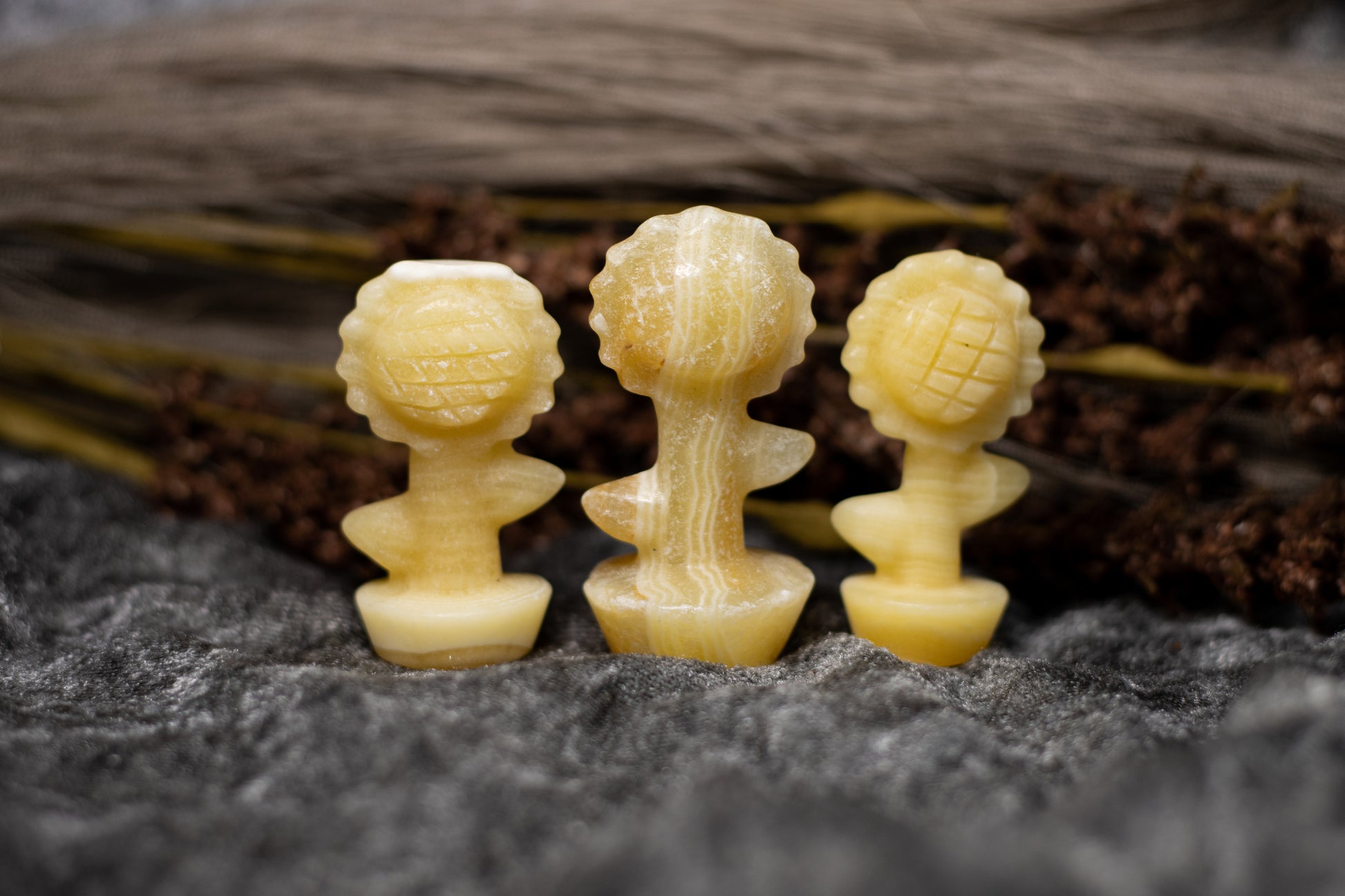 Urgulliga solrosor i orange bandad kalcit. Dem är hur fina som helst med olika bandningar, färgkombinationer och är runt 5-5,5cm höga!