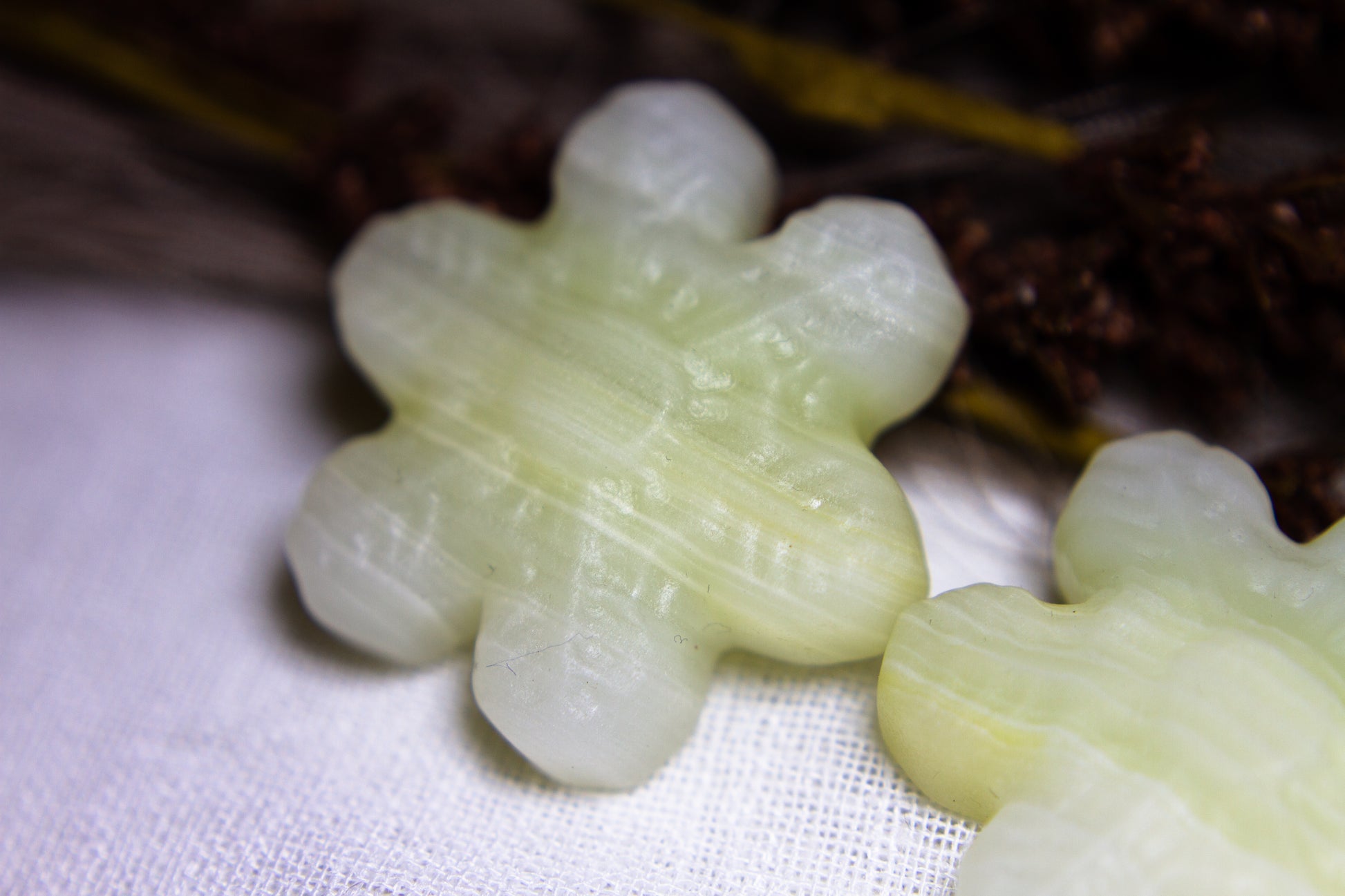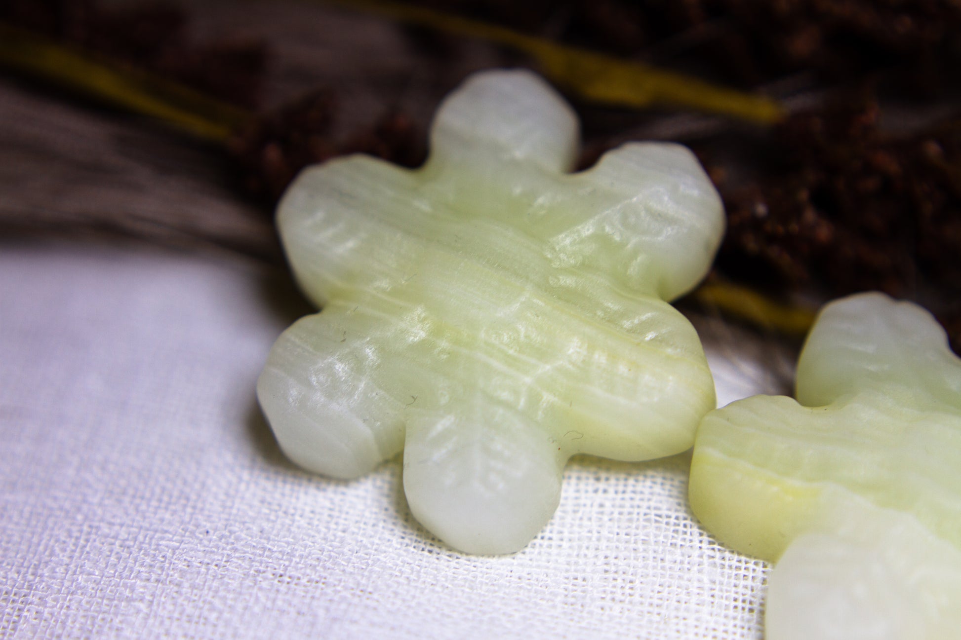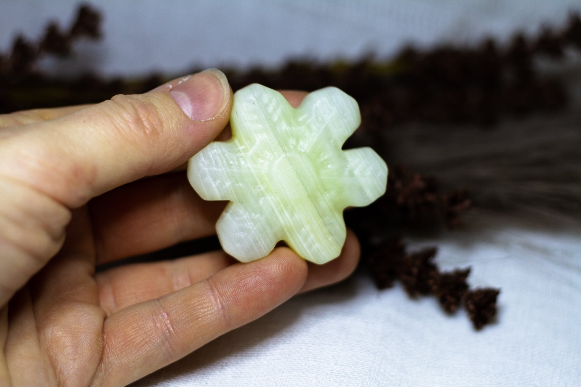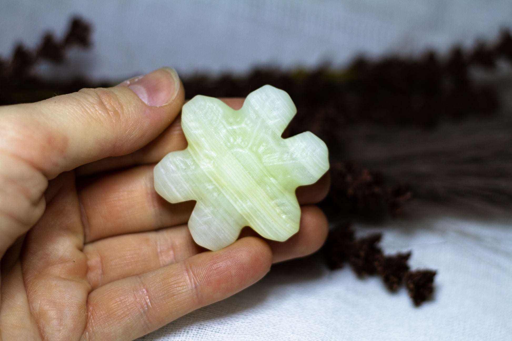 Riktigt juicy, färgskarp och vackert bandad snöflinga i kristallen grön onyx, även känd som bandad grön kalcit. Snöflingorna lyser starkt i sina fina bandade gröna nyanser, och är ca 5,1cm i diameter! [Kristallerna på bilderna är de som säljs]