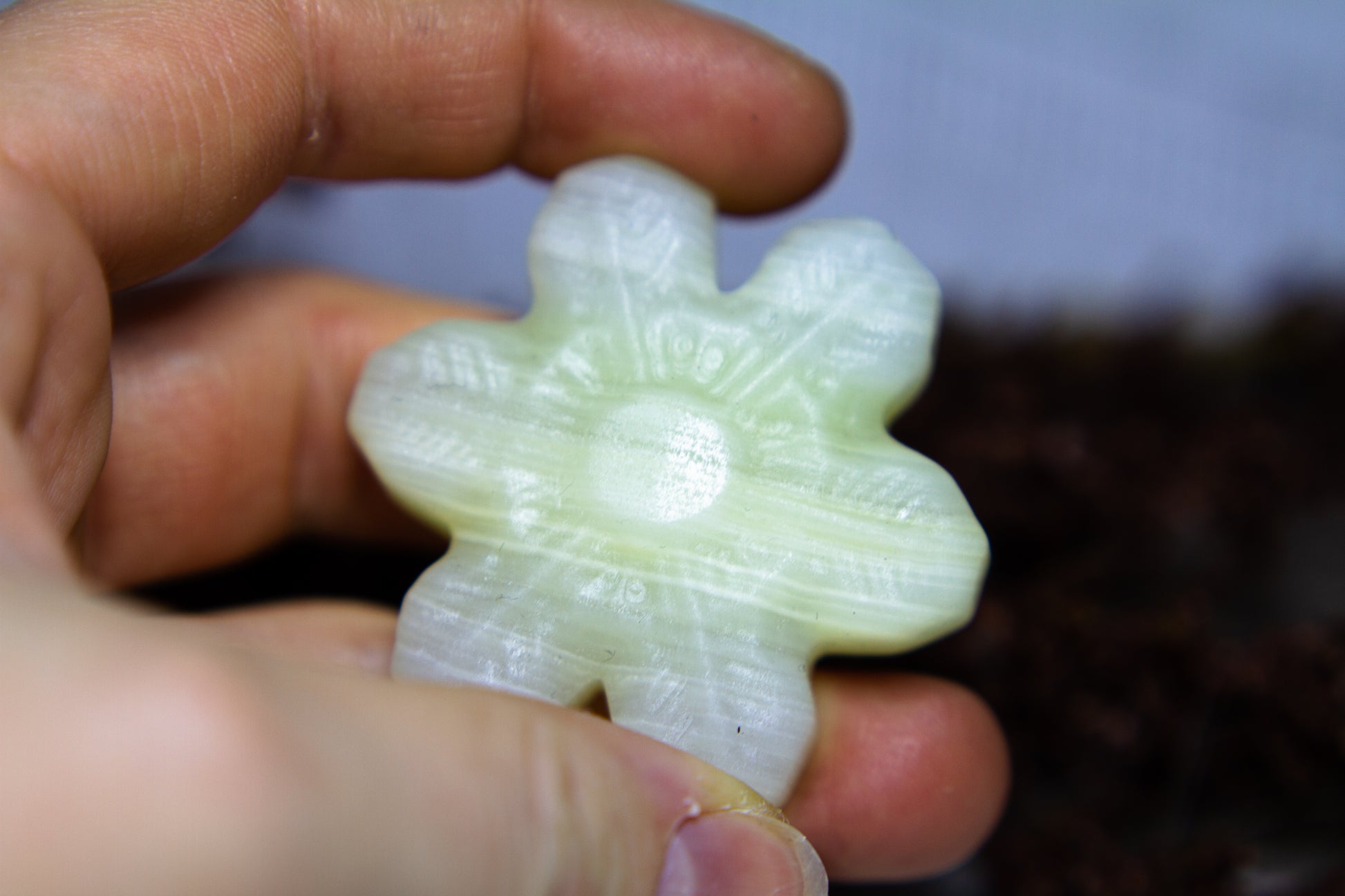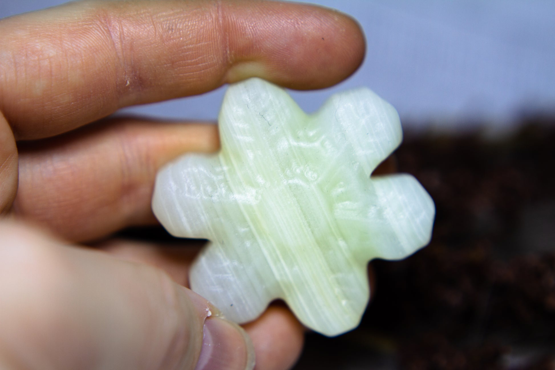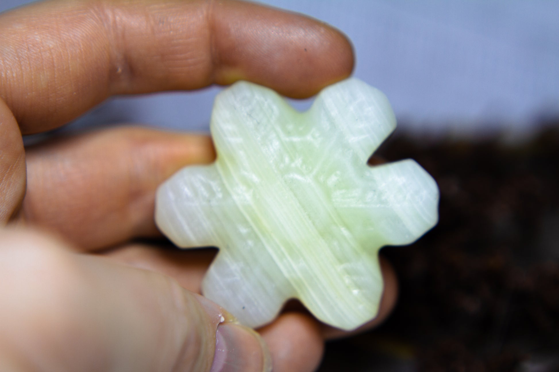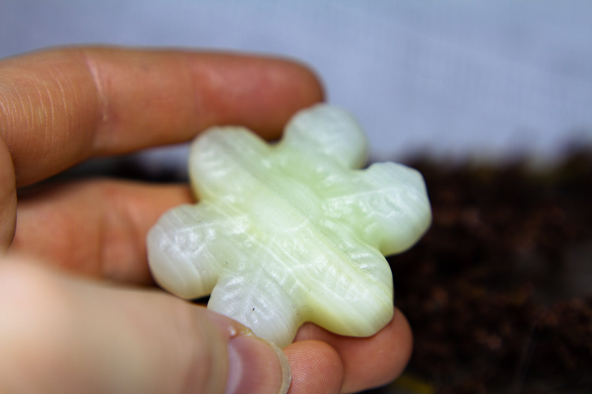 Riktigt juicy, färgskarp och vackert bandad snöflinga i kristallen grön onyx, även känd som bandad grön kalcit. Snöflingorna lyser starkt i sina fina bandade gröna nyanser, och är ca 5,1cm i diameter! [Kristallerna på bilderna är de som säljs]