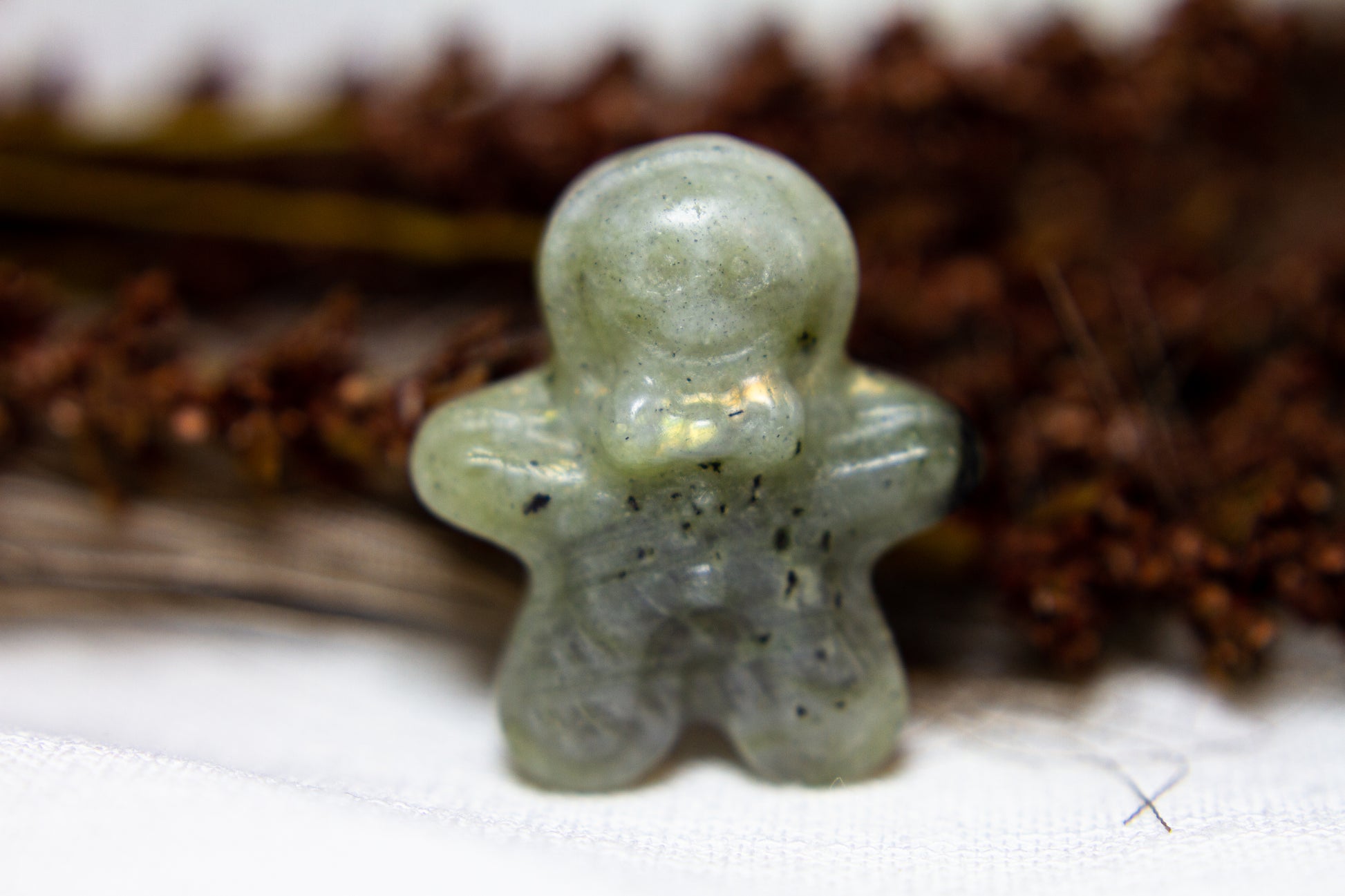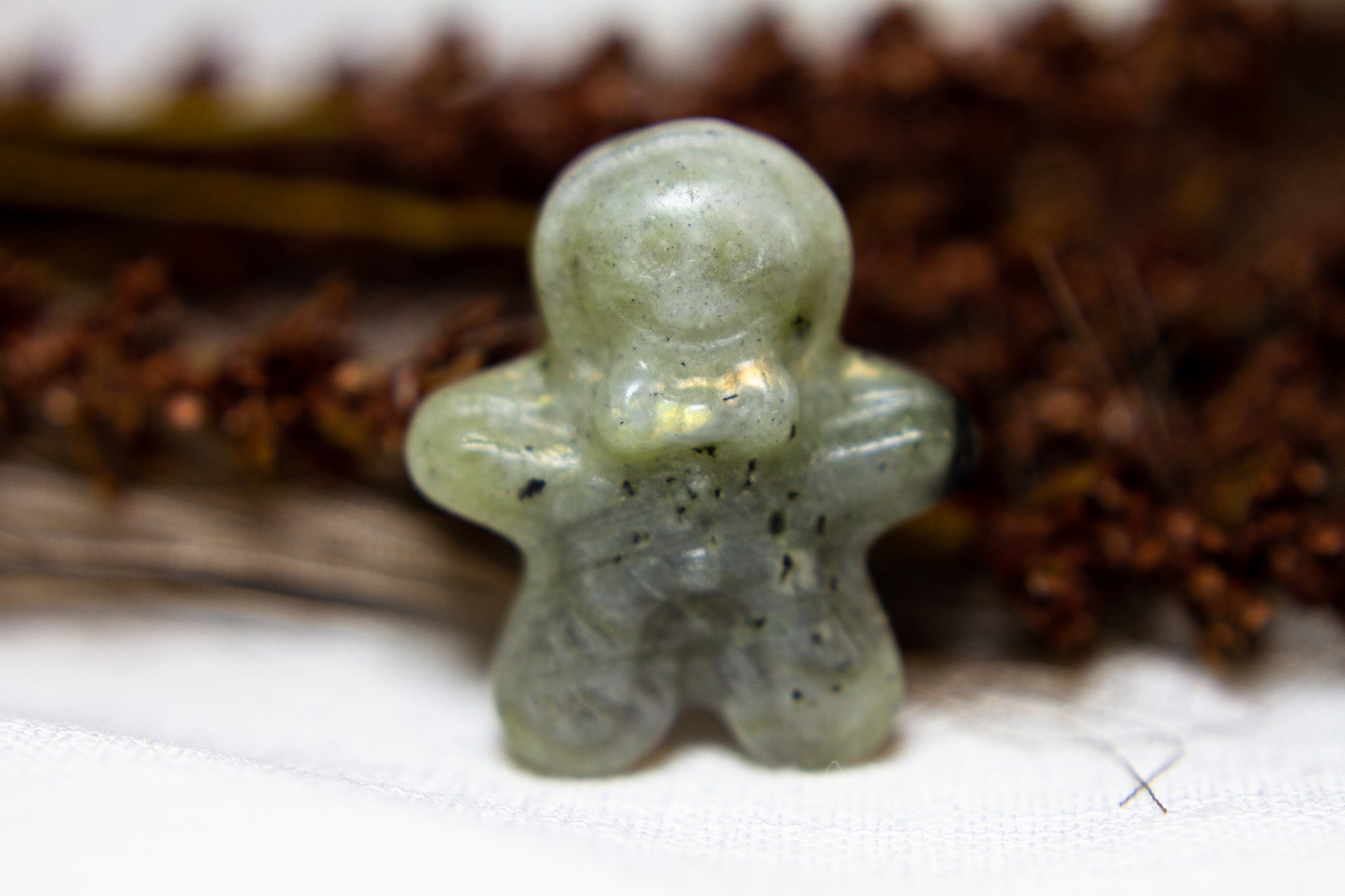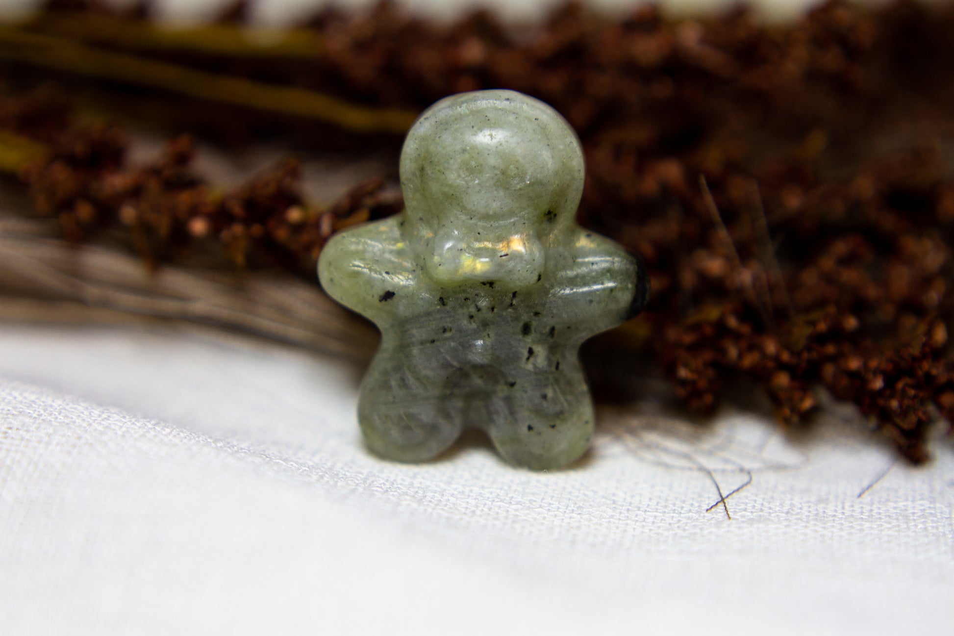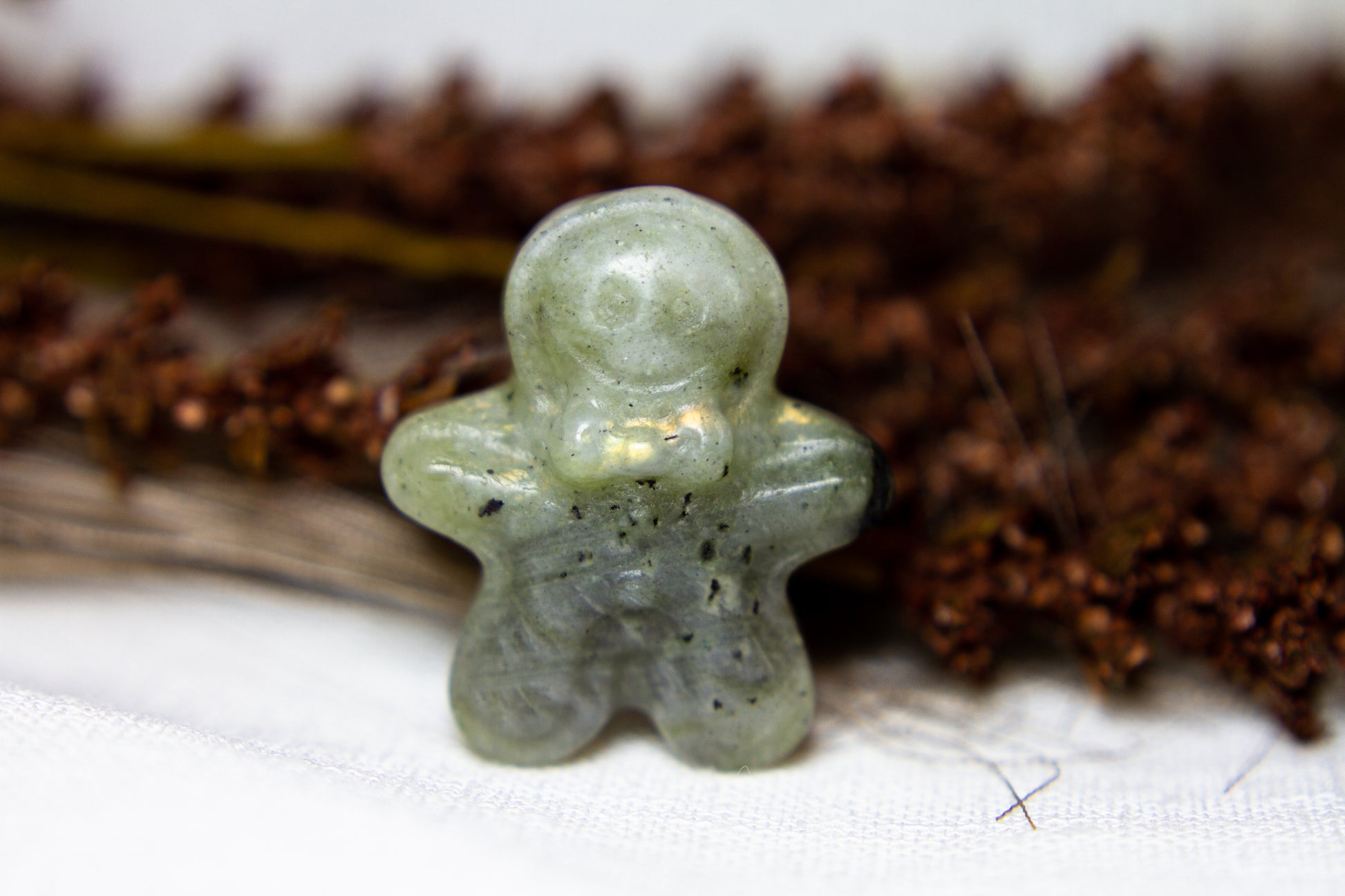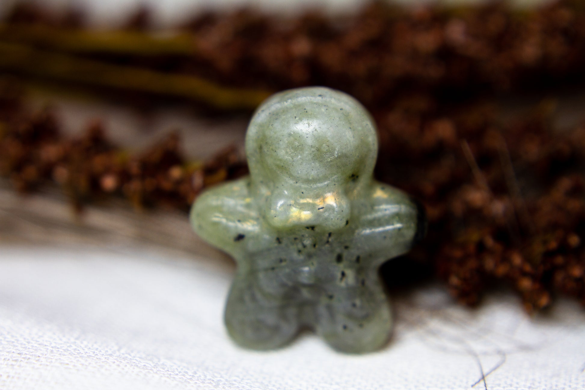 Otroligt gullig, vÀlgjord, glittrande och flashy pepparkaksgubbe i labradorit. Gubben Àr superfin med sina flashes och Àr ca 4cm hög! [Kristallen pÄ bilderna Àr den som sÀljs]