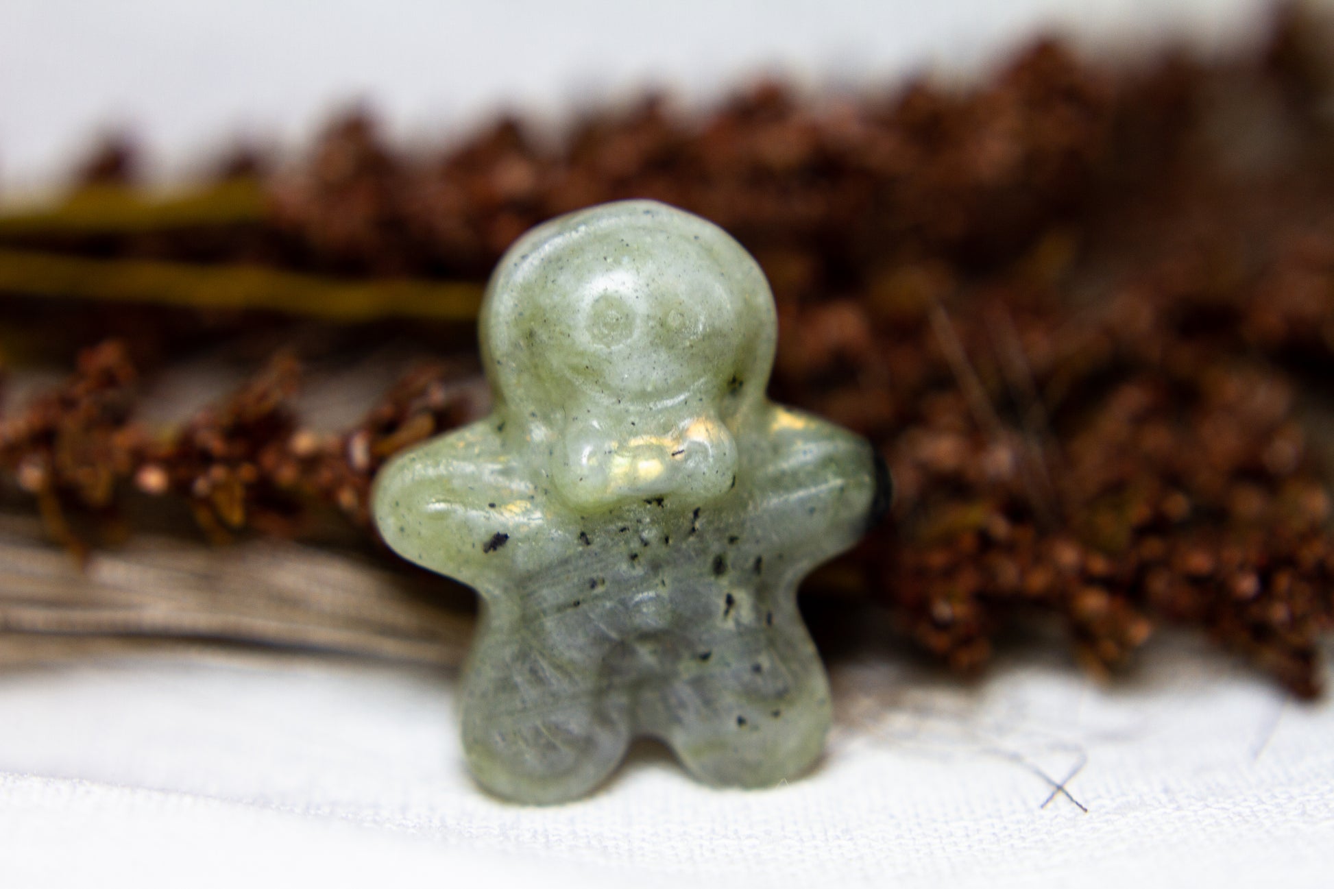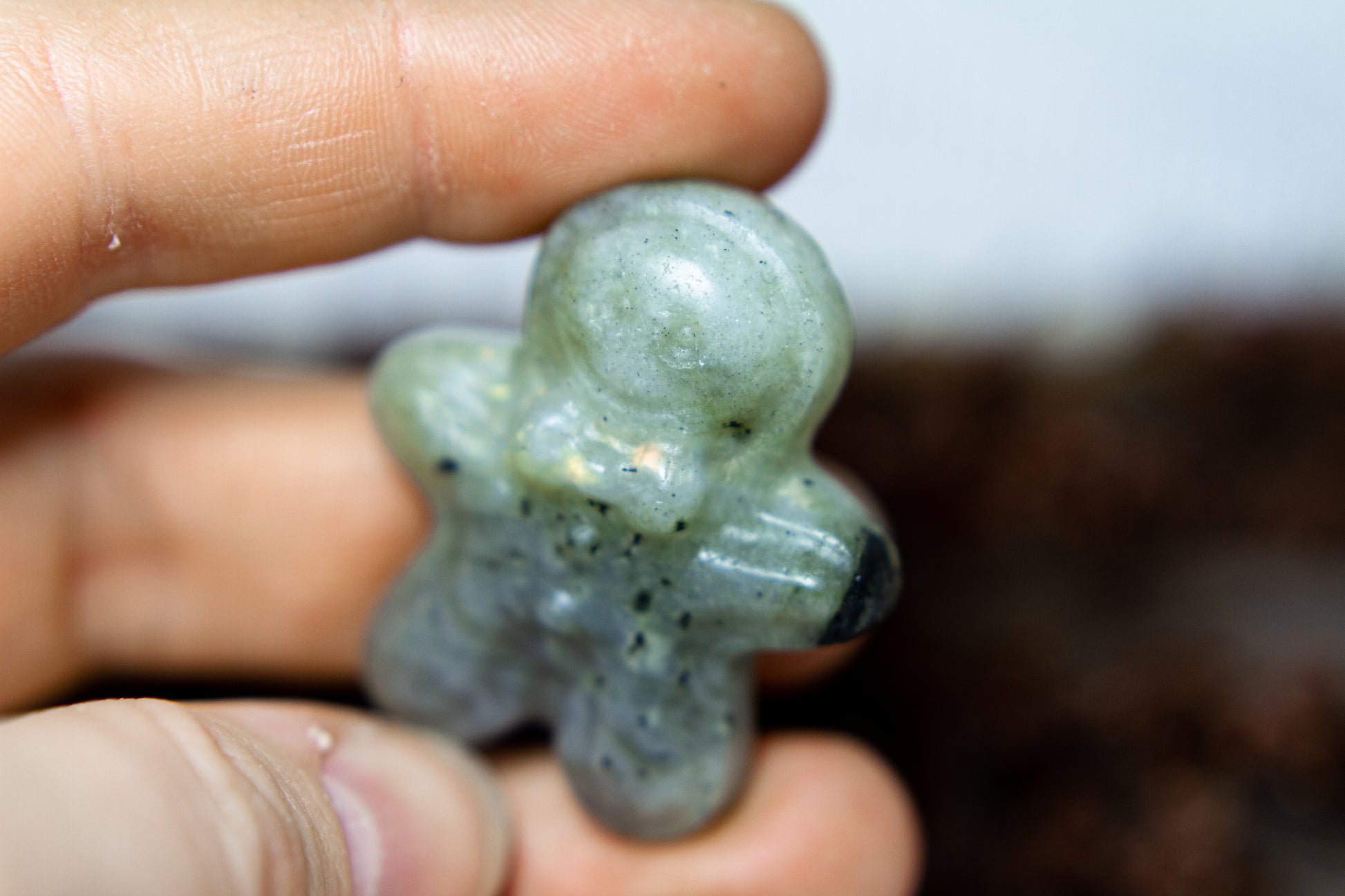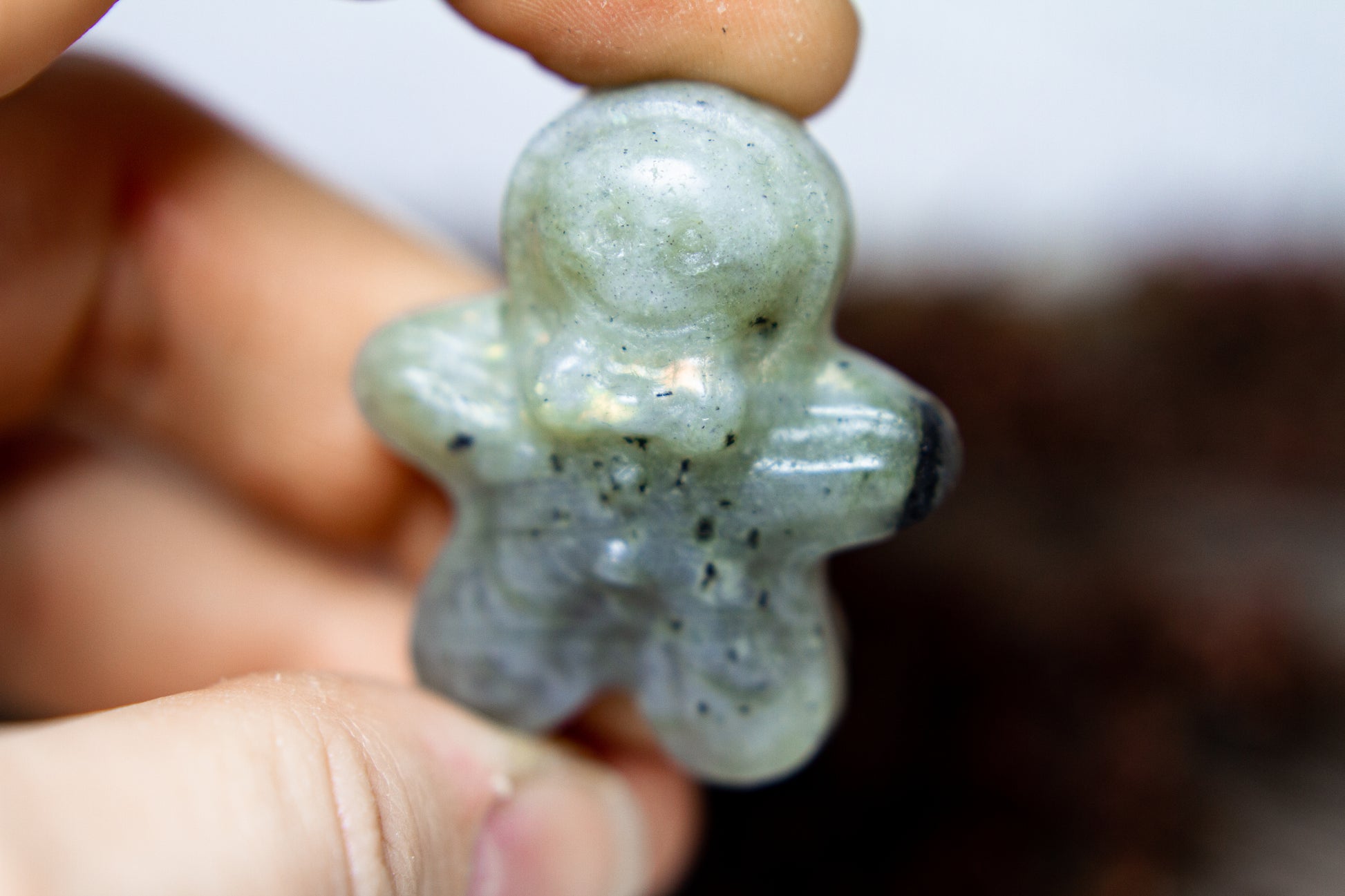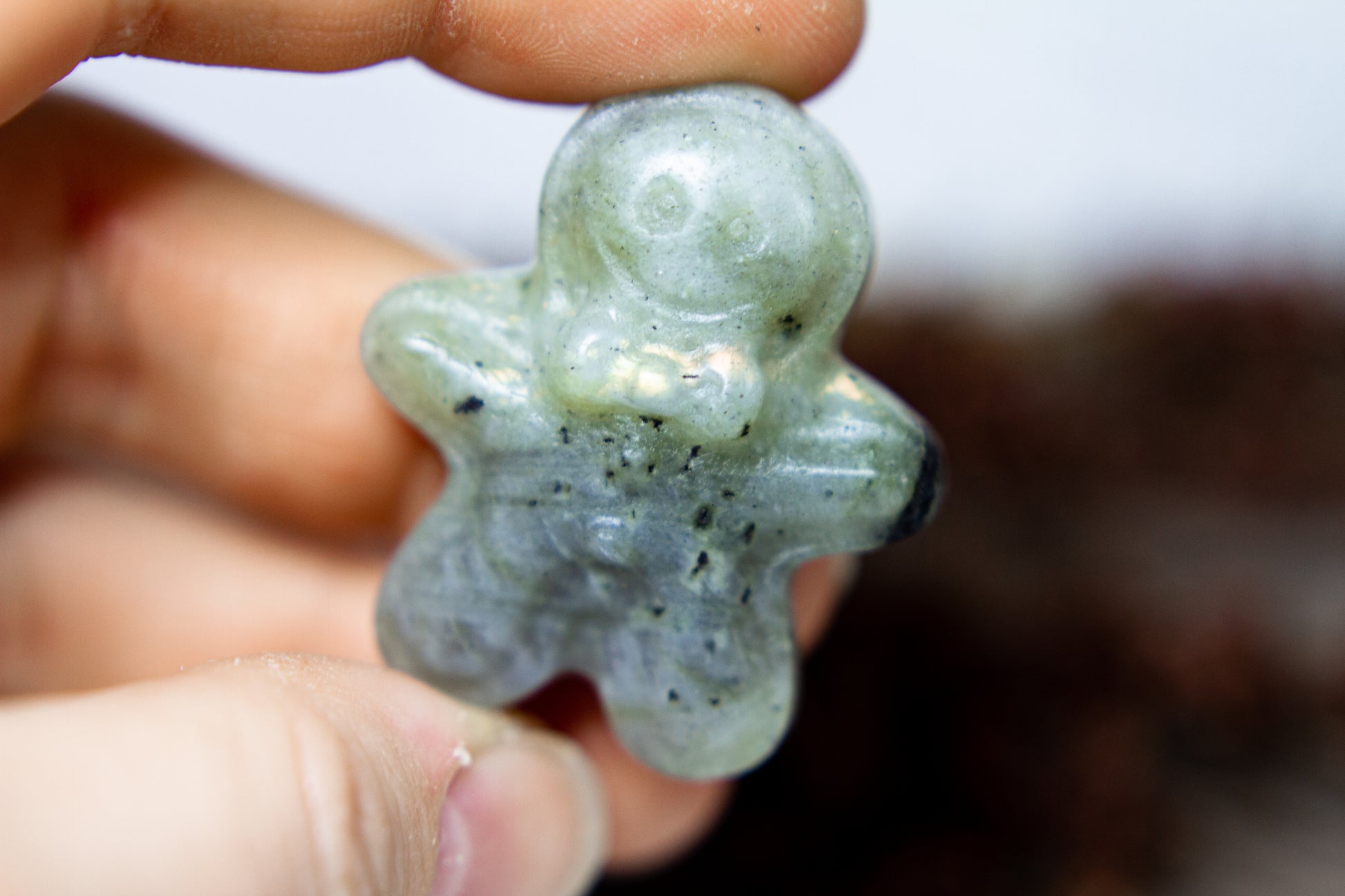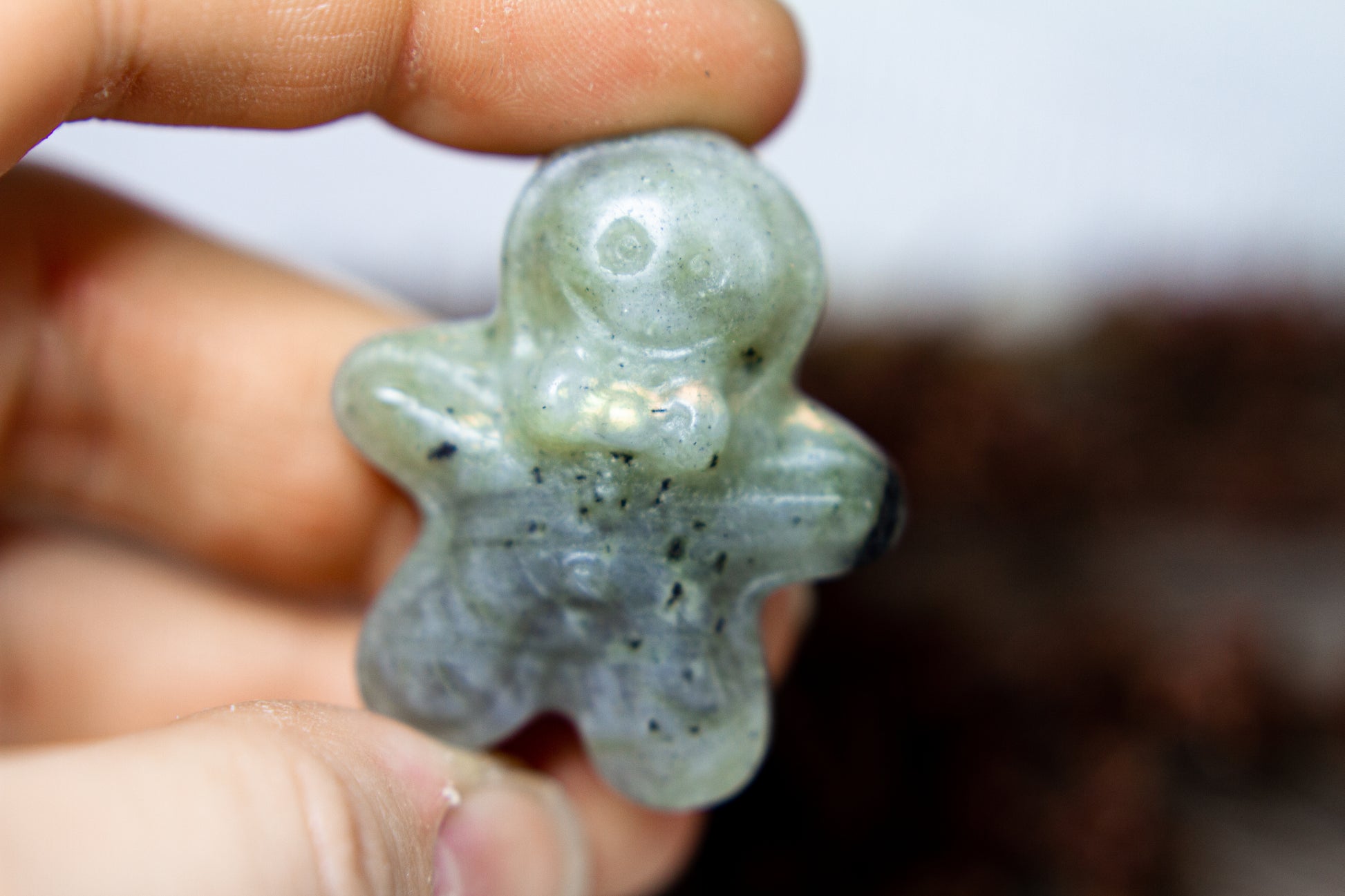Otroligt gullig, vÀlgjord, glittrande och flashy pepparkaksgubbe i labradorit. Gubben Àr superfin med sina flashes och Àr ca 4cm hög! [Kristallen pÄ bilderna Àr den som sÀljs]