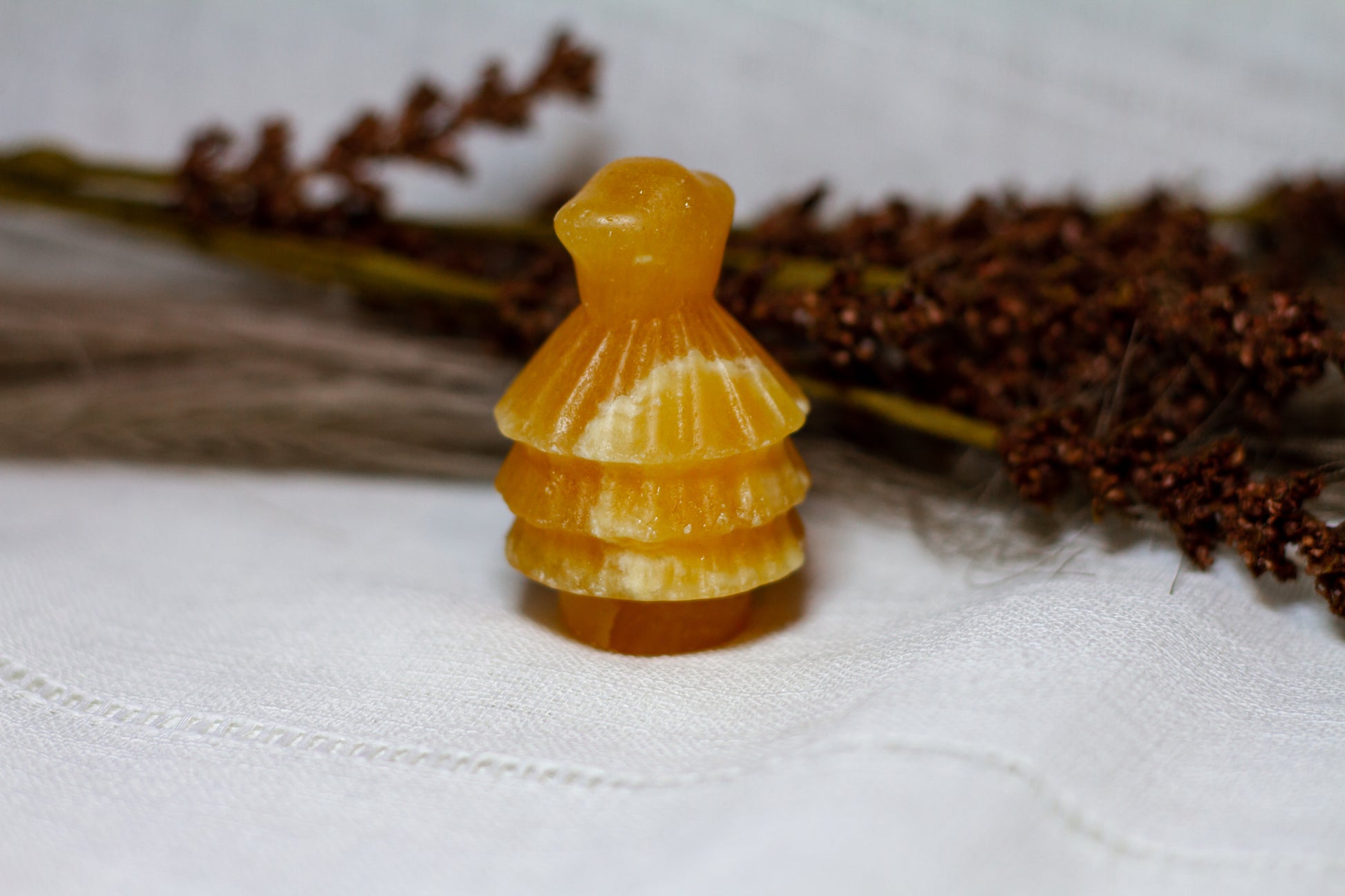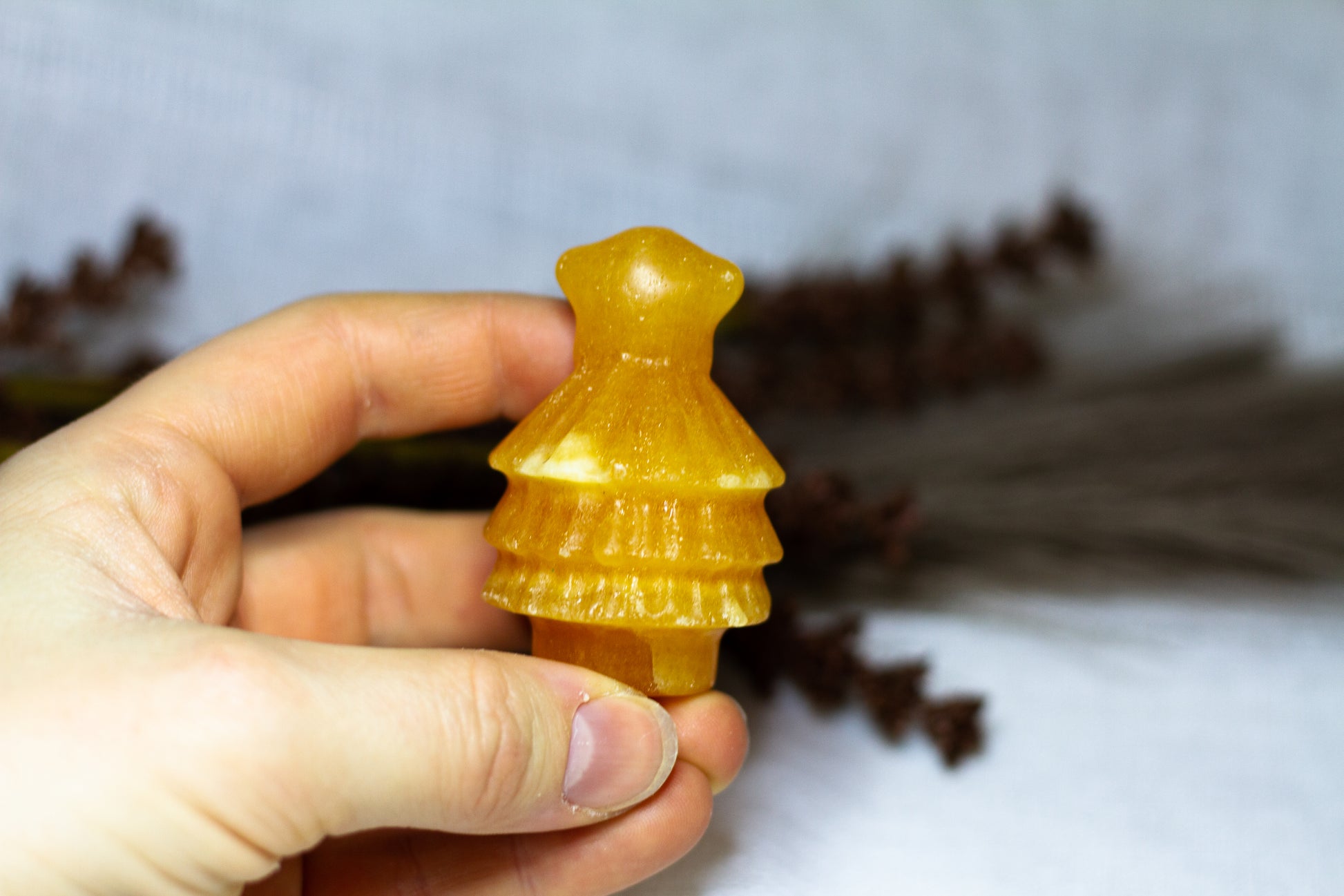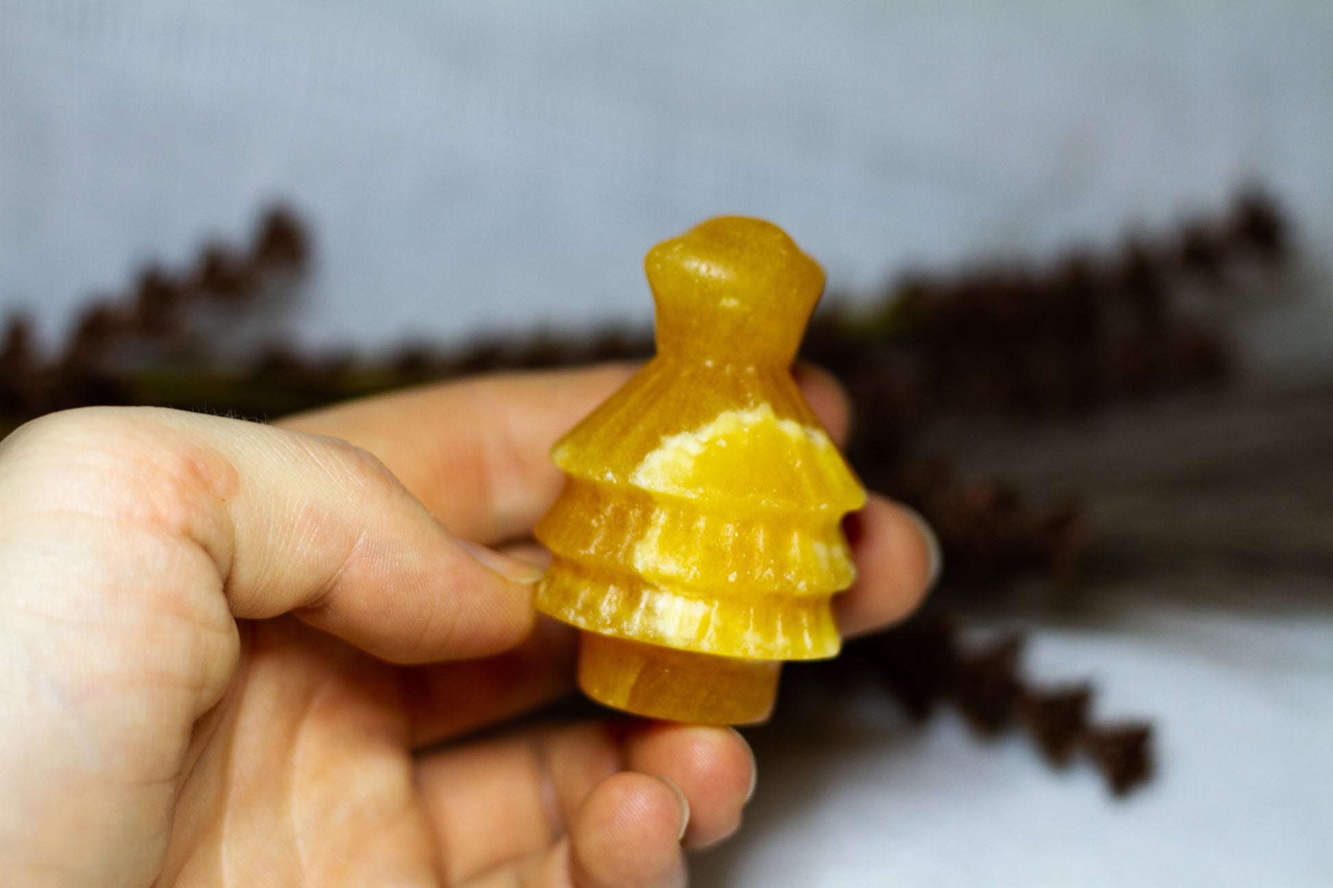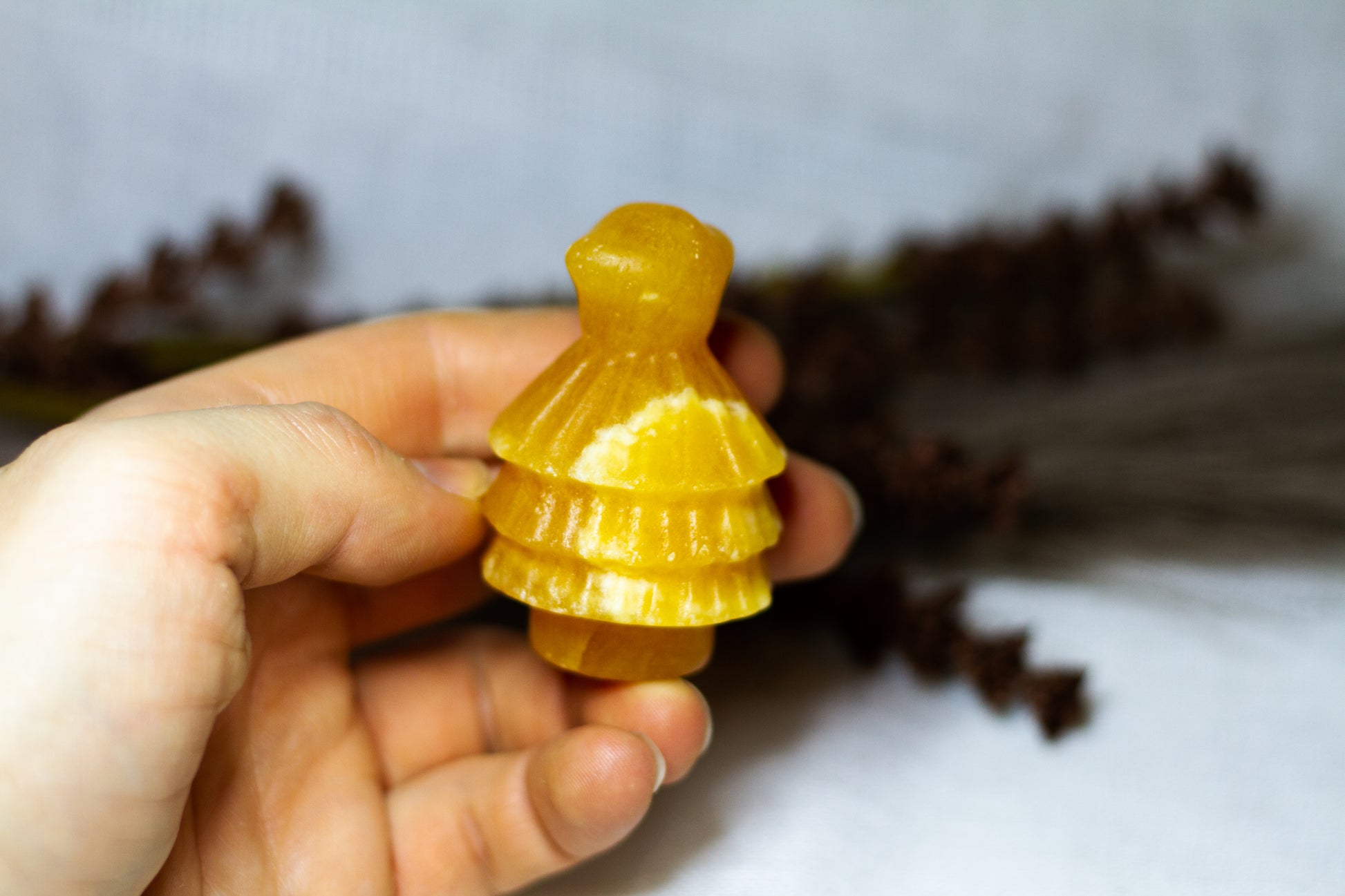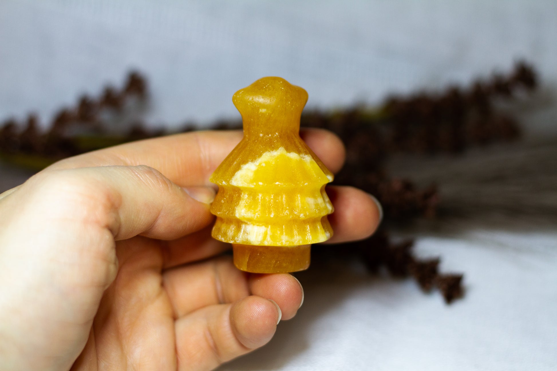 HÀr har vi en riktigt stor, juicy och skimrande julgran, i kristallen orange kalcit. Julgranen skiner massvis tillsammans med sitt fina bandade mönster pÄ sidan, vÀger 90g och Àr ca 6cm hög! [Kristallen pÄ bilderna Àr den som sÀljs]