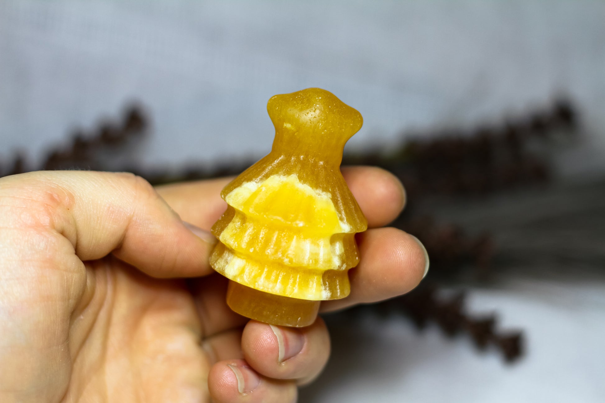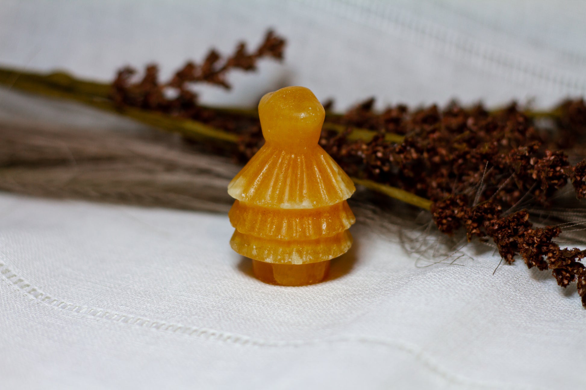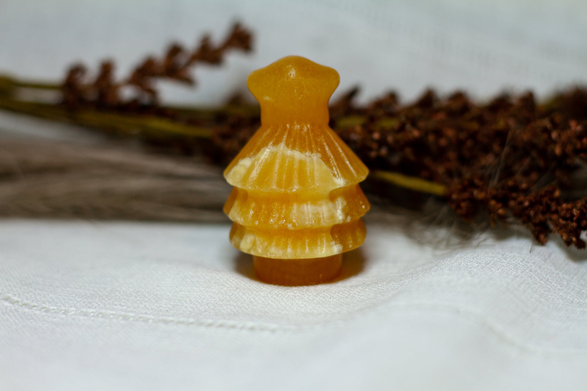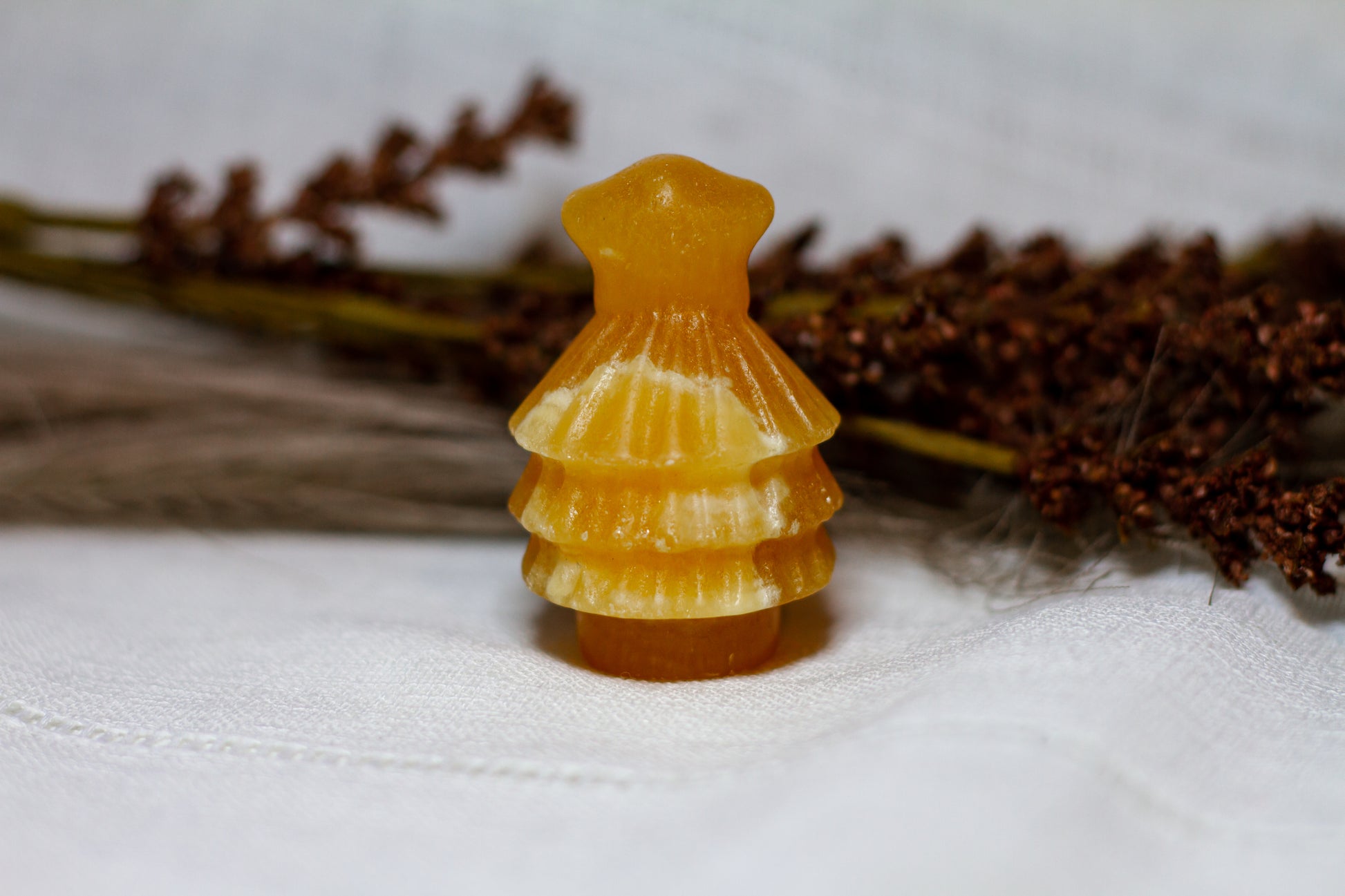 HÀr har vi en riktigt stor, juicy och skimrande julgran, i kristallen orange kalcit. Julgranen skiner massvis tillsammans med sitt fina bandade mönster pÄ sidan, vÀger 90g och Àr ca 6cm hög! [Kristallen pÄ bilderna Àr den som sÀljs]