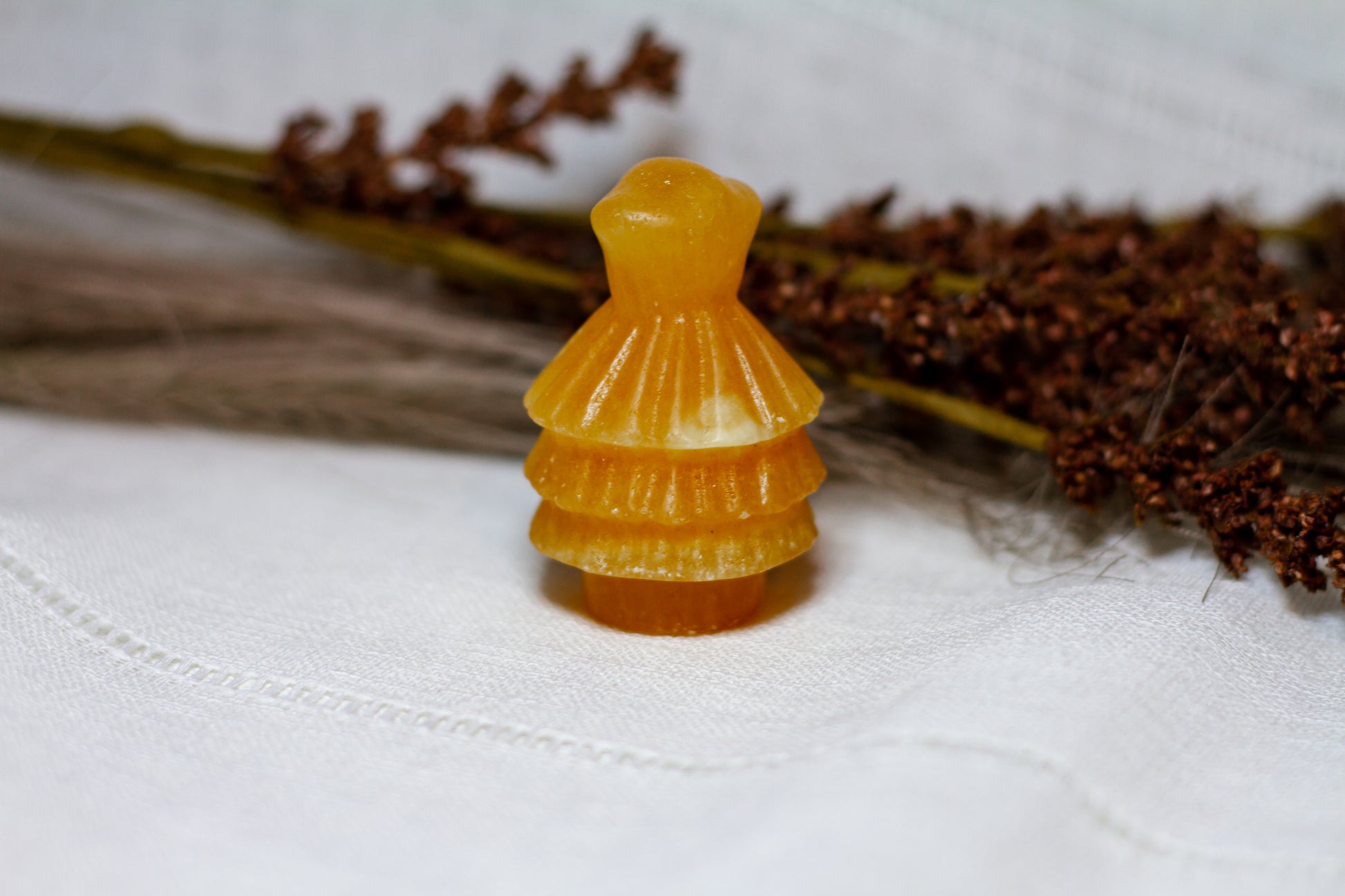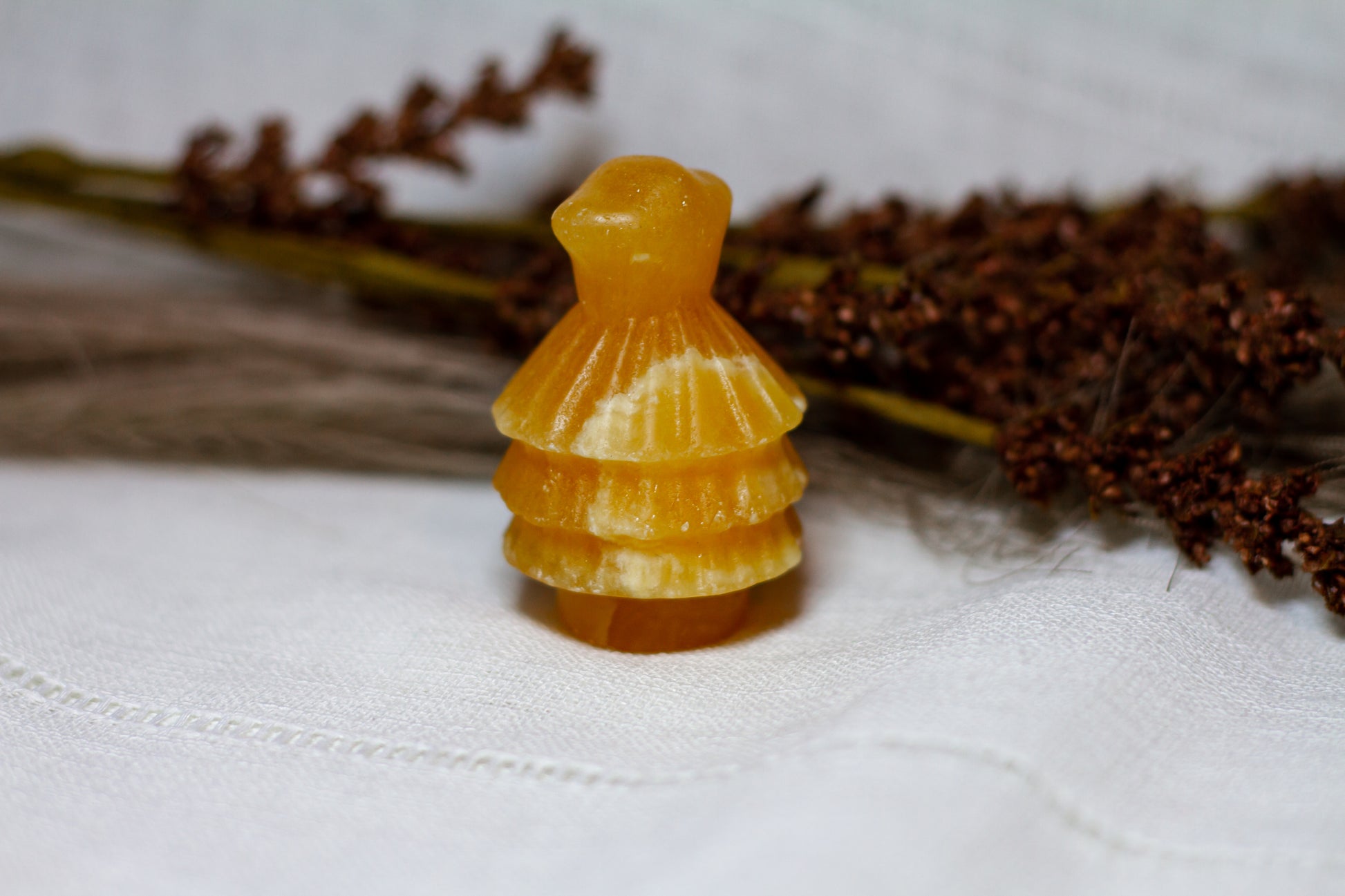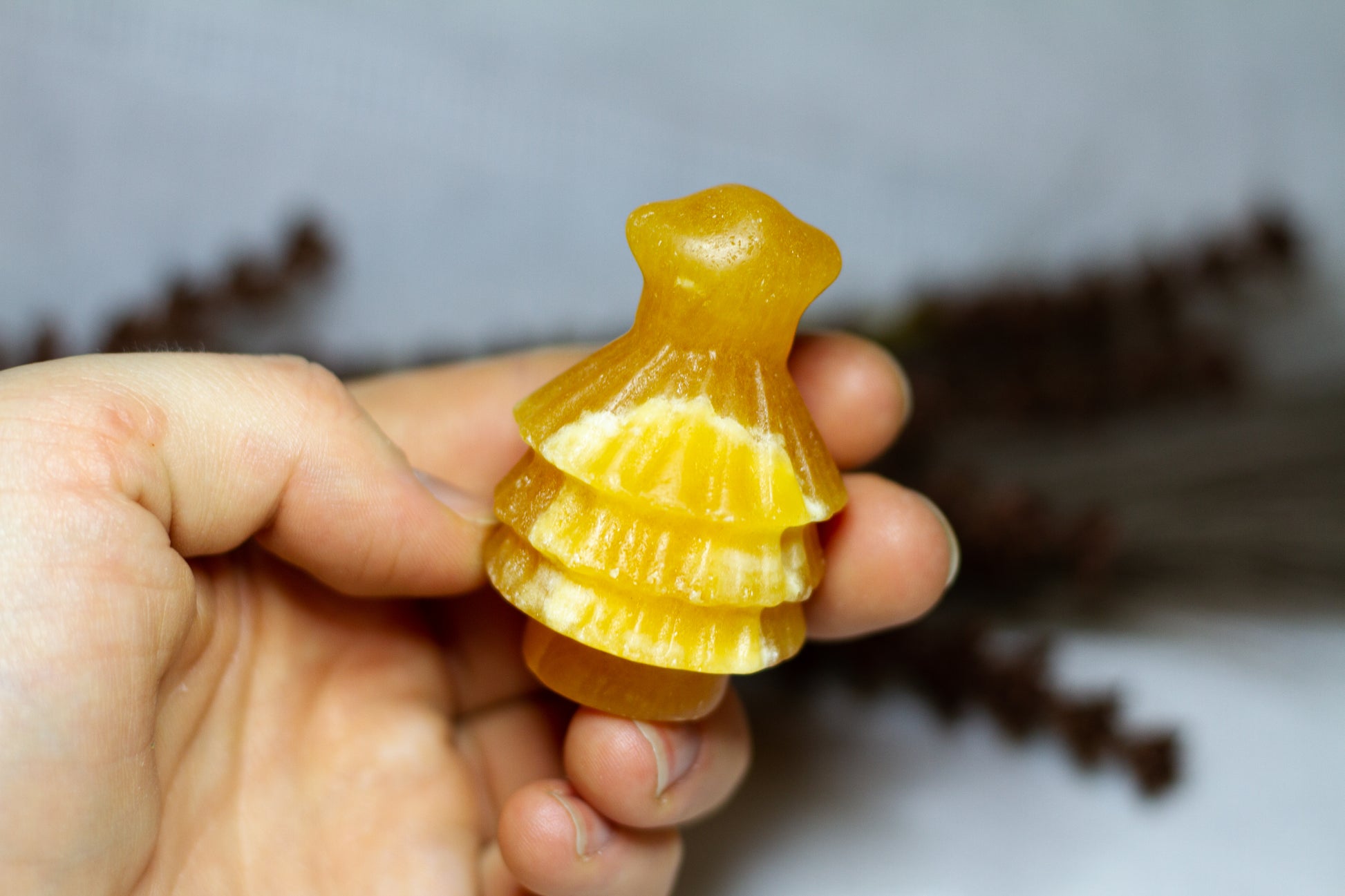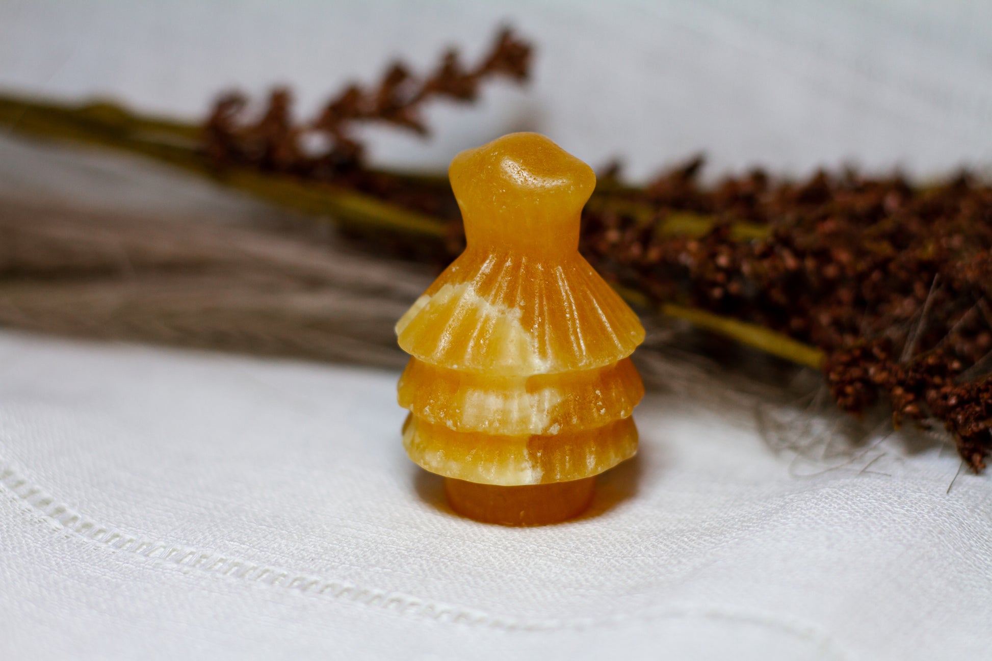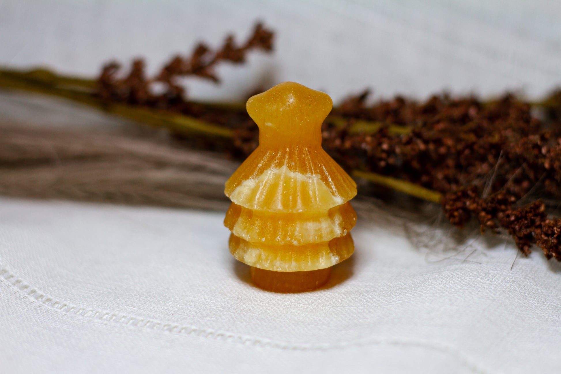 HÀr har vi en riktigt stor, juicy och skimrande julgran, i kristallen orange kalcit. Julgranen skiner massvis tillsammans med sitt fina bandade mönster pÄ sidan, vÀger 90g och Àr ca 6cm hög! [Kristallen pÄ bilderna Àr den som sÀljs]