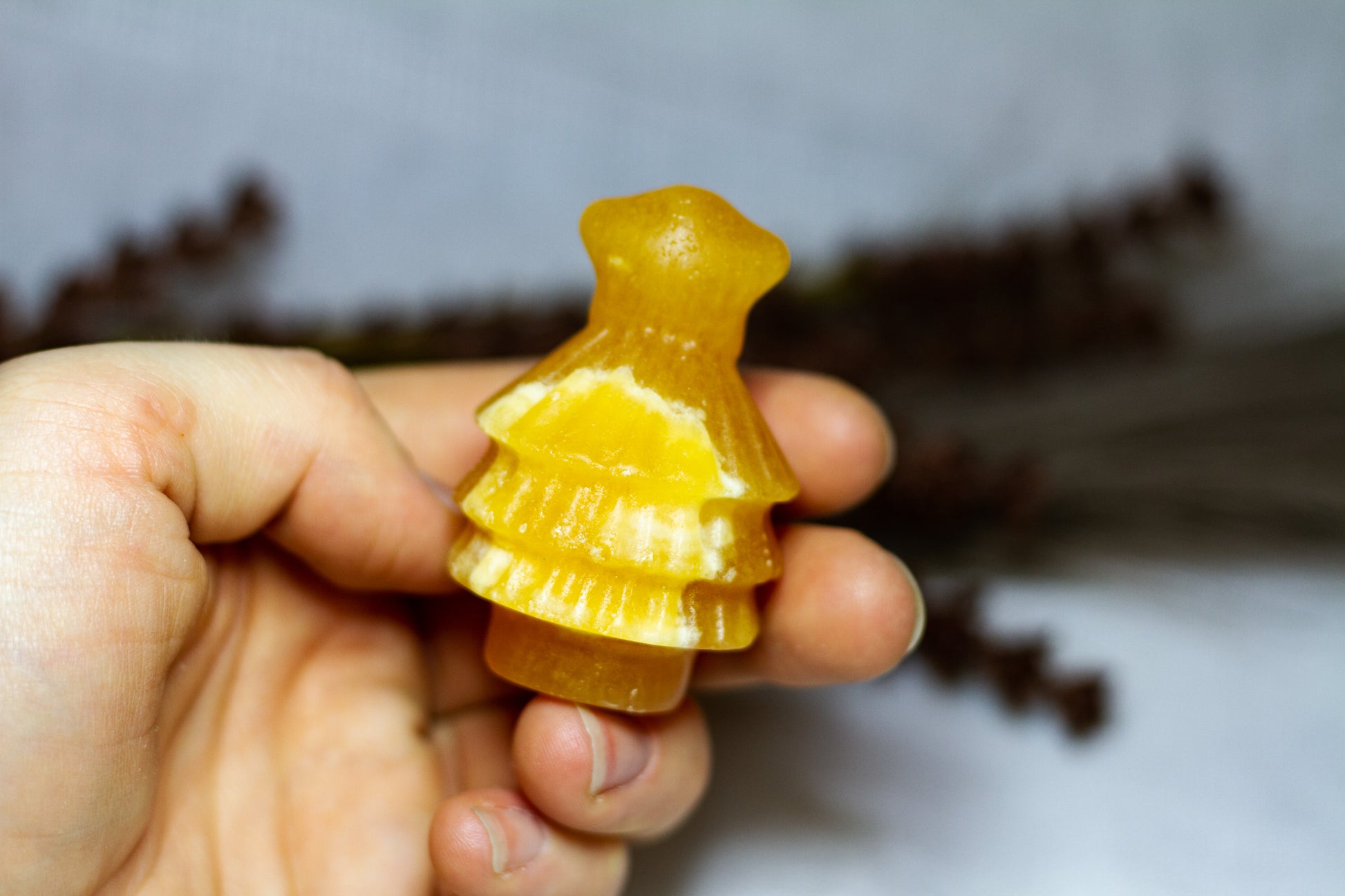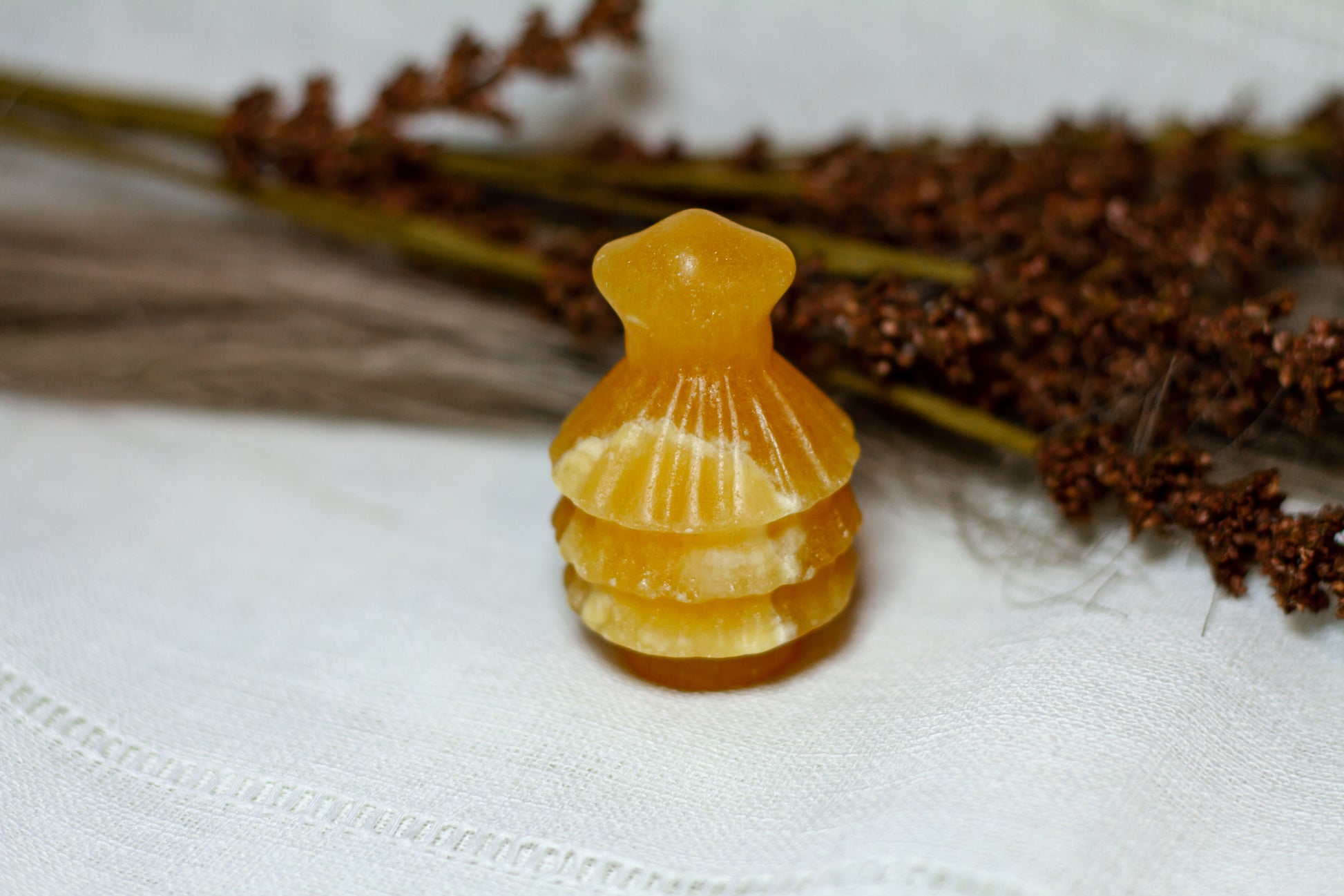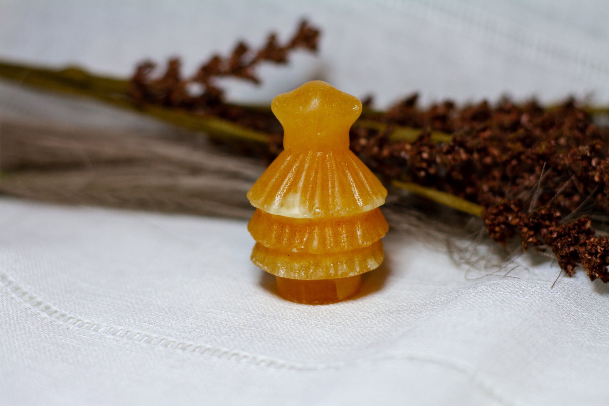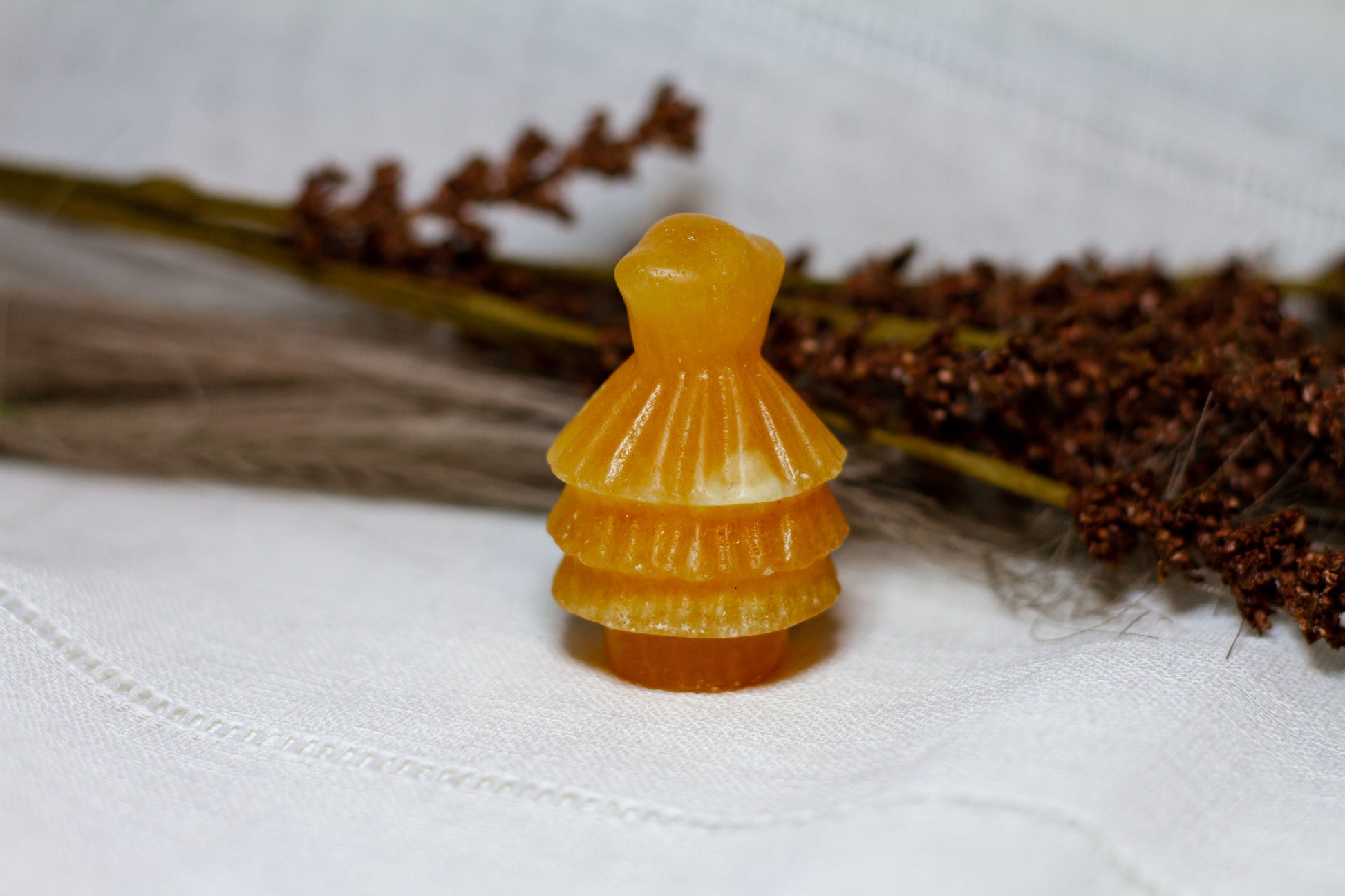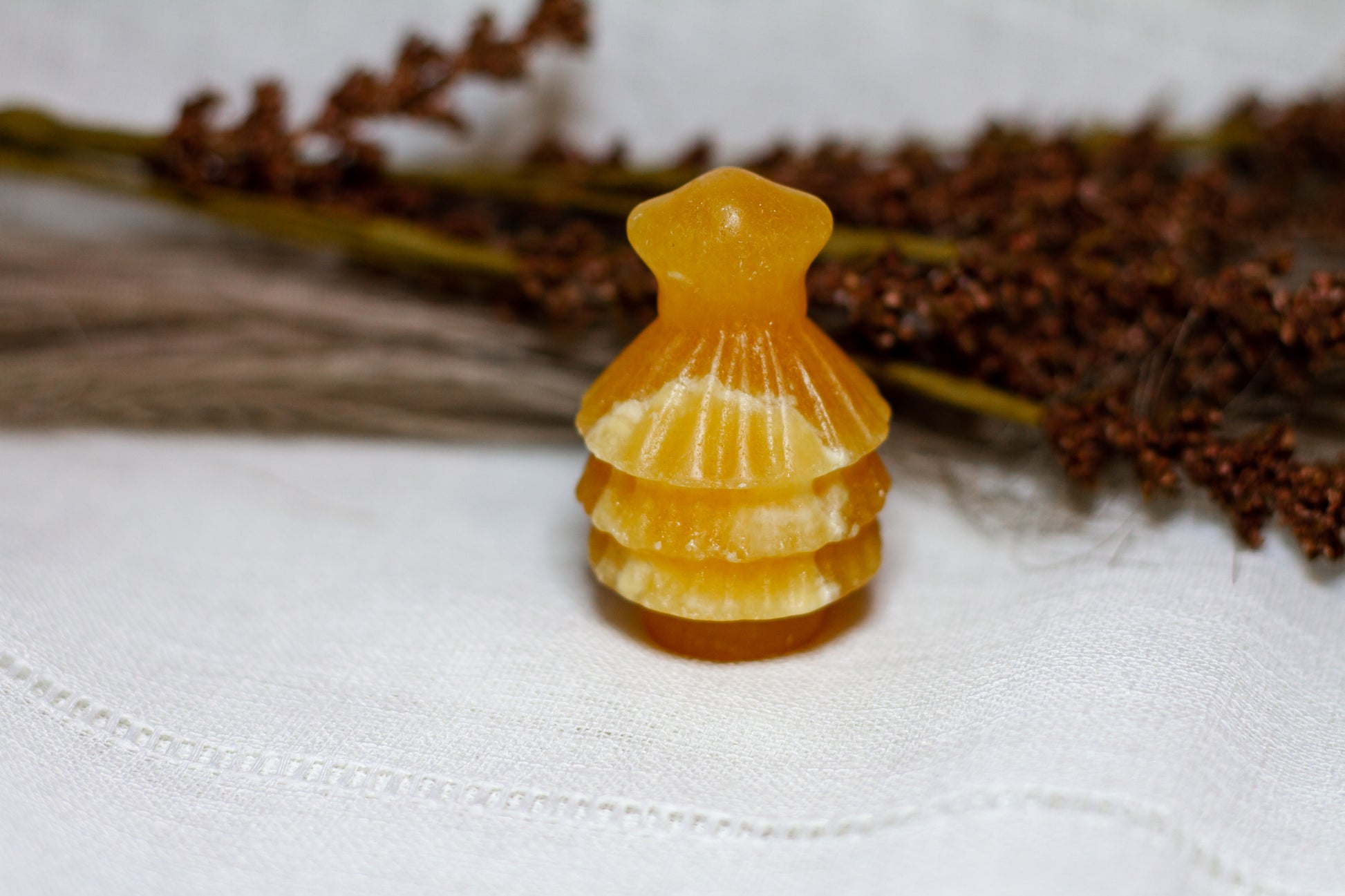 HÀr har vi en riktigt stor, juicy och skimrande julgran, i kristallen orange kalcit. Julgranen skiner massvis tillsammans med sitt fina bandade mönster pÄ sidan, vÀger 90g och Àr ca 6cm hög! [Kristallen pÄ bilderna Àr den som sÀljs]