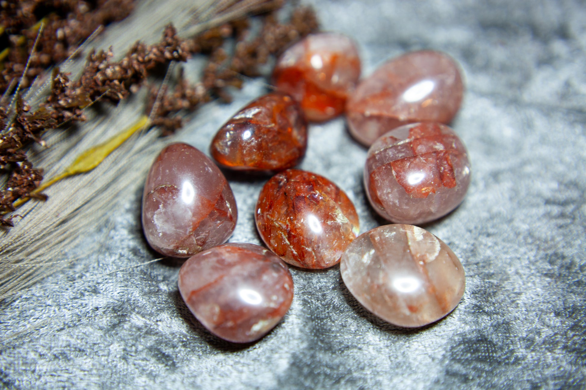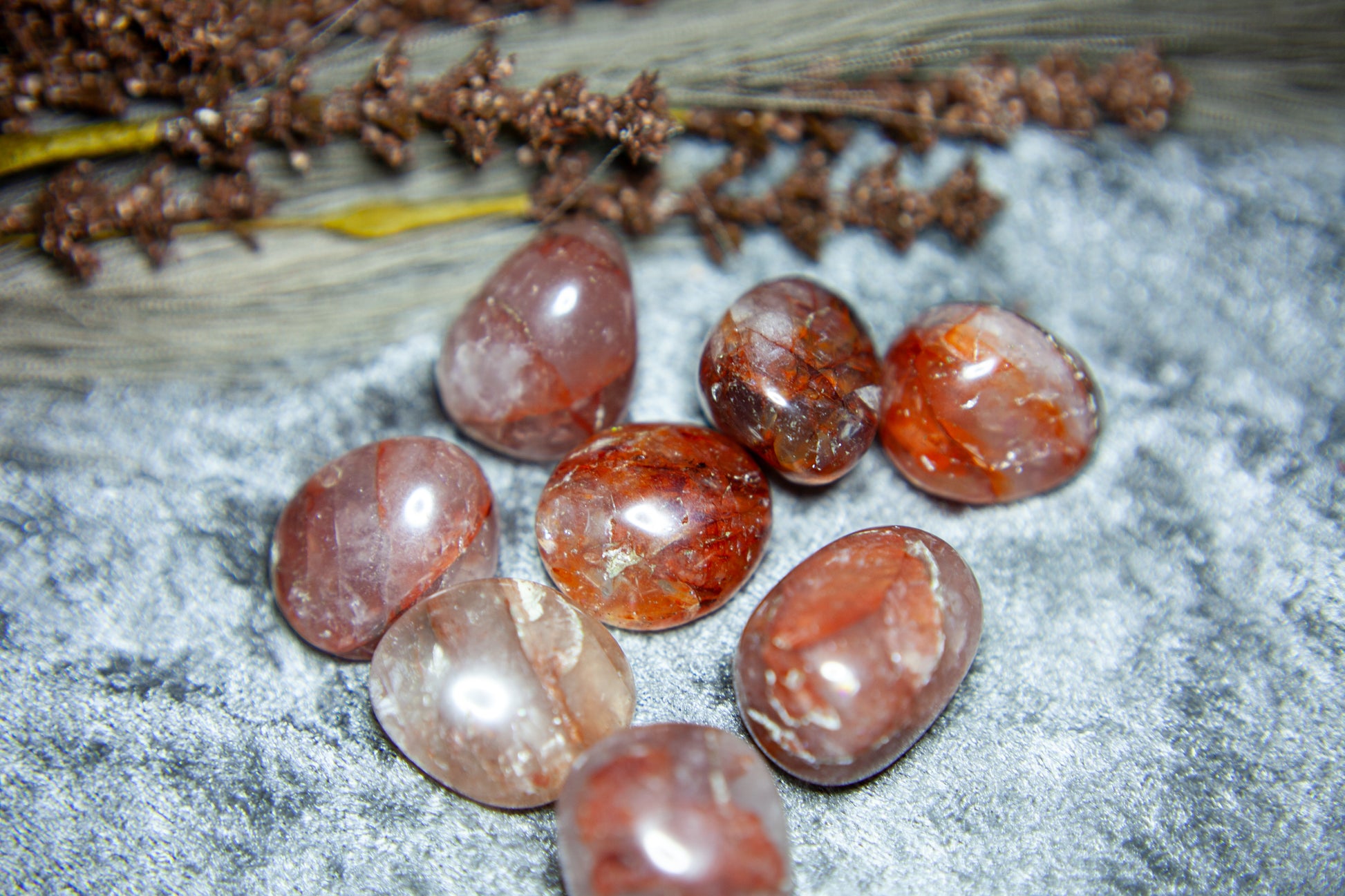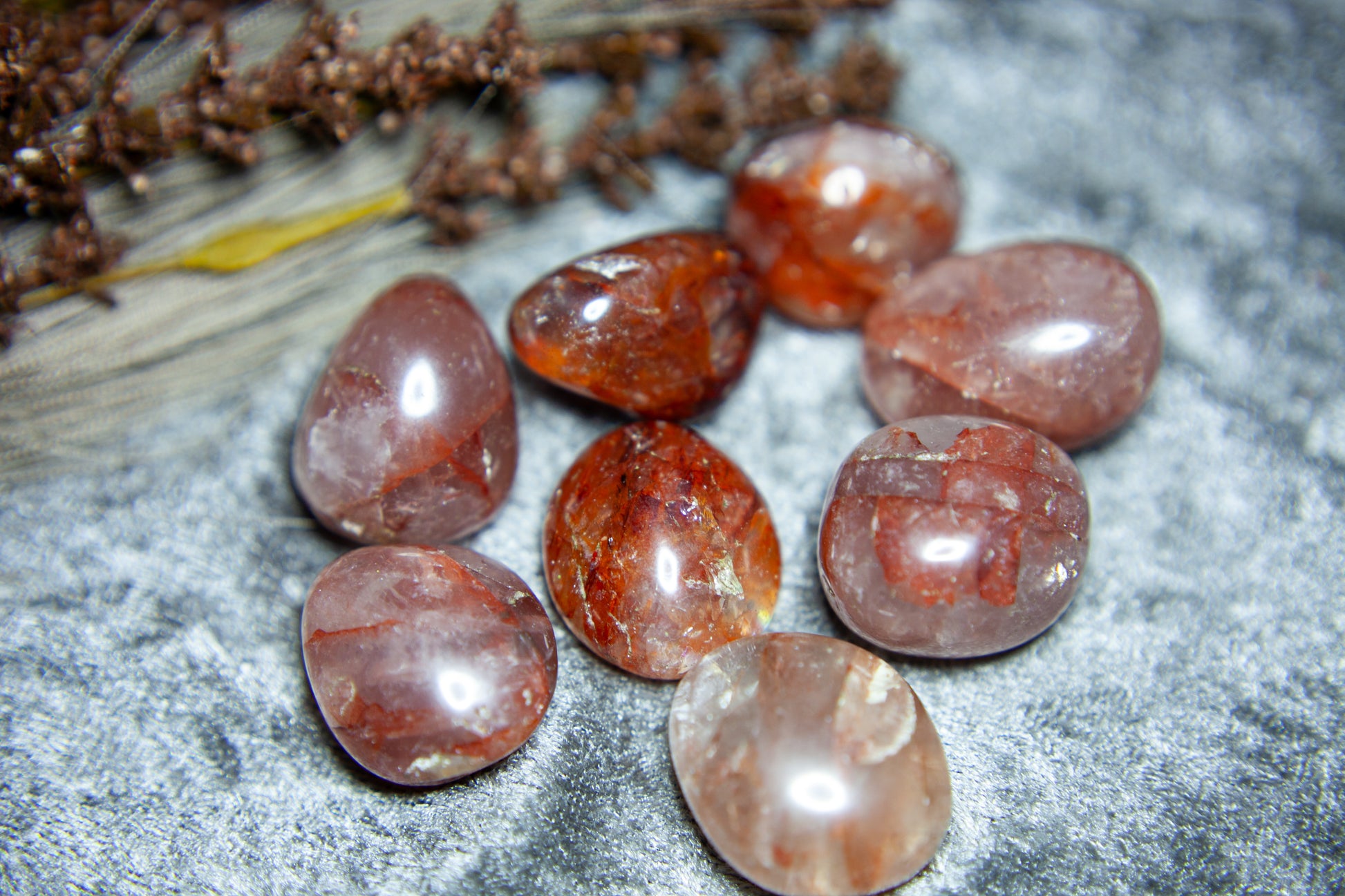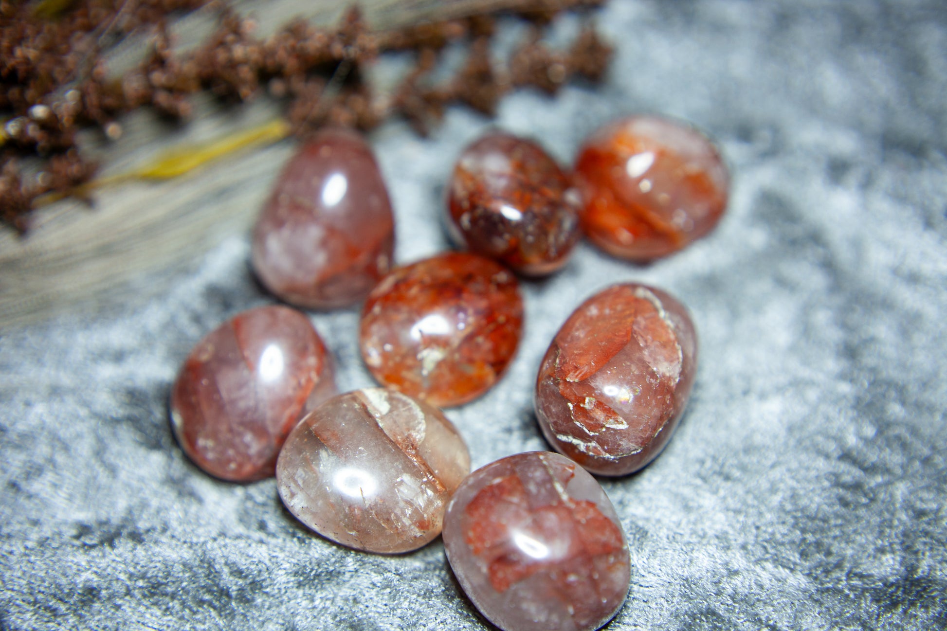 Otroligt flashy, skimrande, färgglada, eldiga och juicy trumlade kristaller i röd golden healer, även kallad eldkvarts eller hematoid/hematoidkvarts!