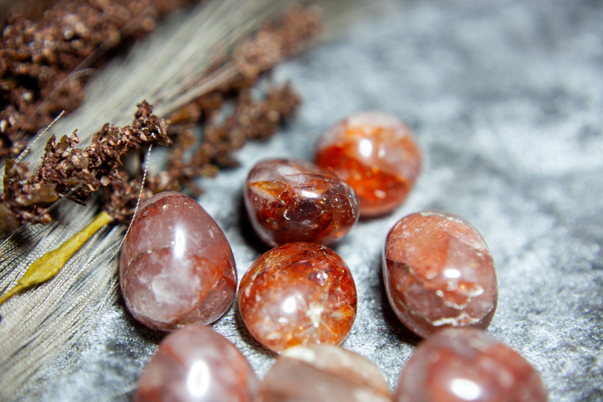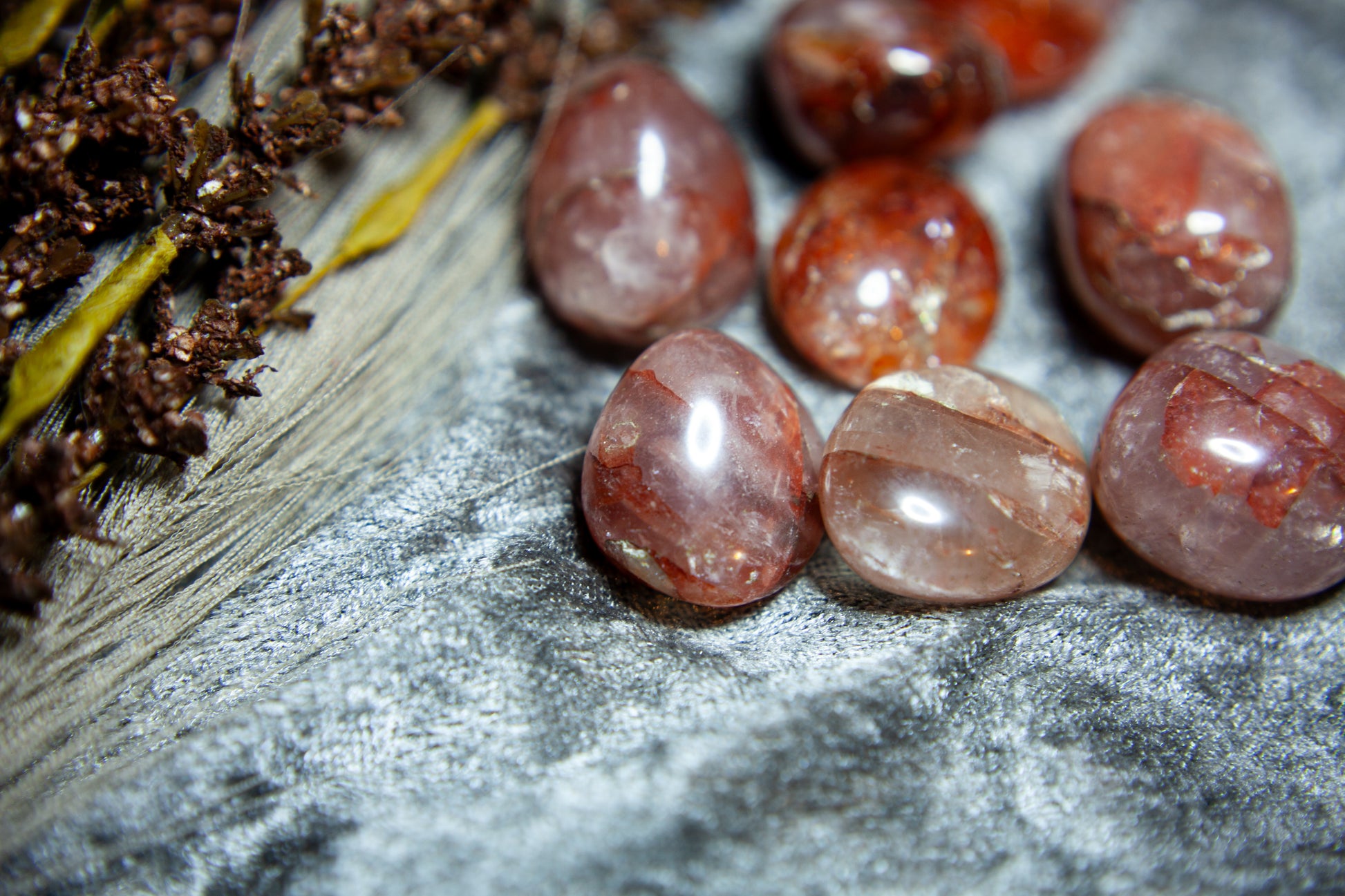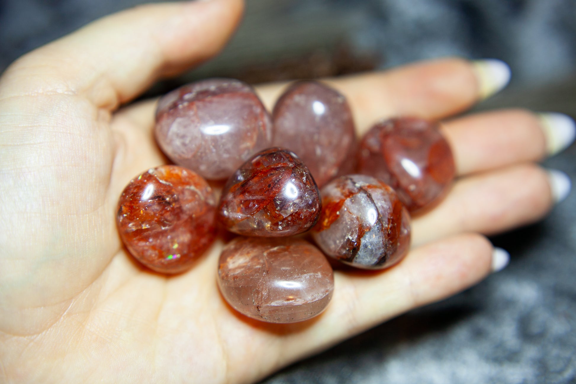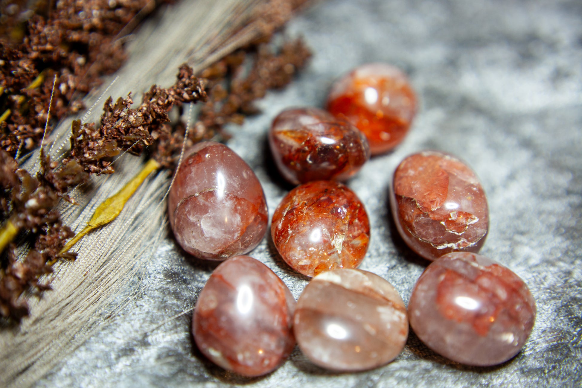 Otroligt flashy, skimrande, färgglada, eldiga och juicy trumlade kristaller i röd golden healer, även kallad eldkvarts eller hematoid/hematoidkvarts!
