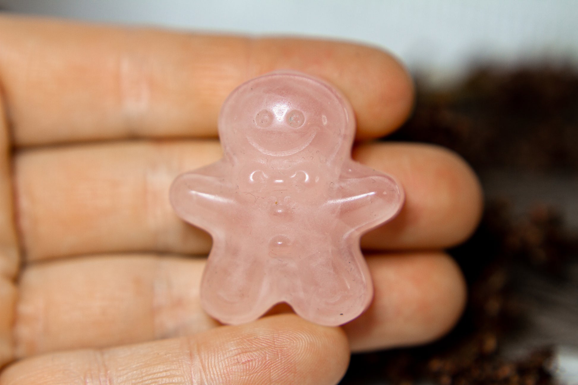 Otroligt gullig, vÀlgjord, varmt rosa och skimrande pepparkaksgubbe i rosenkvarts. Gubben Àr superfin med sitt fina glans och djupa rosenfÀrger, och Àr ca 4cm hög! [Kristallen pÄ bilderna Àr den som sÀljs]