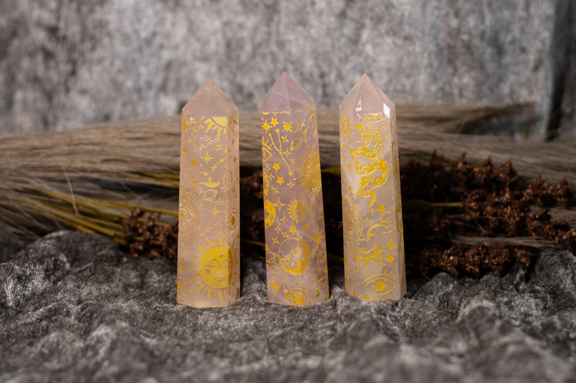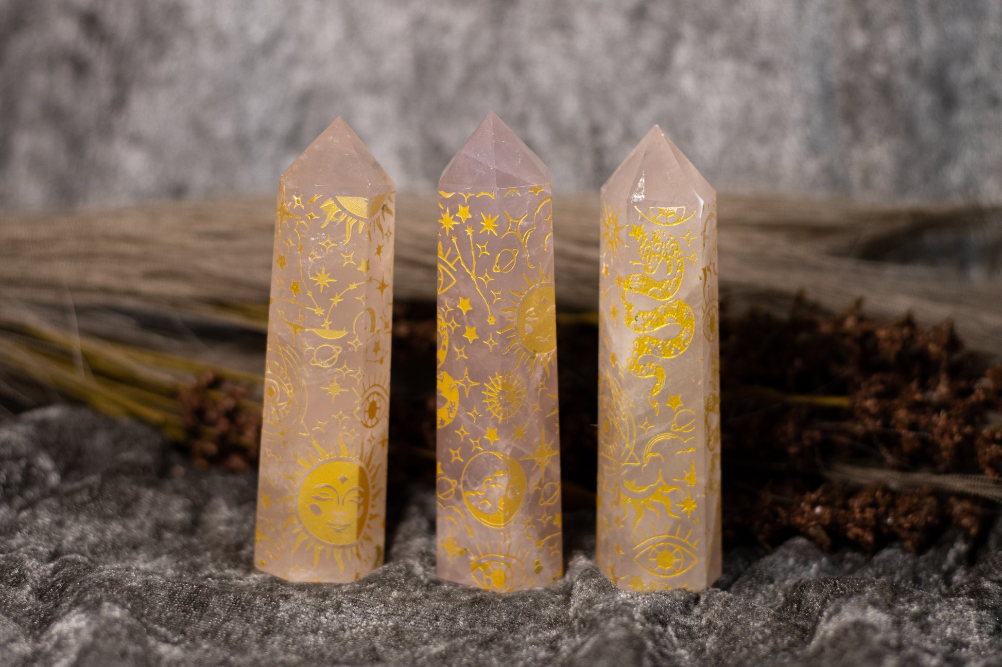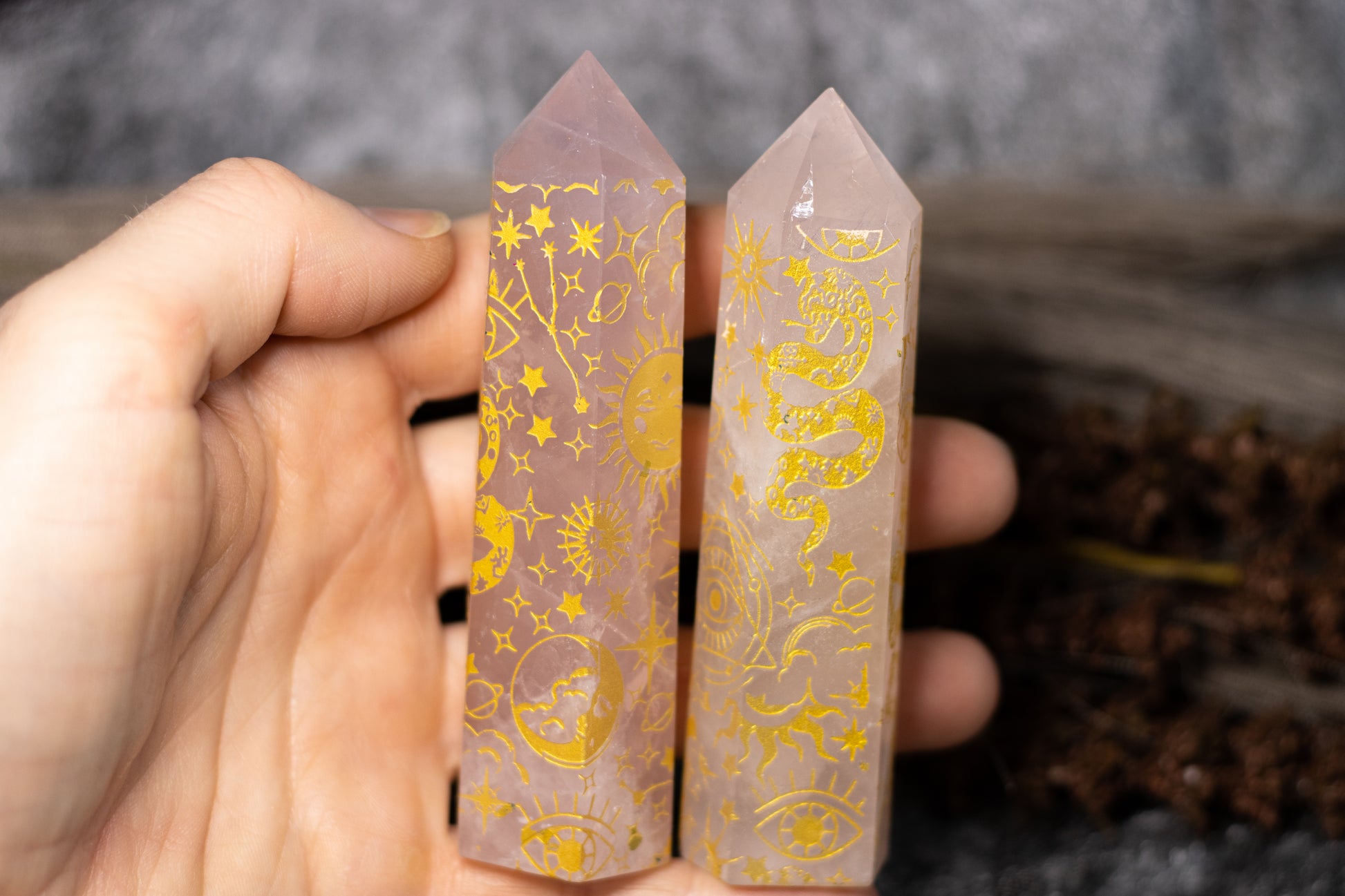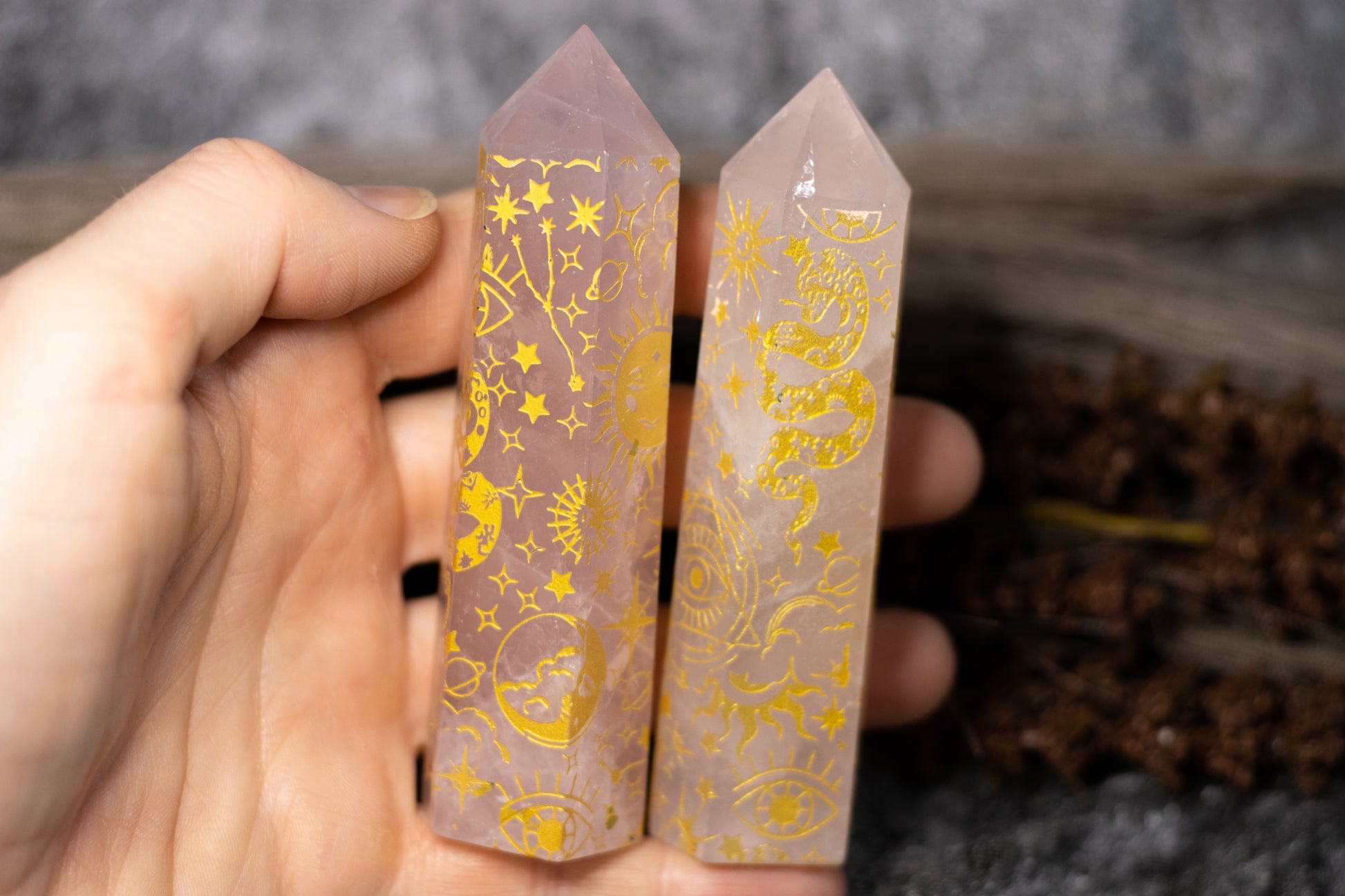 Jättefina rosenkvartsspetsar med guldmönster runt hela spetsen. Föreställande spirituella ting bland annat solen, månen, stjärnor, evil eye med mera.