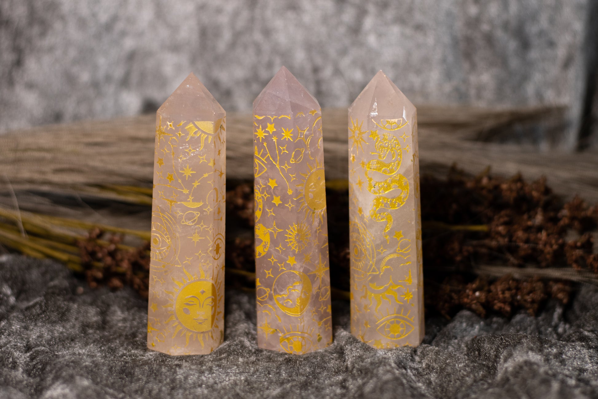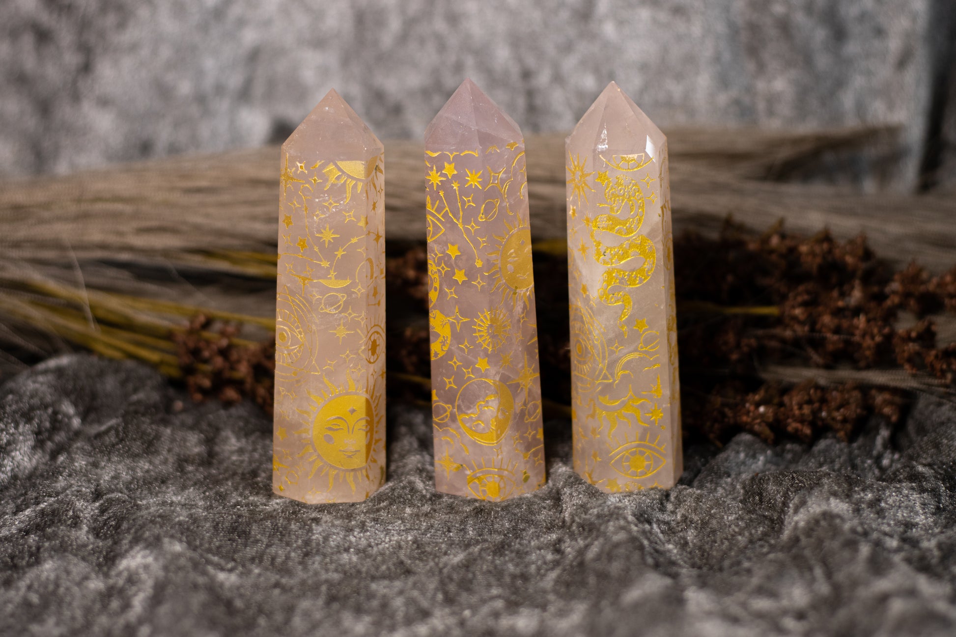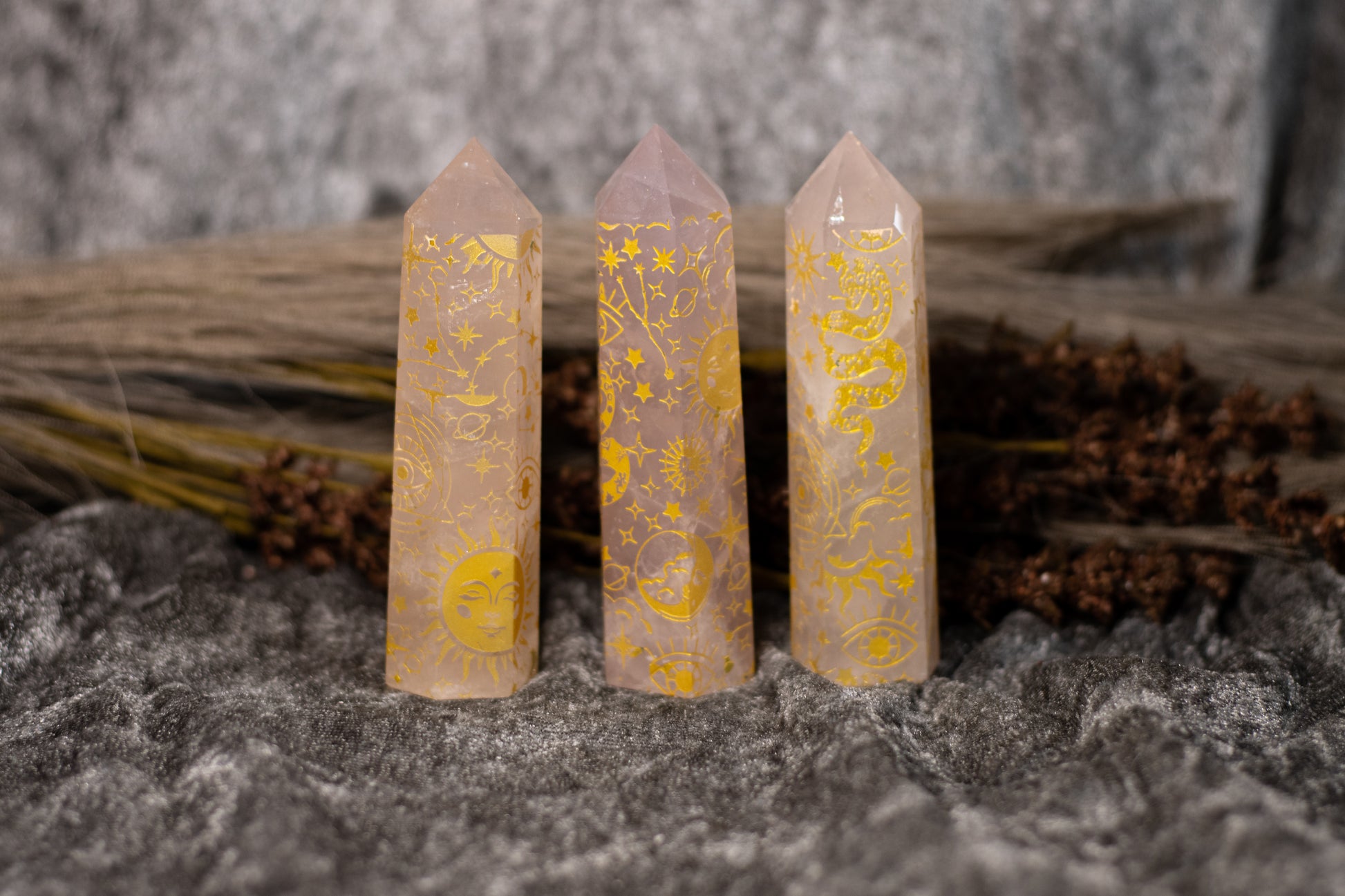 Jättefina rosenkvartsspetsar med guldmönster runt hela spetsen. Föreställande spirituella ting bland annat solen, månen, stjärnor, evil eye med mera.