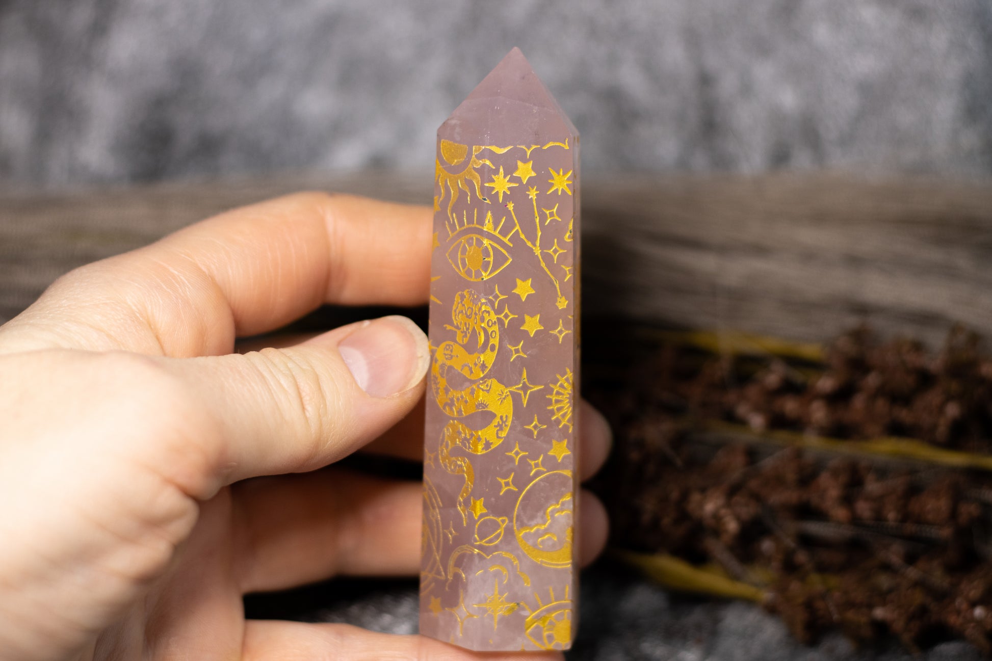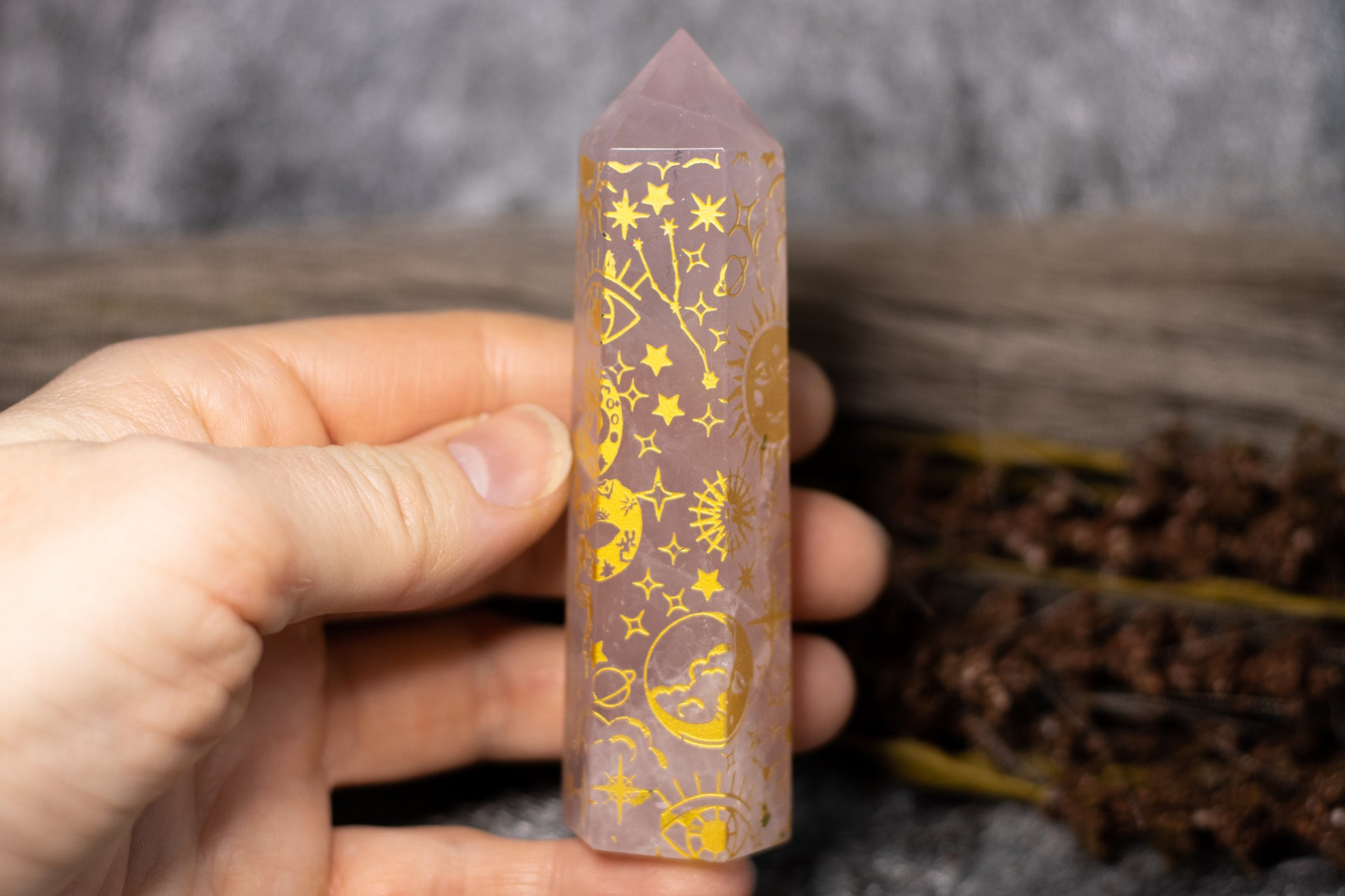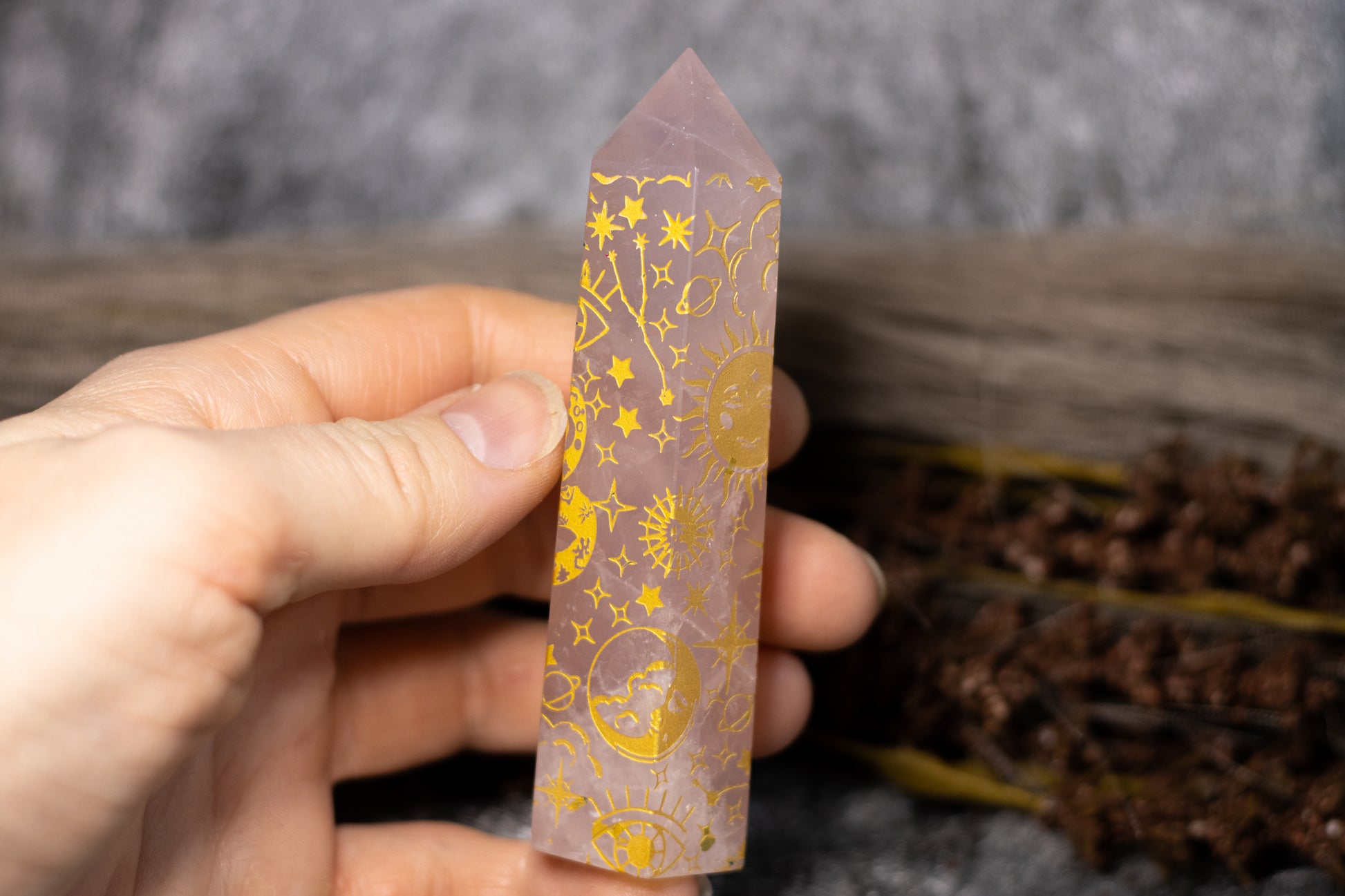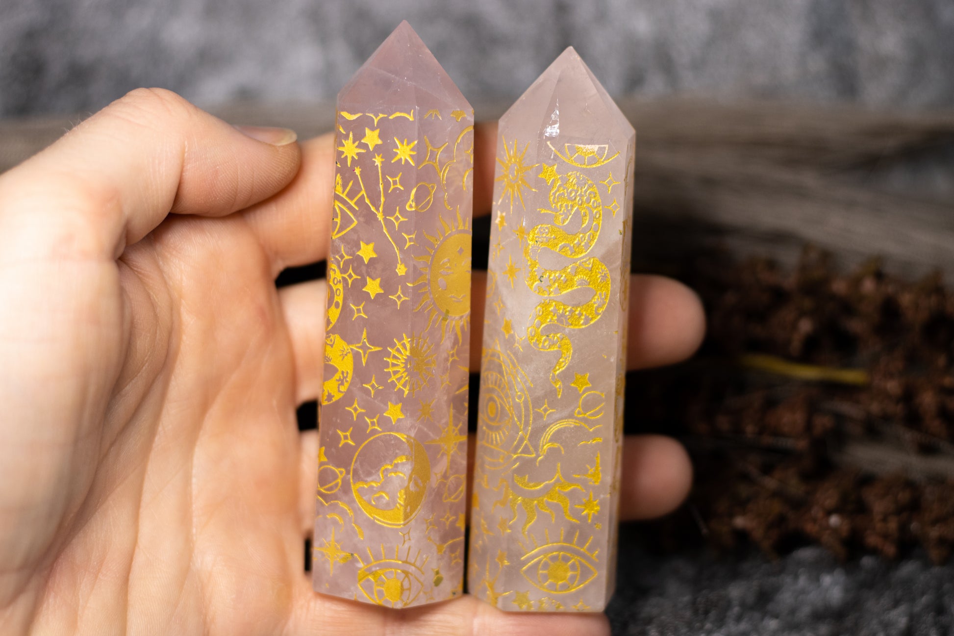 Jättefina rosenkvartsspetsar med guldmönster runt hela spetsen. Föreställande spirituella ting bland annat solen, månen, stjärnor, evil eye med mera.