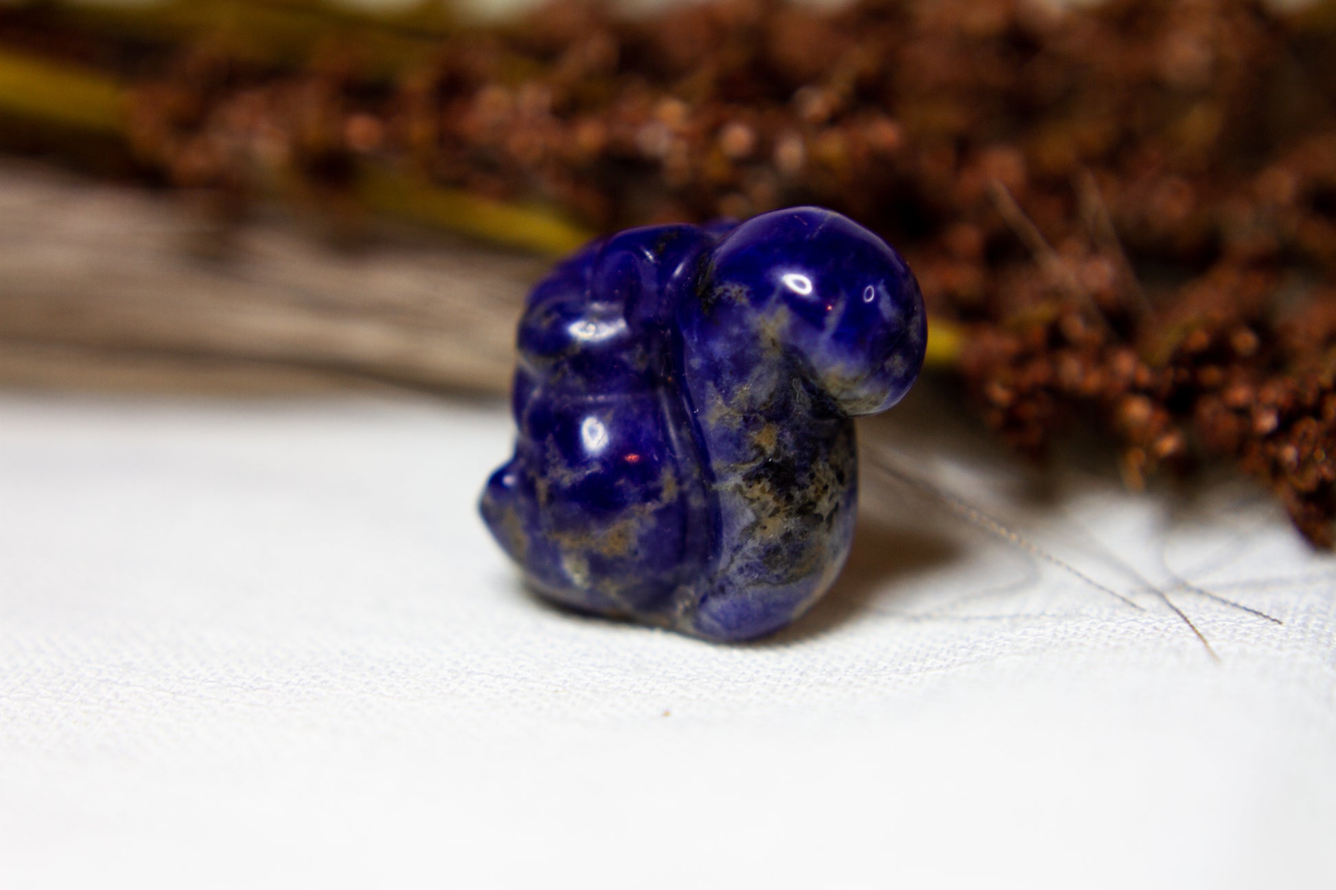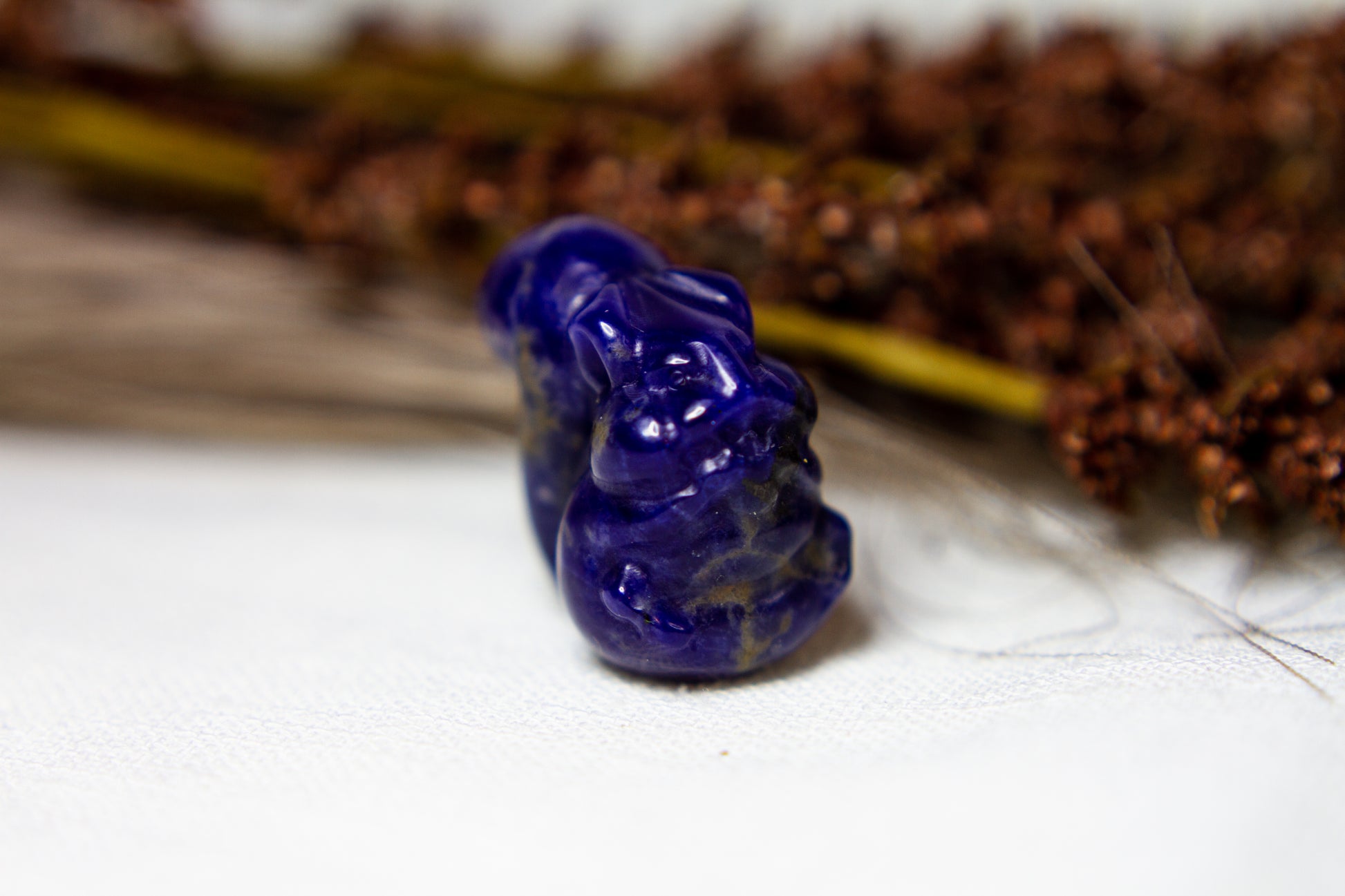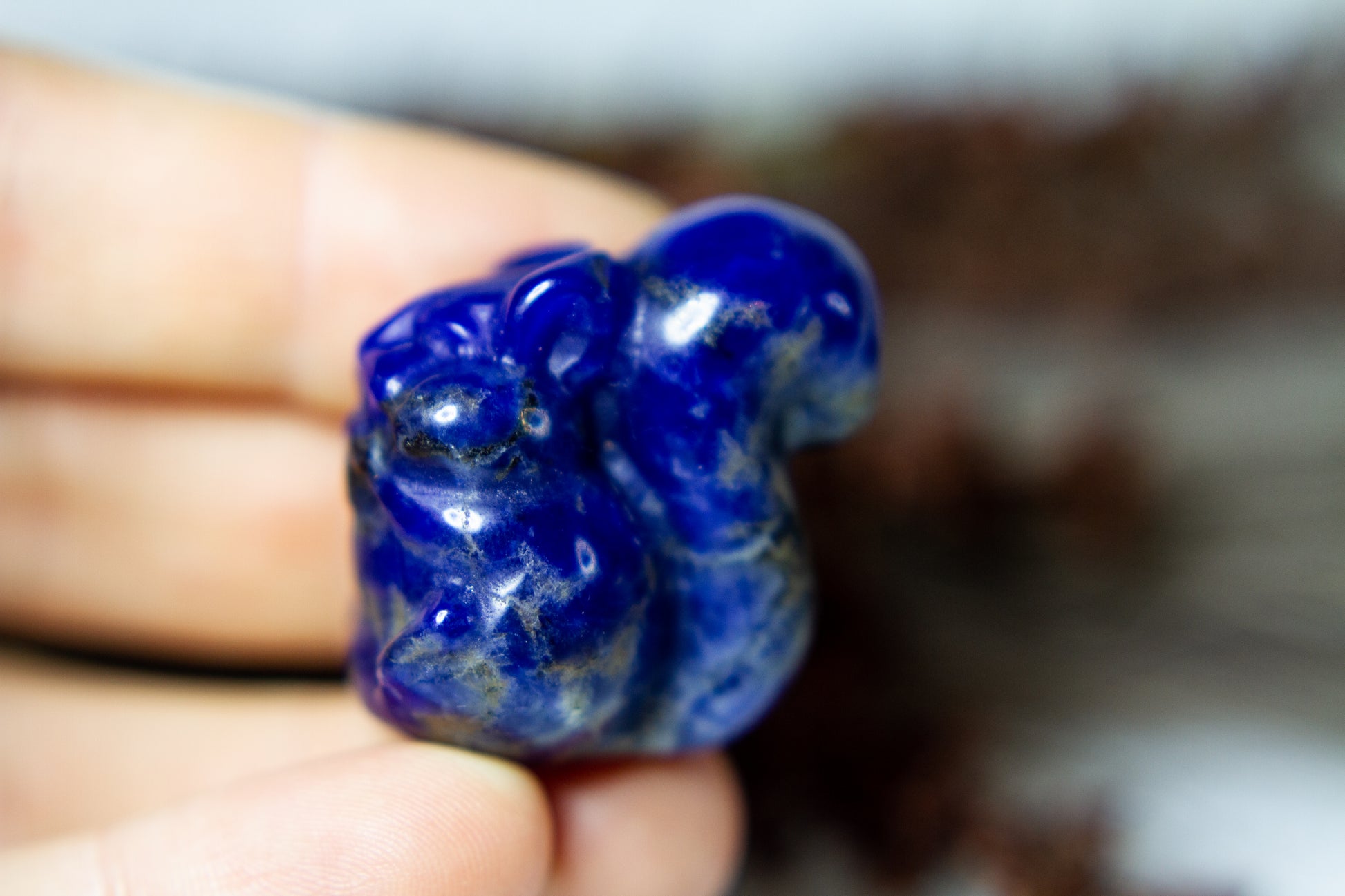 HÀr har vi en fantastiskt söt, fÀrgsprakande och mjuk ekorre i kristallen sodalit, den lugnande kristallen. Ekorren nÀstan lyser upp i sin vackra blÄ fÀrg med andra smÄ fÀrginklusioner, och den Àr ca 3,2cm hög! [Kristallen pÄ bilderna Àr den som sÀljs]