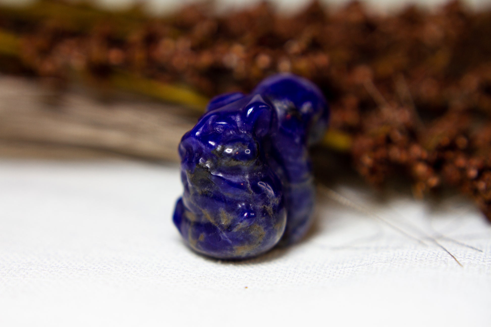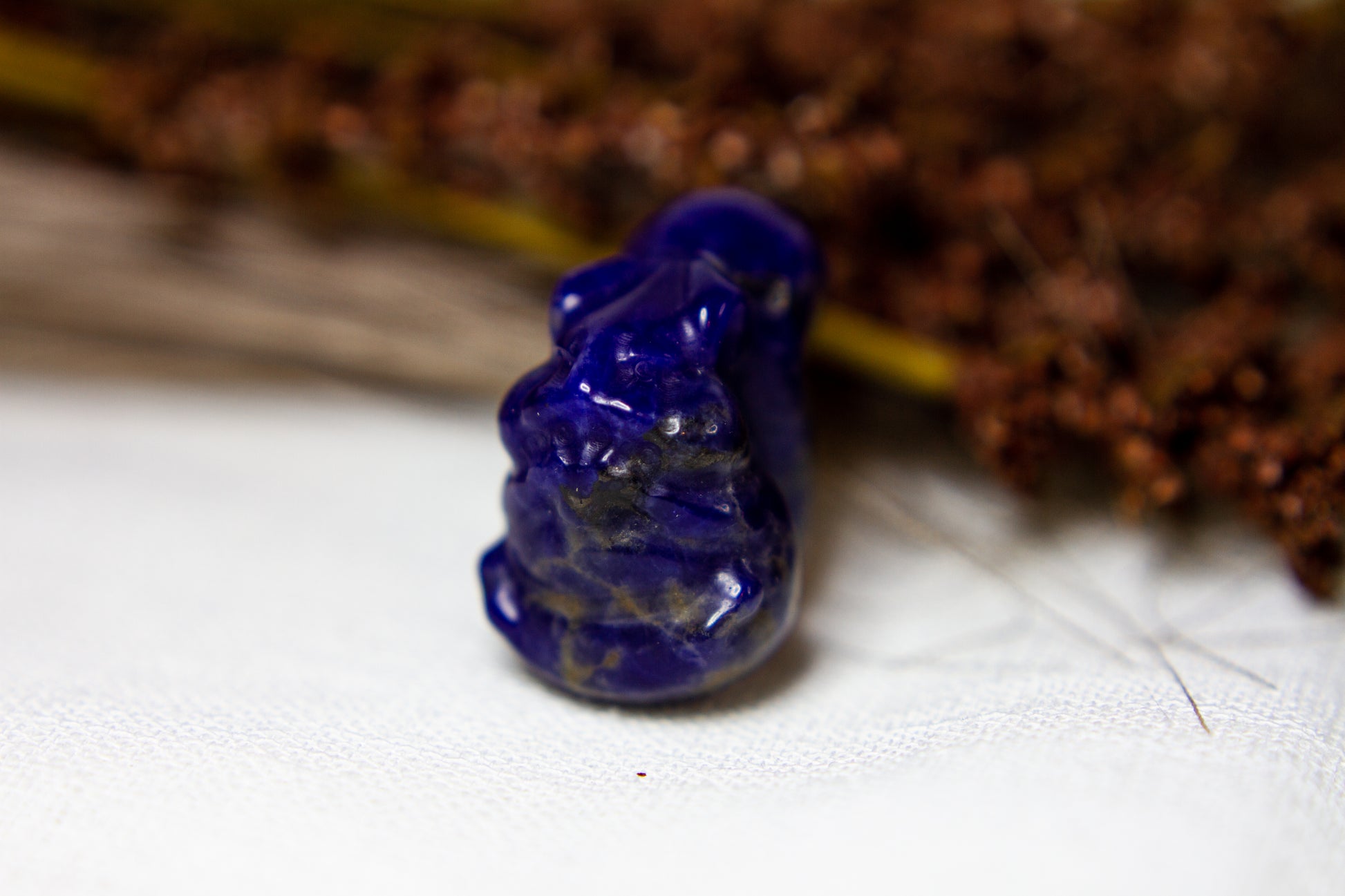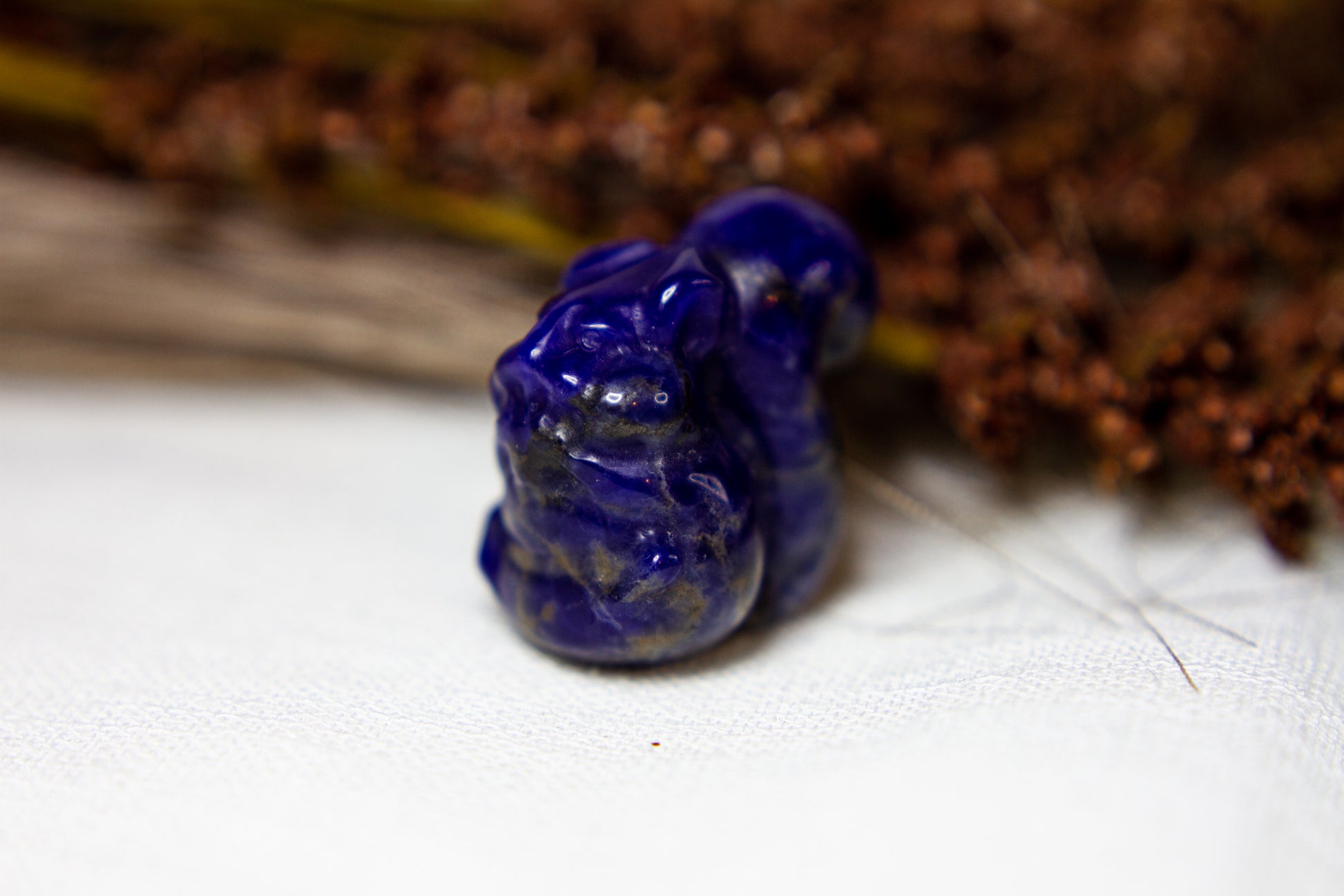 HÀr har vi en fantastiskt söt, fÀrgsprakande och mjuk ekorre i kristallen sodalit, den lugnande kristallen. Ekorren nÀstan lyser upp i sin vackra blÄ fÀrg med andra smÄ fÀrginklusioner, och den Àr ca 3,2cm hög! [Kristallen pÄ bilderna Àr den som sÀljs]
